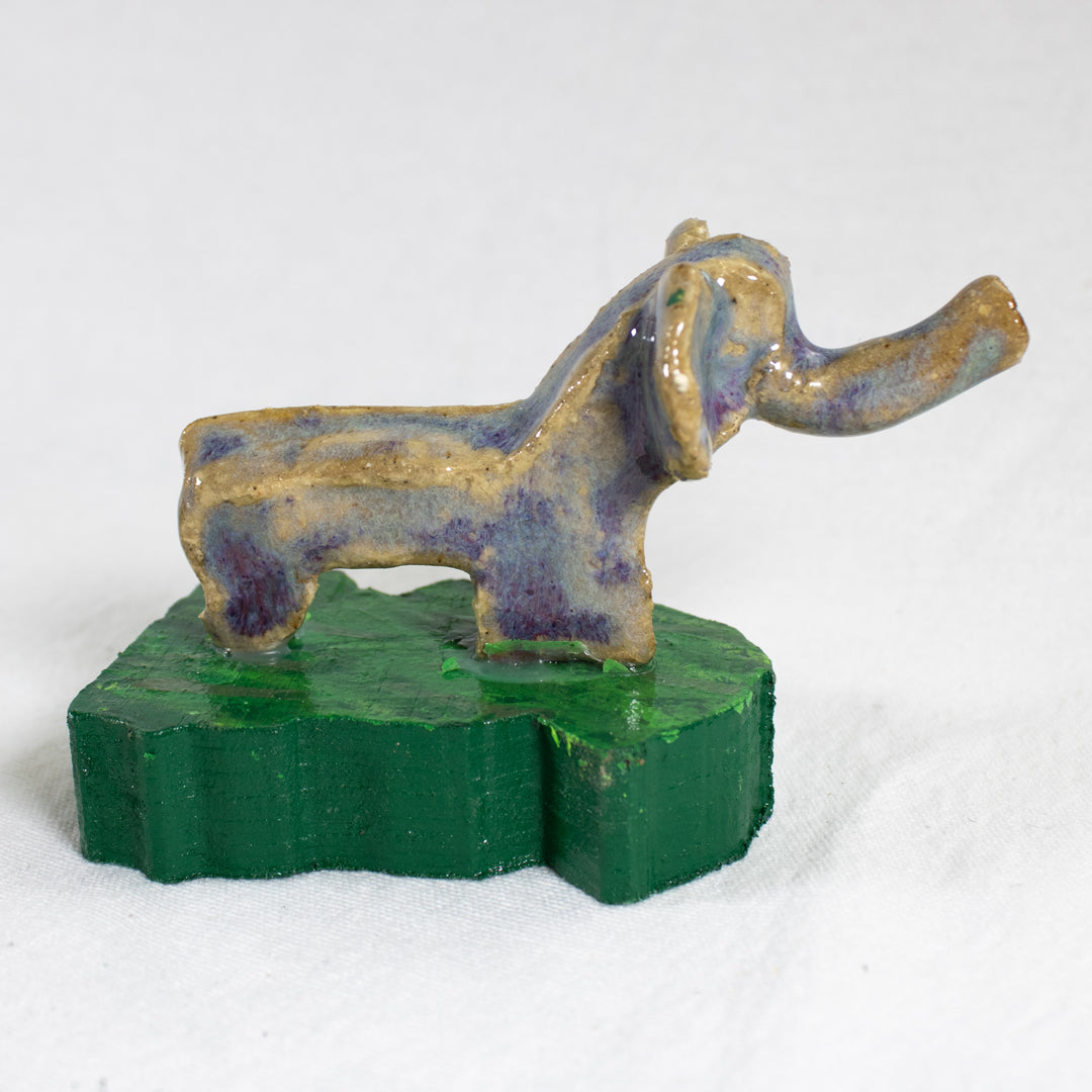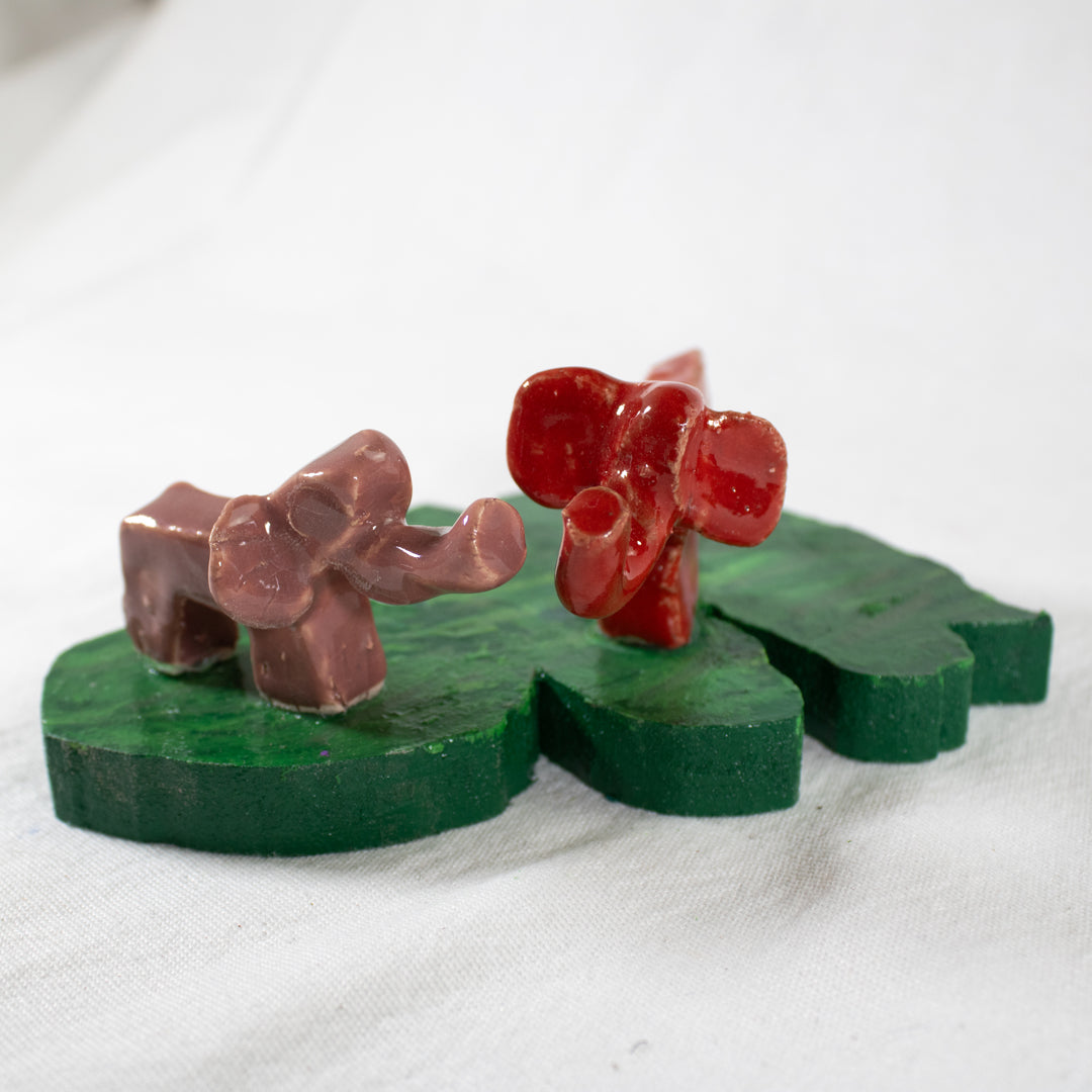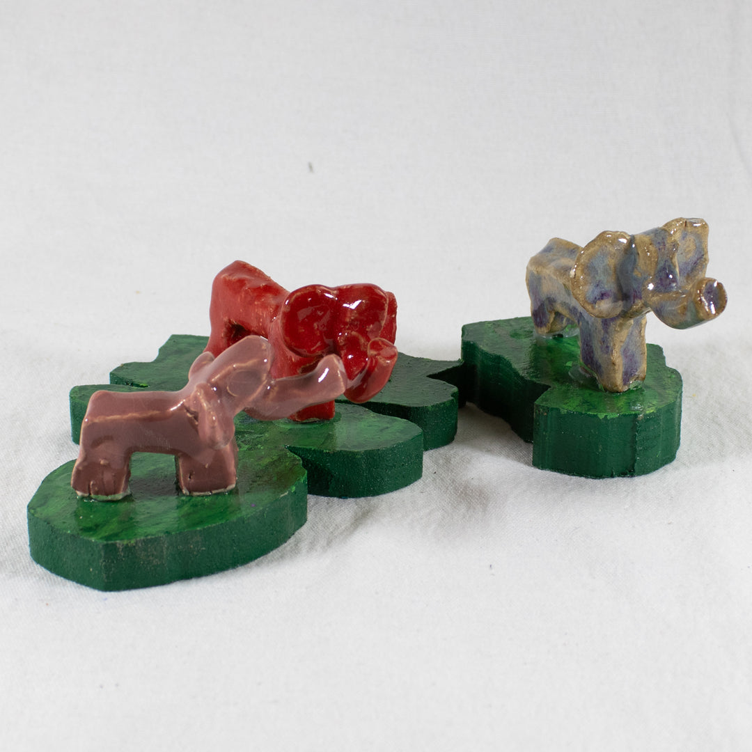 In "3 Elephants," Rahil begins by drawing animals in his unique abstracted style, then cuts these shapes out of clay before adding details like eyes and ears. He enjoys using large, quick brush strokes to apply bold glaze colors to his animals. For this piece, Rahil also incorporated mixed media elements, using acrylic paint and oil pastels on the base, bringing his whimsical illustrations to life and offering a glimpse into his imaginative world.