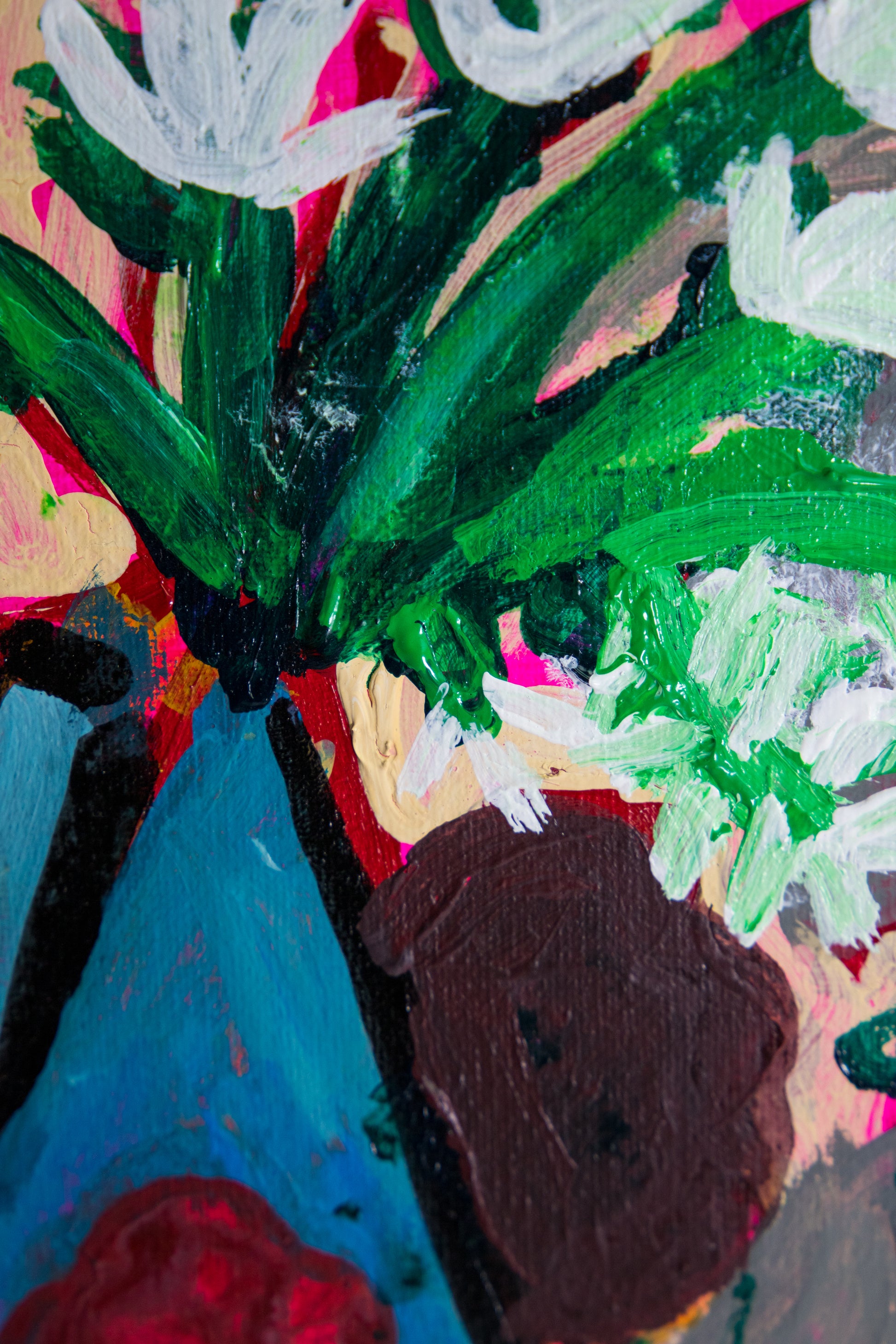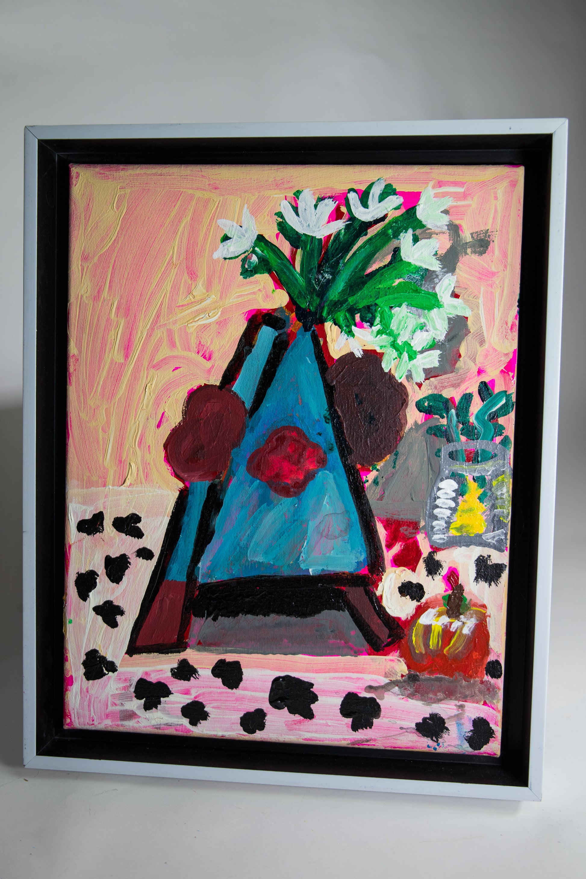 Add a touch of modern art to your home with 3D Triangle and Apple, a vibrant still life painting by artist Andrew Lipsitt. This acrylic piece, created during Soul Studio's Acrylic Painting workshop, beautifully captures a handcrafted ceramic vase and bold floral arrangement on a unique cow spotted tablecloth. Elevate your space with bright colors and a touch of funk.