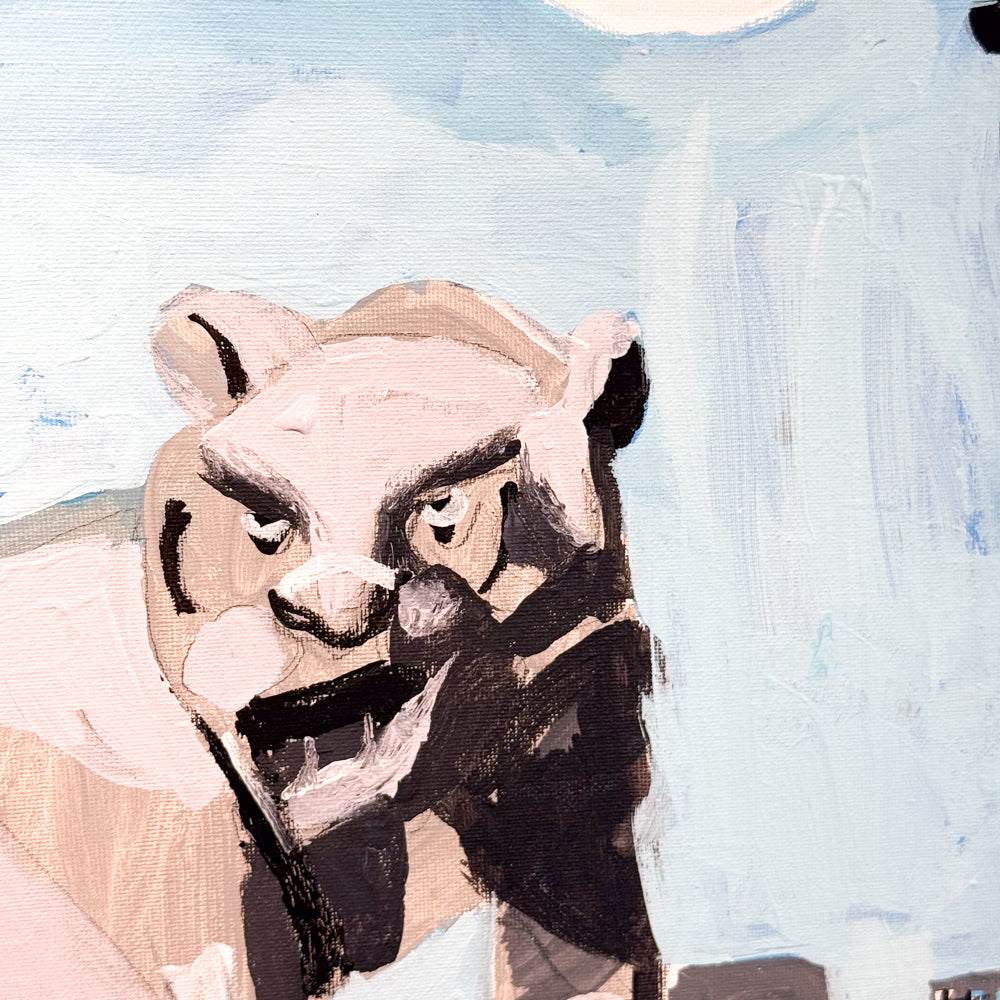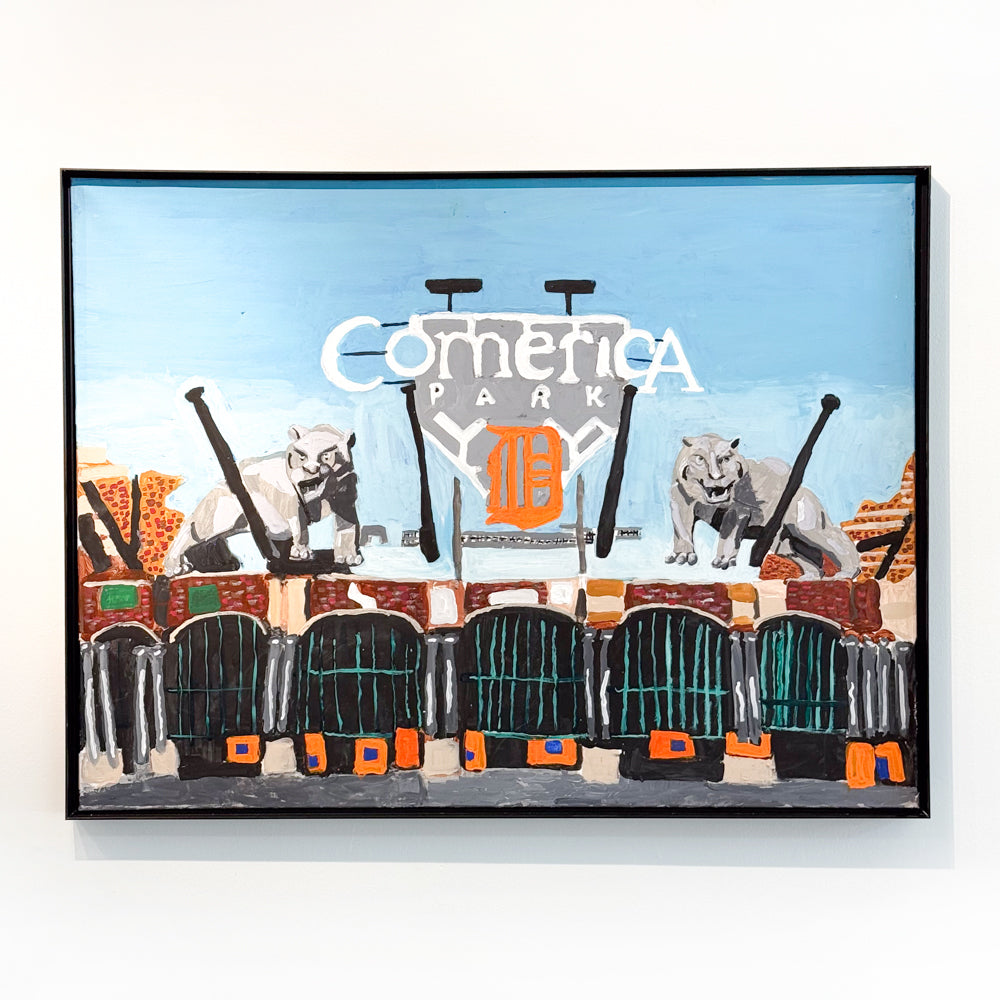 This bold and vibrant painting by Andrew Lipssitt captures the iconic entrance of Detroit’s beloved Comerica Park. With playful brushstrokes and a rich palette of blues, oranges, and earth tones, the piece brings to life the excitement of a Tigers game day. The fierce stone tigers, towering bats, and signature signage are depicted with character and charm, celebrating both the energy of the ballpark and the spirit of the city.