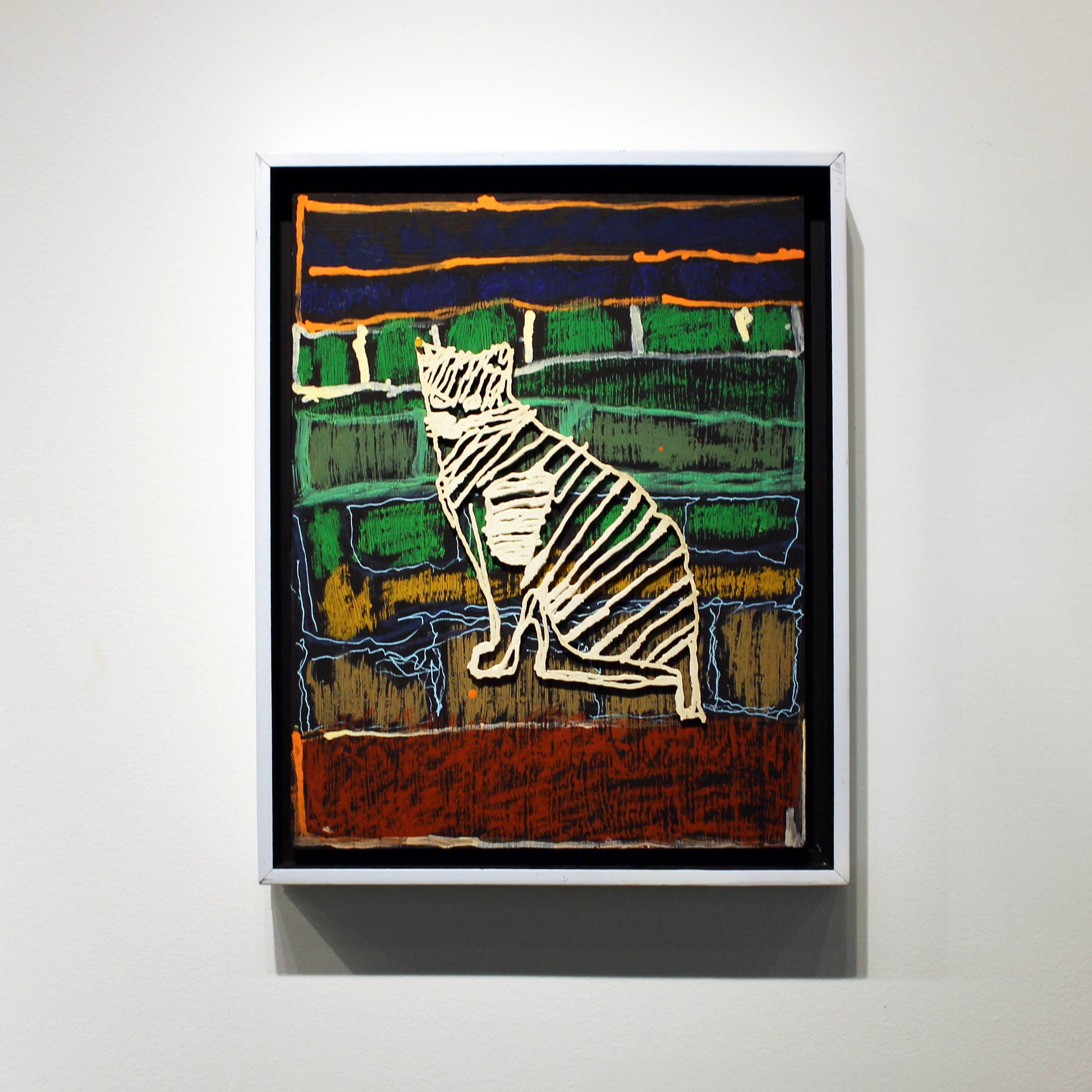 "A. Fun." by Michael Gannan is a captivating multimedia artwork featuring a cat's silhouette against a vibrant, textured background. Using carefully chosen materials and techniques, Michael blends different textures and colors to create depth and visual interest, with the cat outlined in striking white thread-like material.