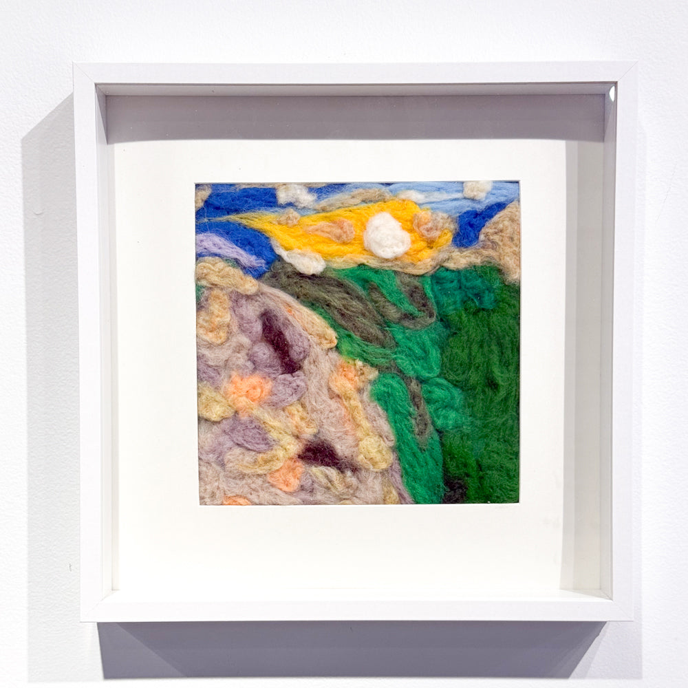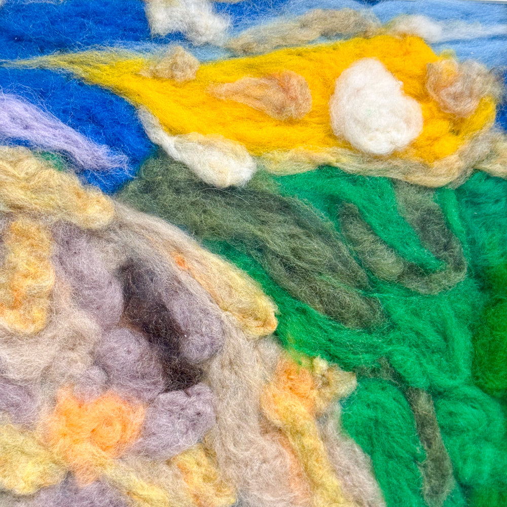 A Walk on the Beach by Sheryl Garfinkel is a soft and colorful felted artwork that shows a peaceful beach scene. With warm sand, green hills, and a bright sky, it feels like a sunny day by the water. The fluffy clouds and gentle textures make it look cozy and calm—just like taking a relaxing walk along the shore.