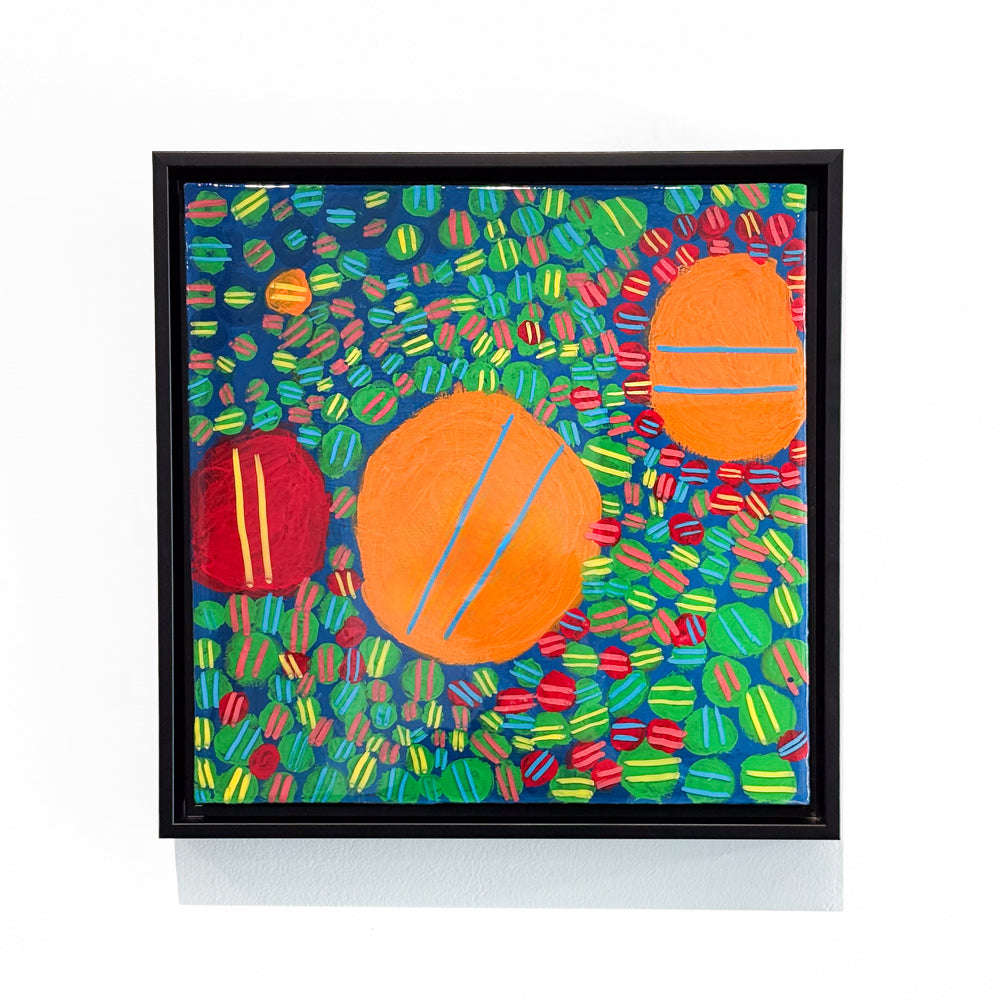 Abstract on Lily Pads by Megan Donley is a bright and playful artwork filled with bold colors and floating shapes. Large orange circles drift across a background of small red, green, yellow, and blue dots that look like lively lily pads. Each little shape has colorful stripes, giving the piece a fun, rhythmic feeling. The whole artwork feels energetic and joyful, like a pond full of color and movement.