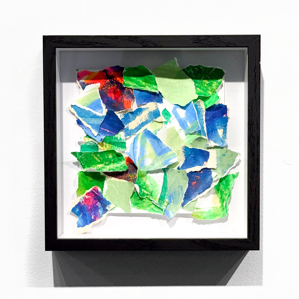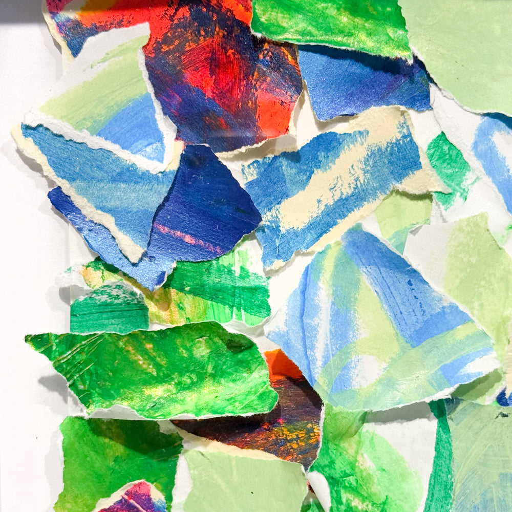 Andromeda Galaxy by Julian Bahoora is a colorful collage made from torn painted paper. The cool tones of green and blue are mixed with pops of bright reds and oranges, creating an abstract pattern that feels like stars and space. The layered shapes give the piece a sense of motion and energy, like a galaxy in action.