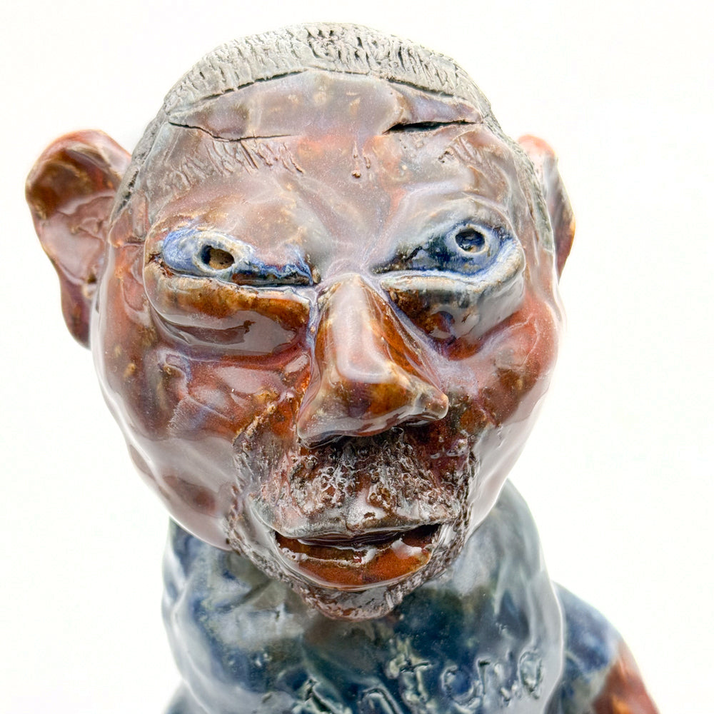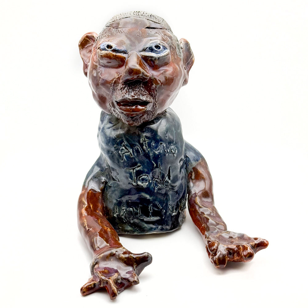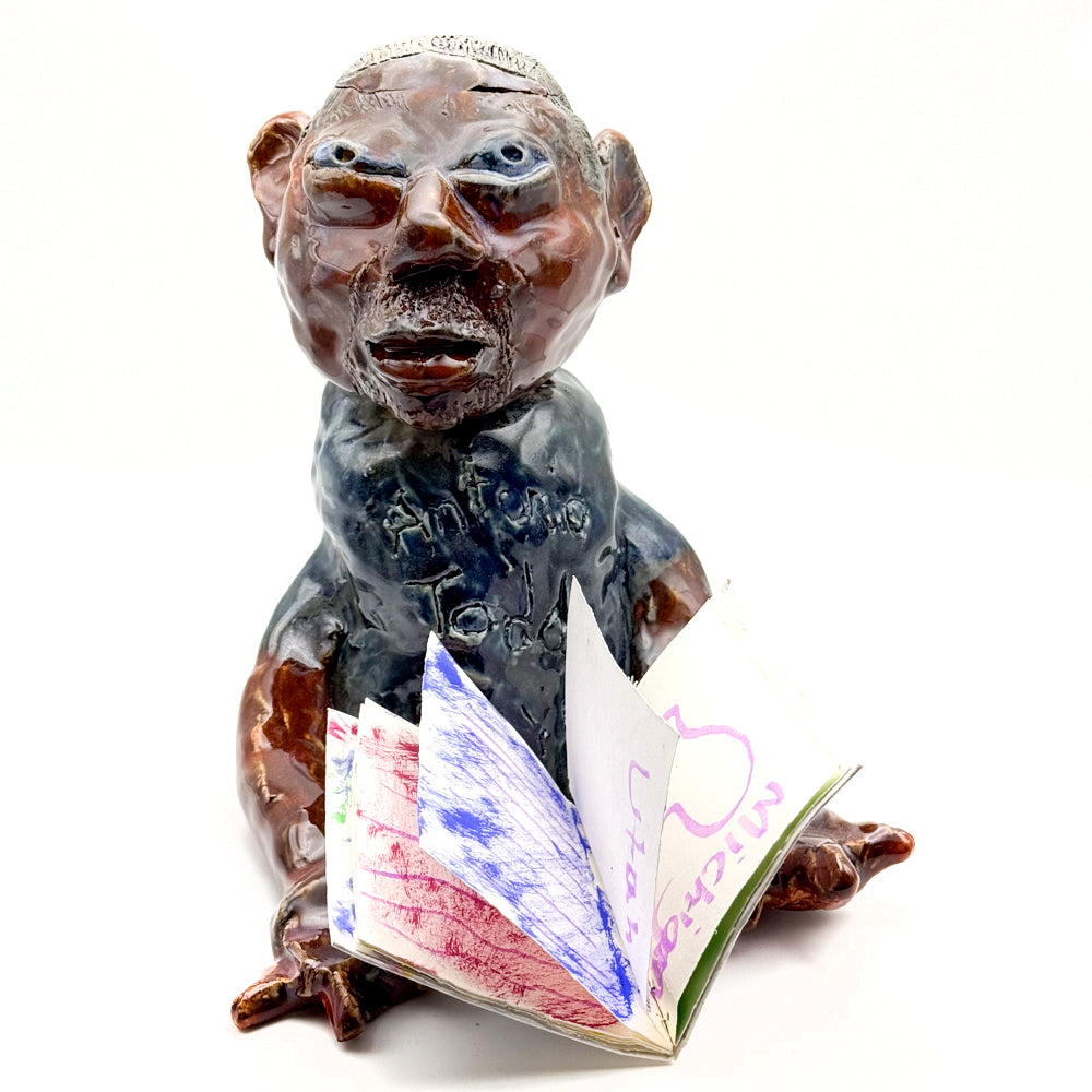 Antonio Todd – Script Writer for Sony Pictures is a ceramic sculpture by Antonio Todd. This piece shows a figure with a bold face, strong arms, and a book in its lap. With a glossy glaze and hand-drawn book pages, the sculpture tells a personal story of dreams, creativity, and self-expression.