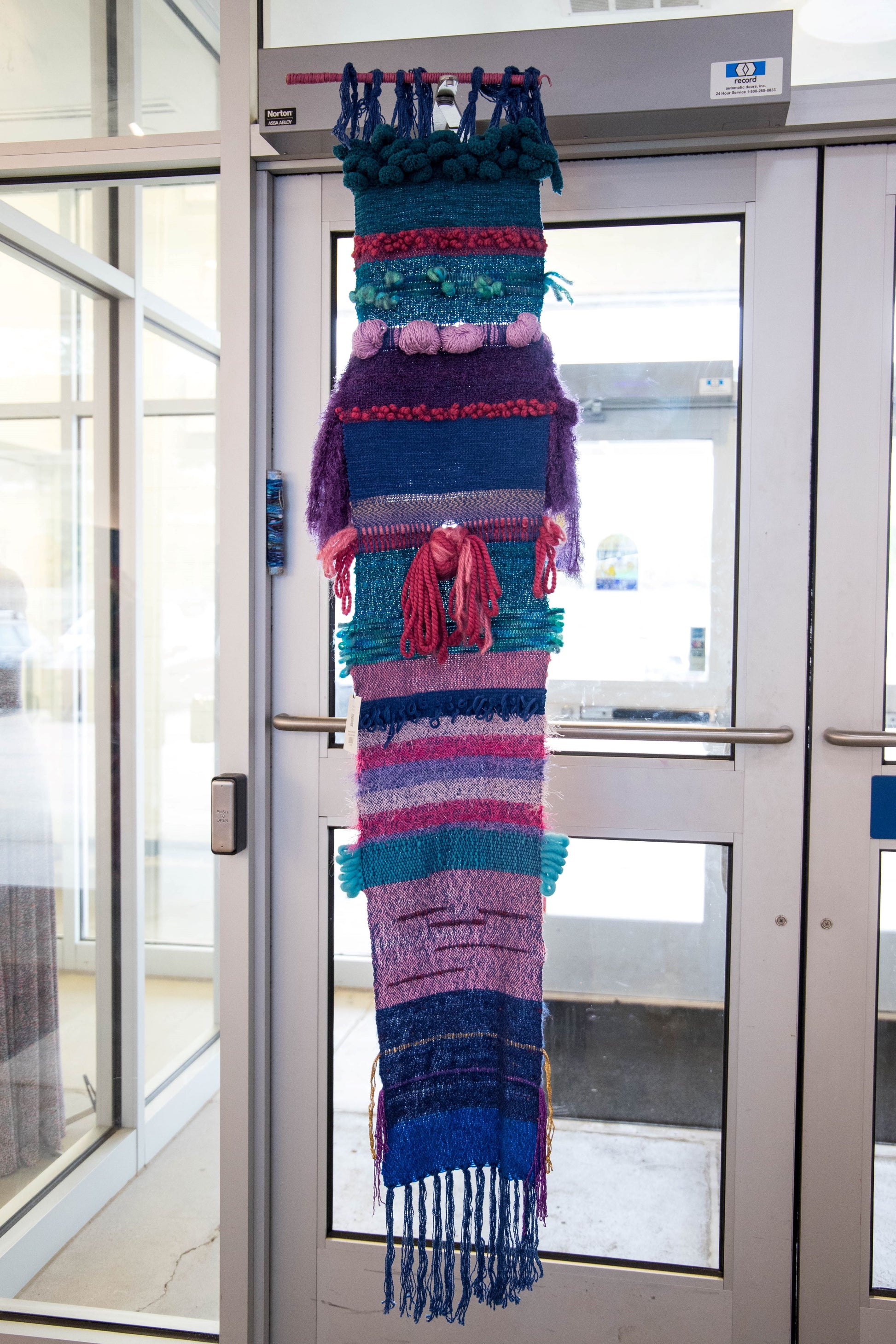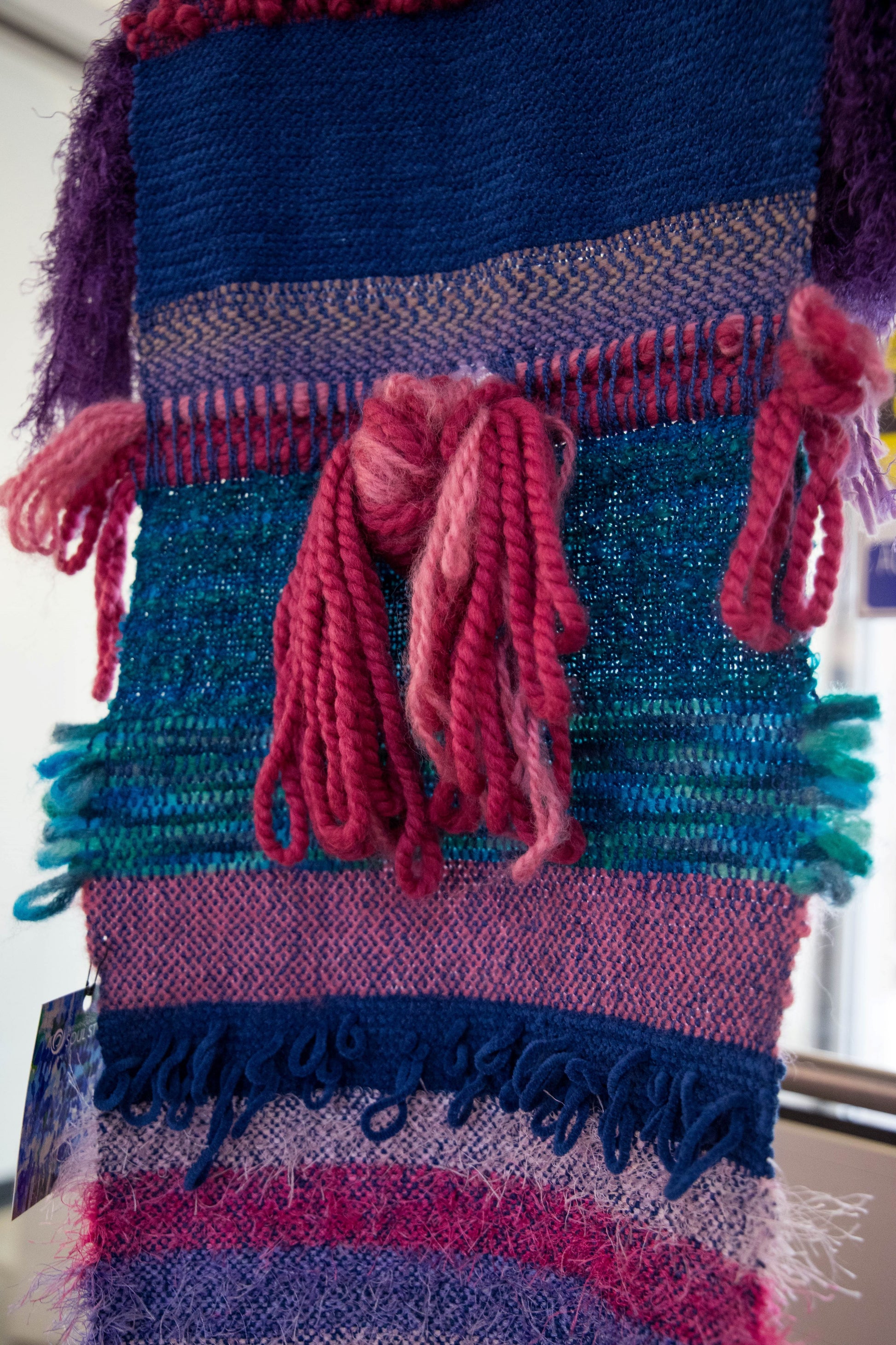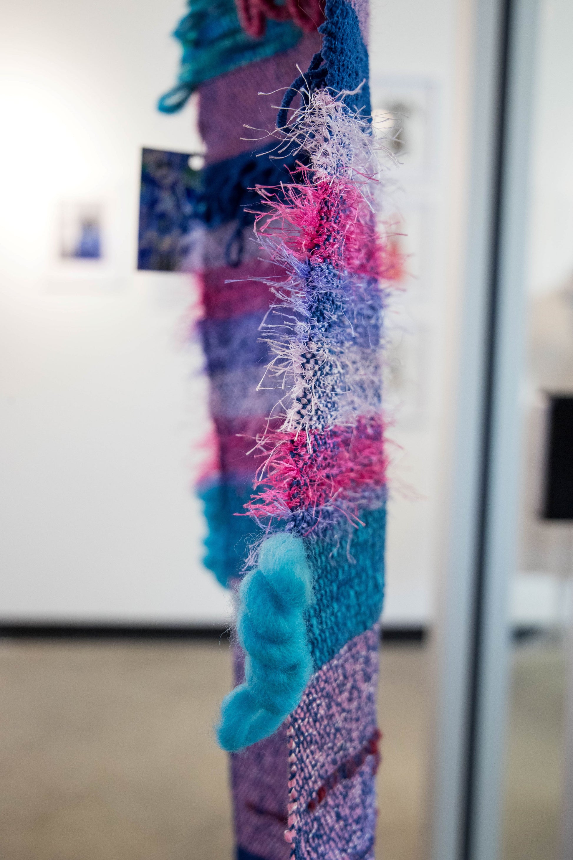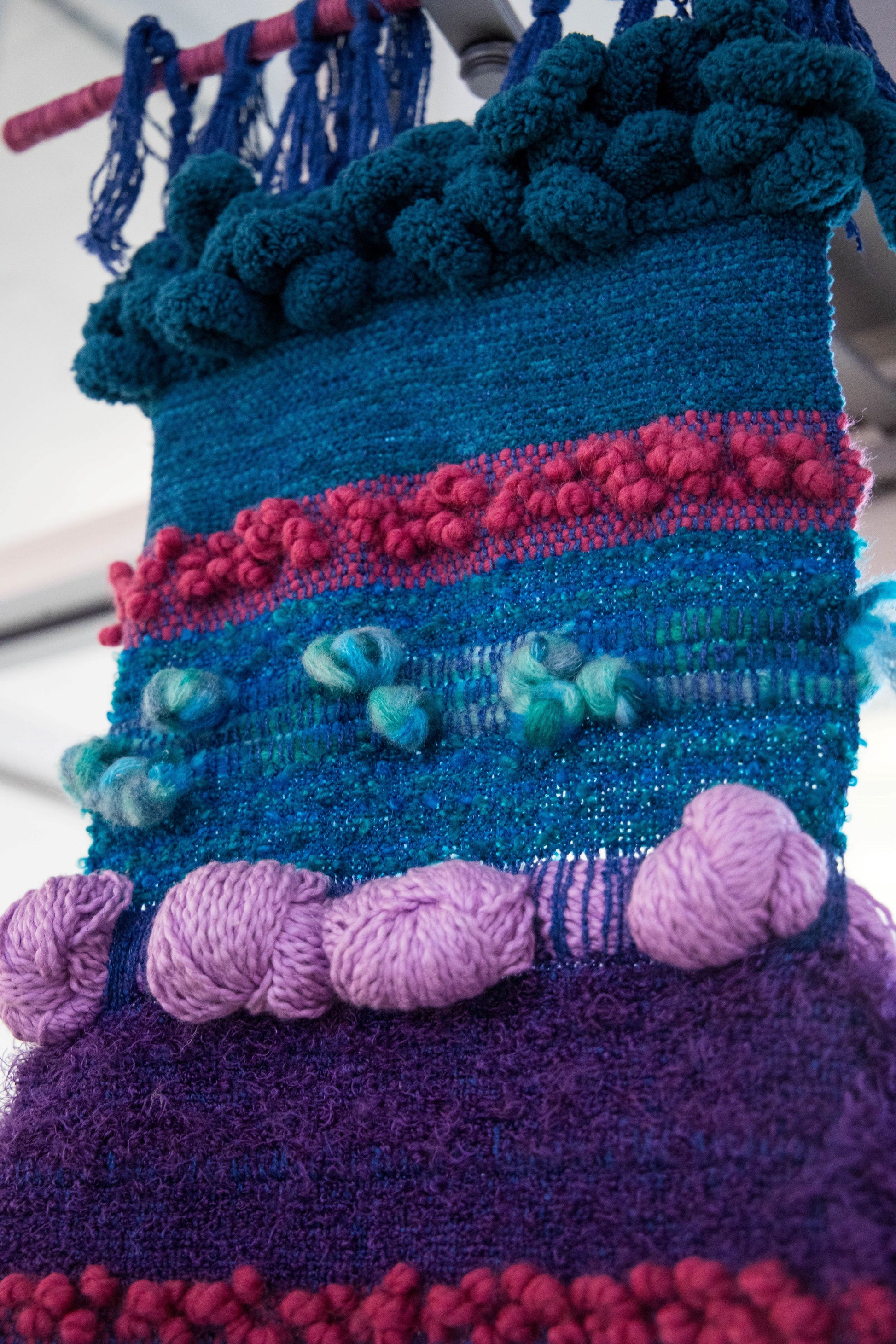 Devorah Newman's stunning decorative weaving, 'Bejeweled Sea,' is a mesmerizing tapestry that transports viewers to the depths of an enchanting underwater world. In this masterfully crafted piece, Newman showcases her expertise in weaving techniques, seamlessly blending various methods to bring forth a rich tapestry of textures and colors. The aquatic jewel tones she has chosen for this artwork evoke the mysterious allure of the sea, with deep blues, vibrant teals, and shimmering greens that mirror the depths of the ocean. Each section of the weaving employs a different weaving technique, adding complexity and depth to the composition. Some areas feature intricate patterns that mimic the delicate sway of seaweed, while others use open weaves to create the illusion of water currents. This dynamic interplay of techniques not only showcases Newman's technical prowess but also captures the ever-changing nature of the underwater world.