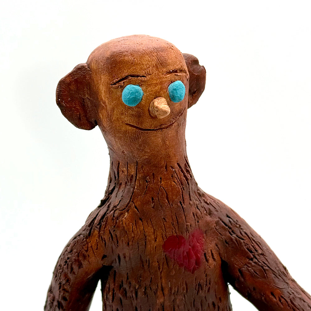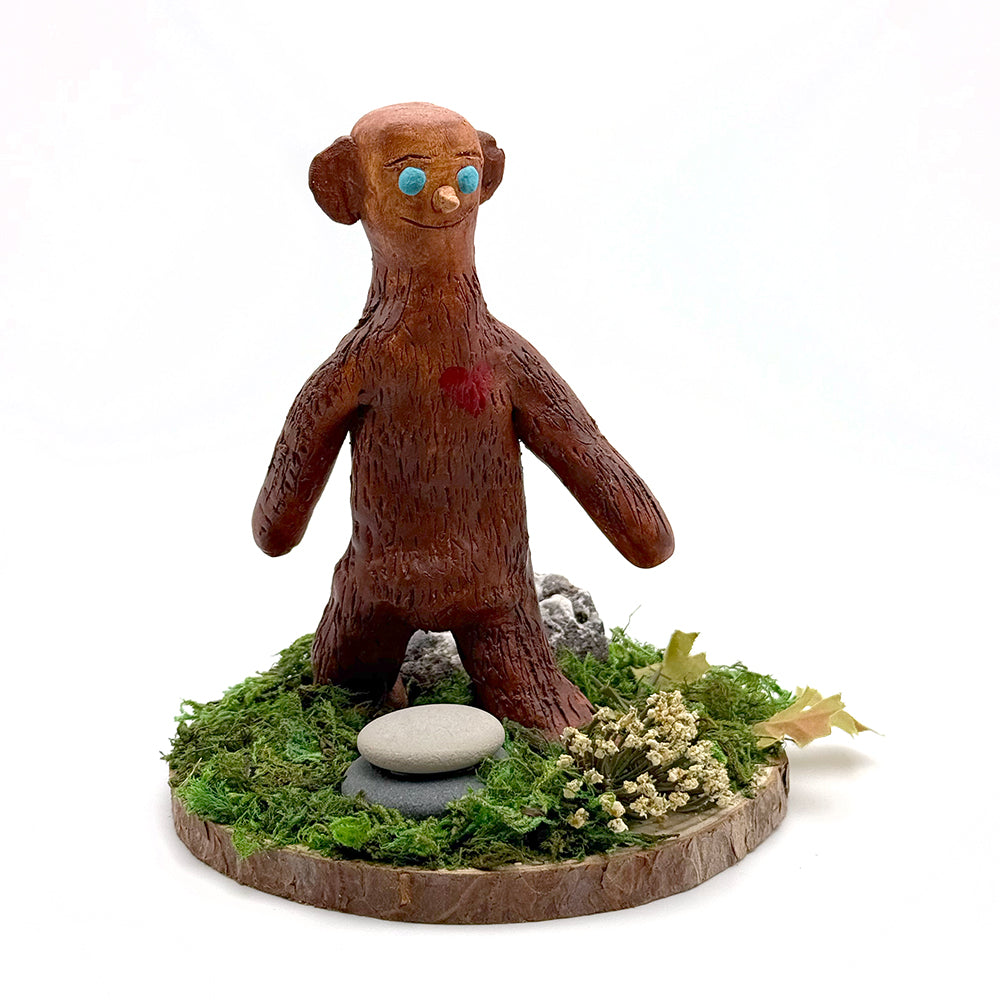 Big Foot by Josiah Sperling is a playful and charming sculpture of the legendary Bigfoot. Made with mixed materials, the figure stands on a base of moss, stones, and plants. He has bright blue eyes, a small smile, and a red heart on his chest. His simple shape and friendly expression make him feel kind and gentle. This piece feels imaginative and full of character.