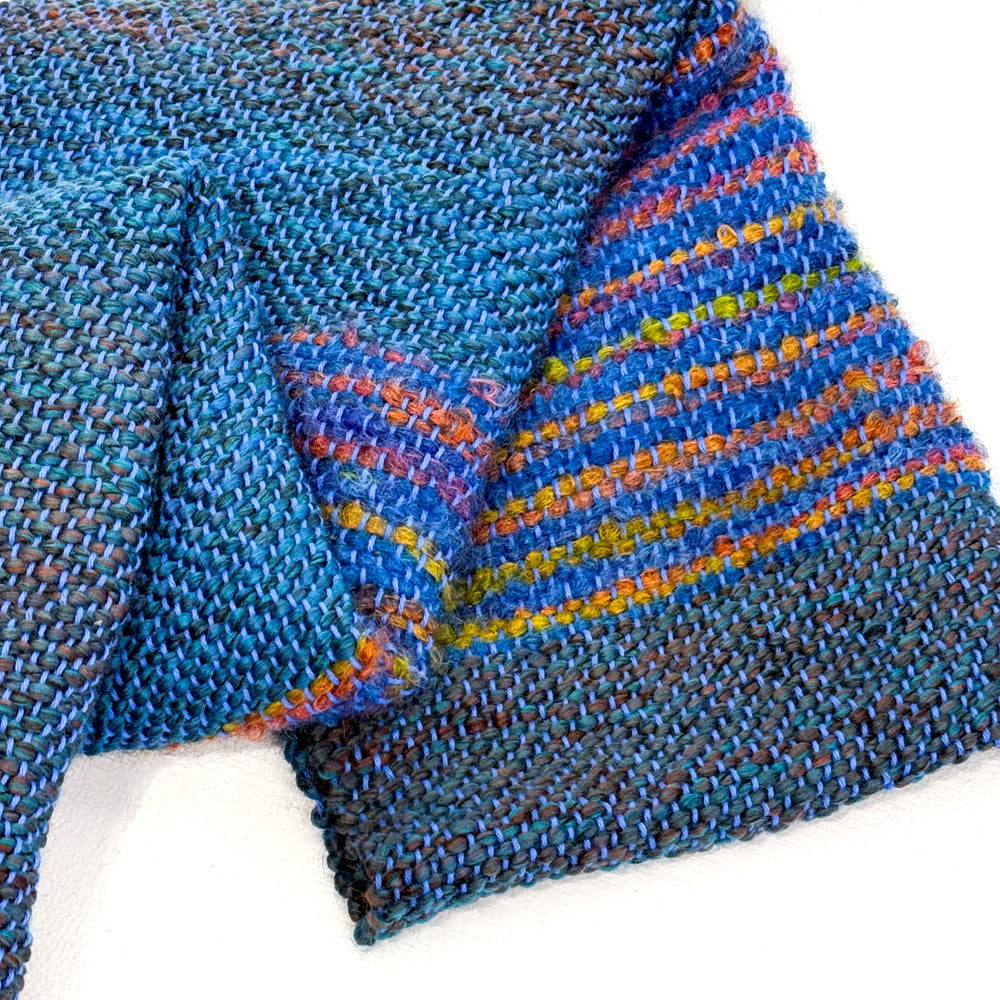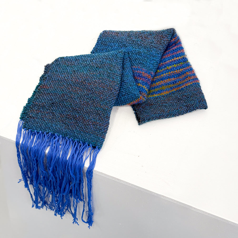 Blue and Teal Weaving by Devorah Newman is a cozy, handwoven piece woven with deep blue and teal colors. Bright stripes of yellow, orange, and pink peek out, adding a playful touch. Long blue fringe finishes the piece, making it feel soft and full of movement.