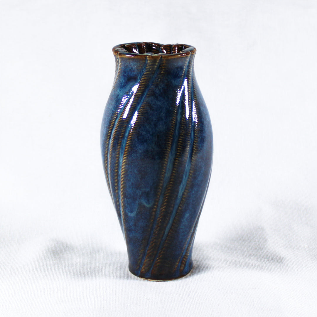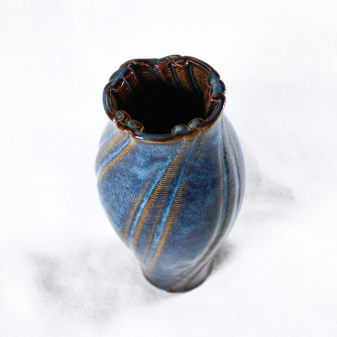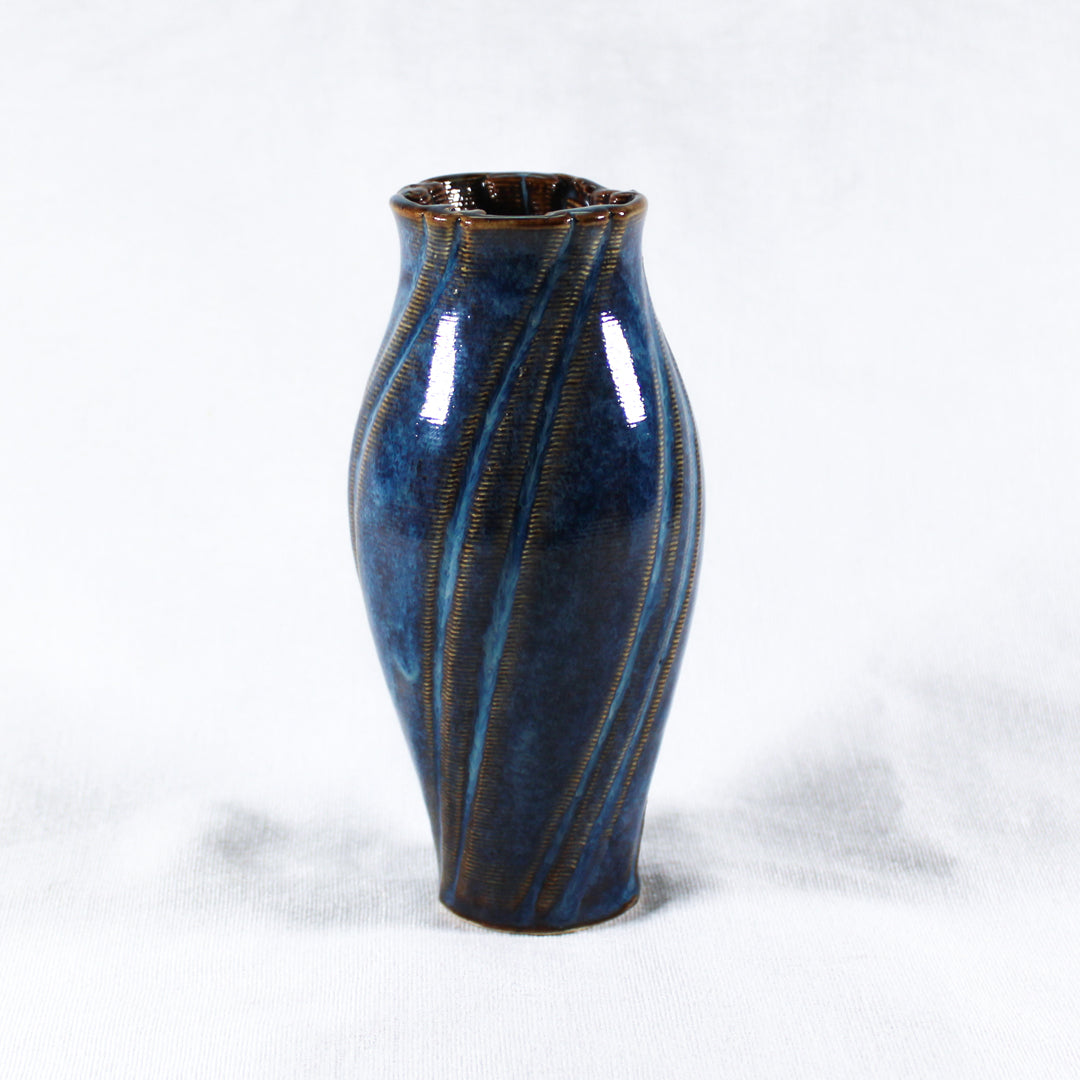 This elegant Blue Jean ceramic vase by David Kole is a testament to timeless design and craftsmanship. Its gracefully curving silhouette is enhanced by a textured surface with subtle, flowing ridges, creating a sense of movement. The rich blue glaze, accented by earthy undertones, evokes the depth and warmth of denim, giving the piece a rustic yet refined aesthetic. Perfect as a centerpiece or for showcasing floral arrangements, this vase is a versatile addition to any space, embodying Kole's skillful balance of artistry and functionality.