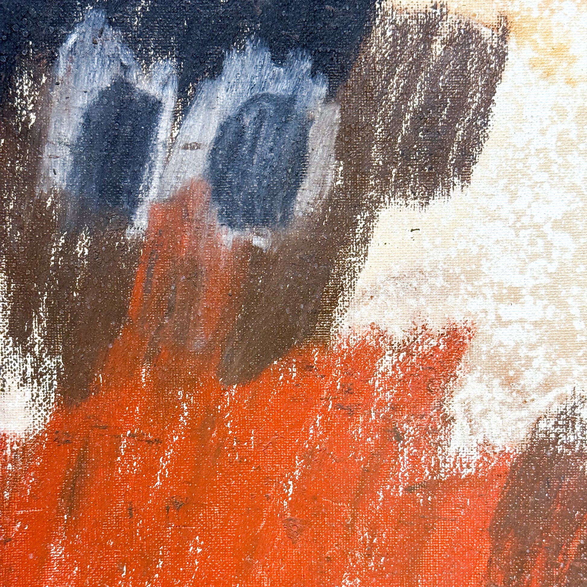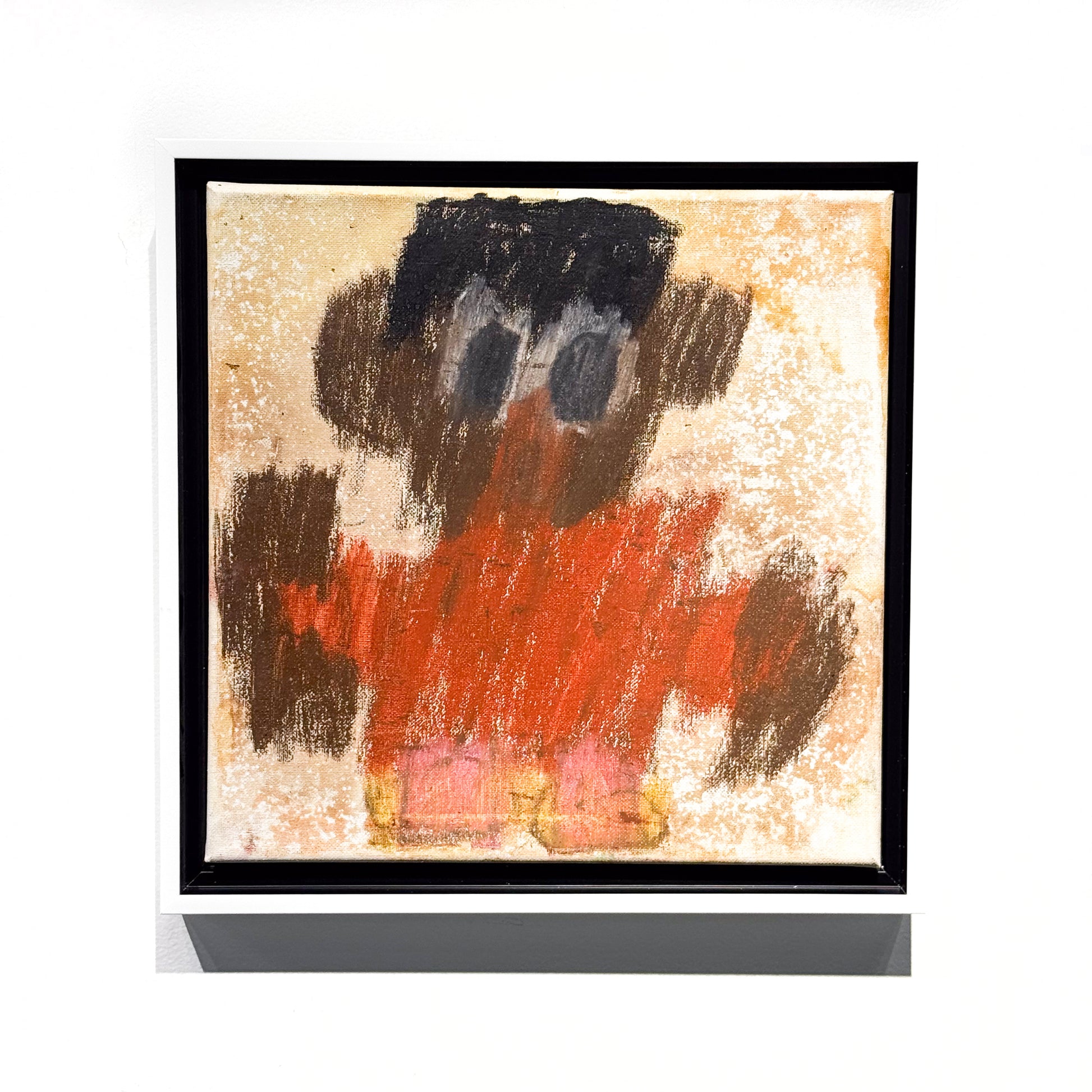 Brown Shirt by Jonathan Barnett is a simple portrait of a person wearing a bright shirt. The figure is painted with loose brushstrokes in brown, black, and red tones. Large gray shapes suggest the eyes, while darker shapes form the hair and arms. The textured background and bold colors give the artwork a raw and expressive feeling.