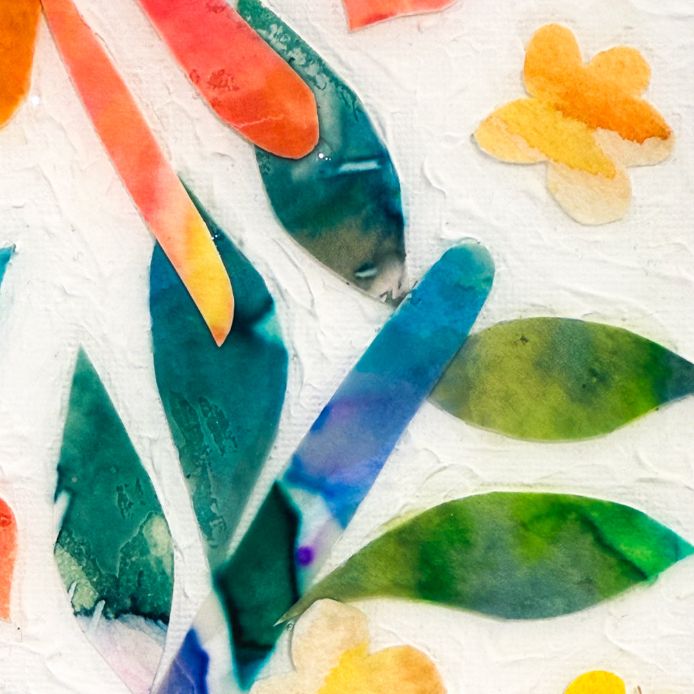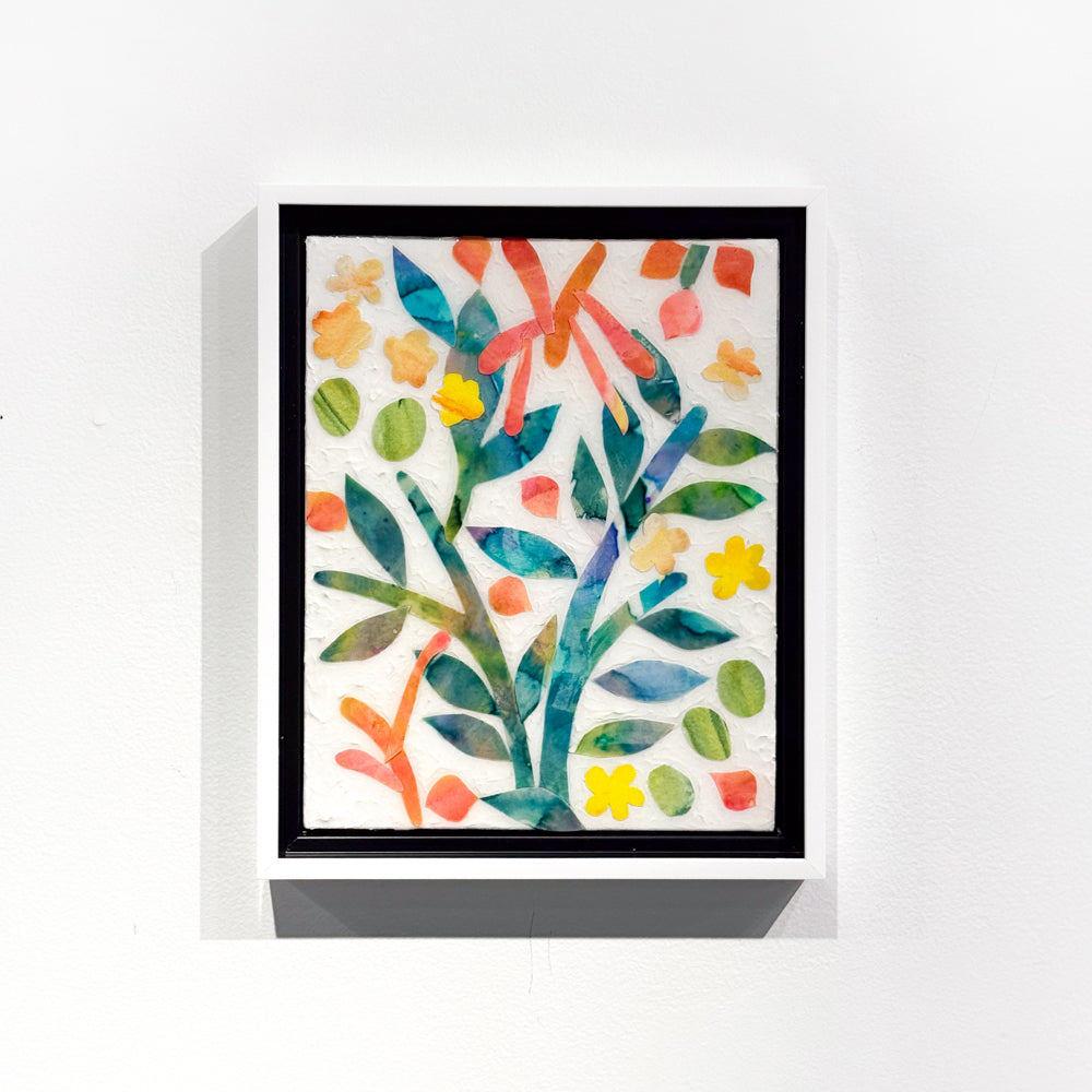 Bunch of Flowers by Stacey Salzberg is a bright and cheerful artwork made with cut pieces of watercolor paper. Each flower and leaf is carefully shaped and placed to create a colorful garden. With soft greens, oranges, and yellows, the piece feels fresh and happy—like a bunch of flowers picked on a sunny day.