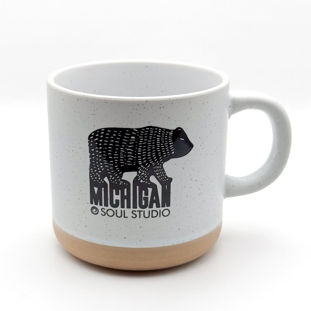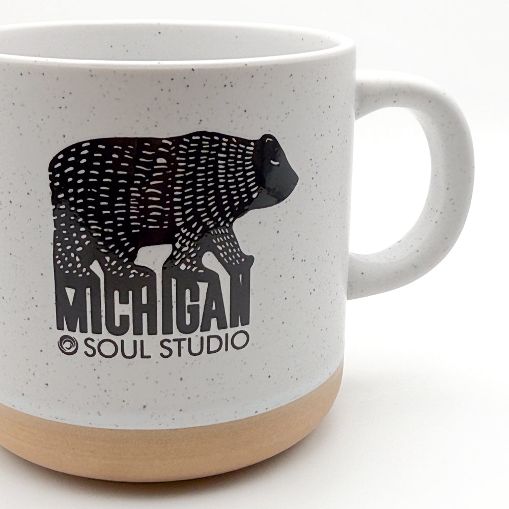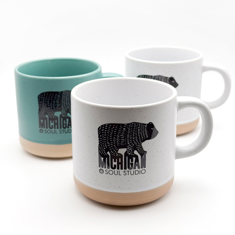 Michigan Bear Mug by Soul Studio features a friendly black-and-white bear inspired by Caryn Martel’s collage Bears in the Forest, Daytime. Printed on a sturdy ceramic mug, this design brings a touch of Michigan wildlife to your morning routine. Available in both white and teal, it’s perfect for sipping coffee, tea, or hot cocoa with a bit of forest charm.