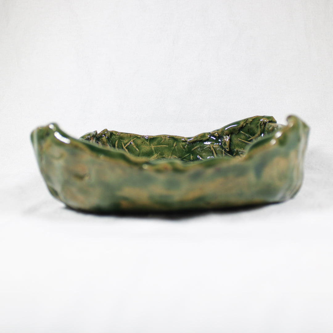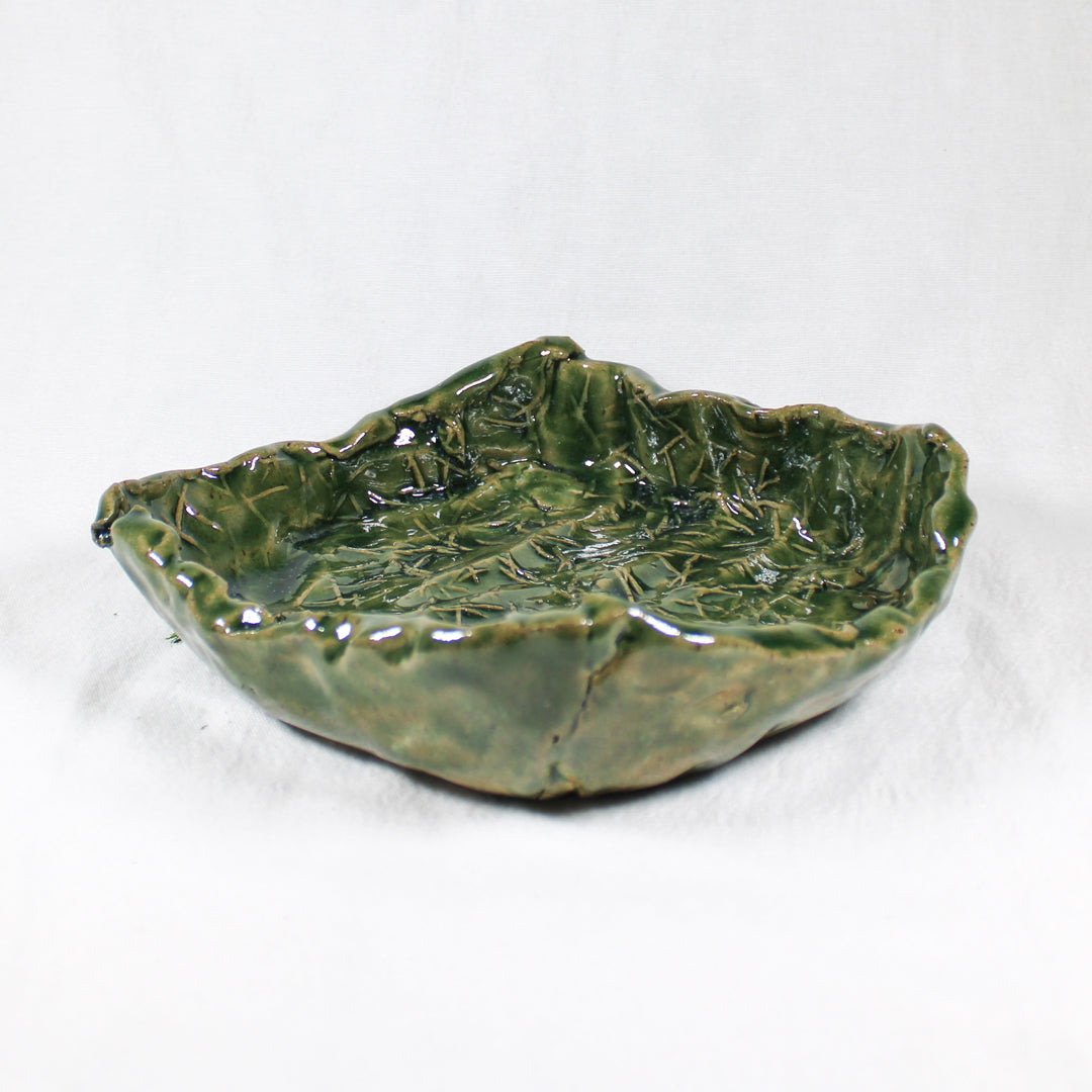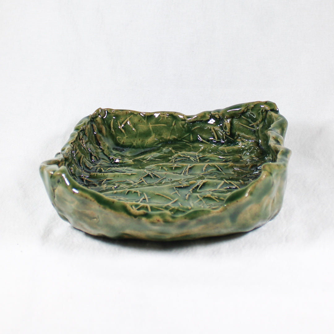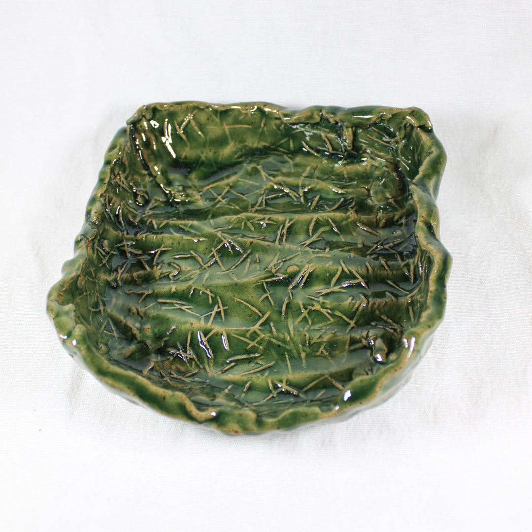 This Ceramic Square Bowl by Daniel Schweitzer is a beautifully crafted piece that captures the organic beauty of nature through its earthy green glaze and textured surface. The bowl's slightly irregular edges and the intricate, etched detailing on the interior evoke the look of natural foliage, giving it a rustic yet refined feel. Its square form and deep color make it a versatile item that can be used for serving, displaying, or as a decorative accent. Perfect for adding a touch of natural elegance to any space, this bowl reflects Schweitzer's attention to detail and skill in merging form and function.