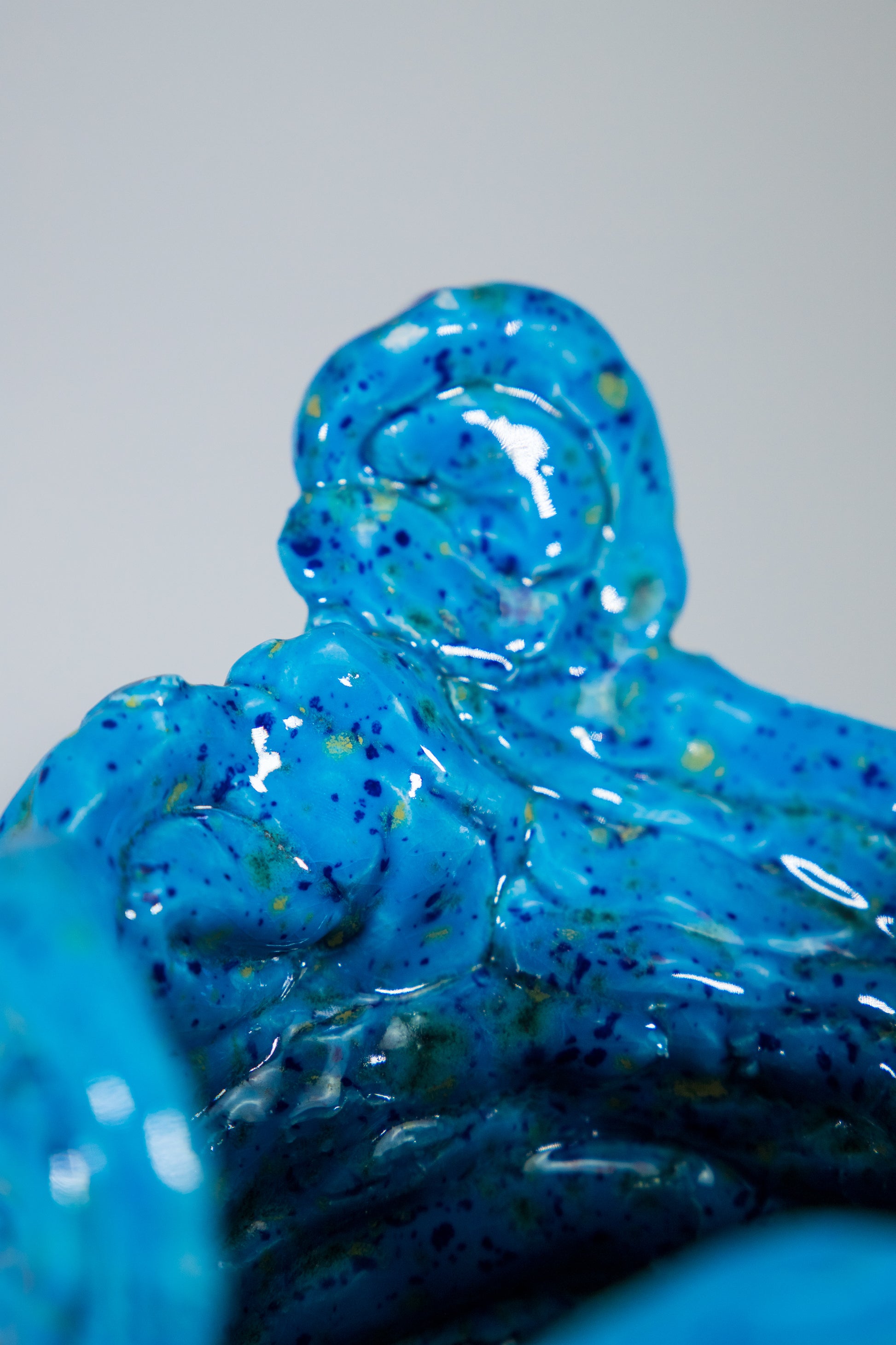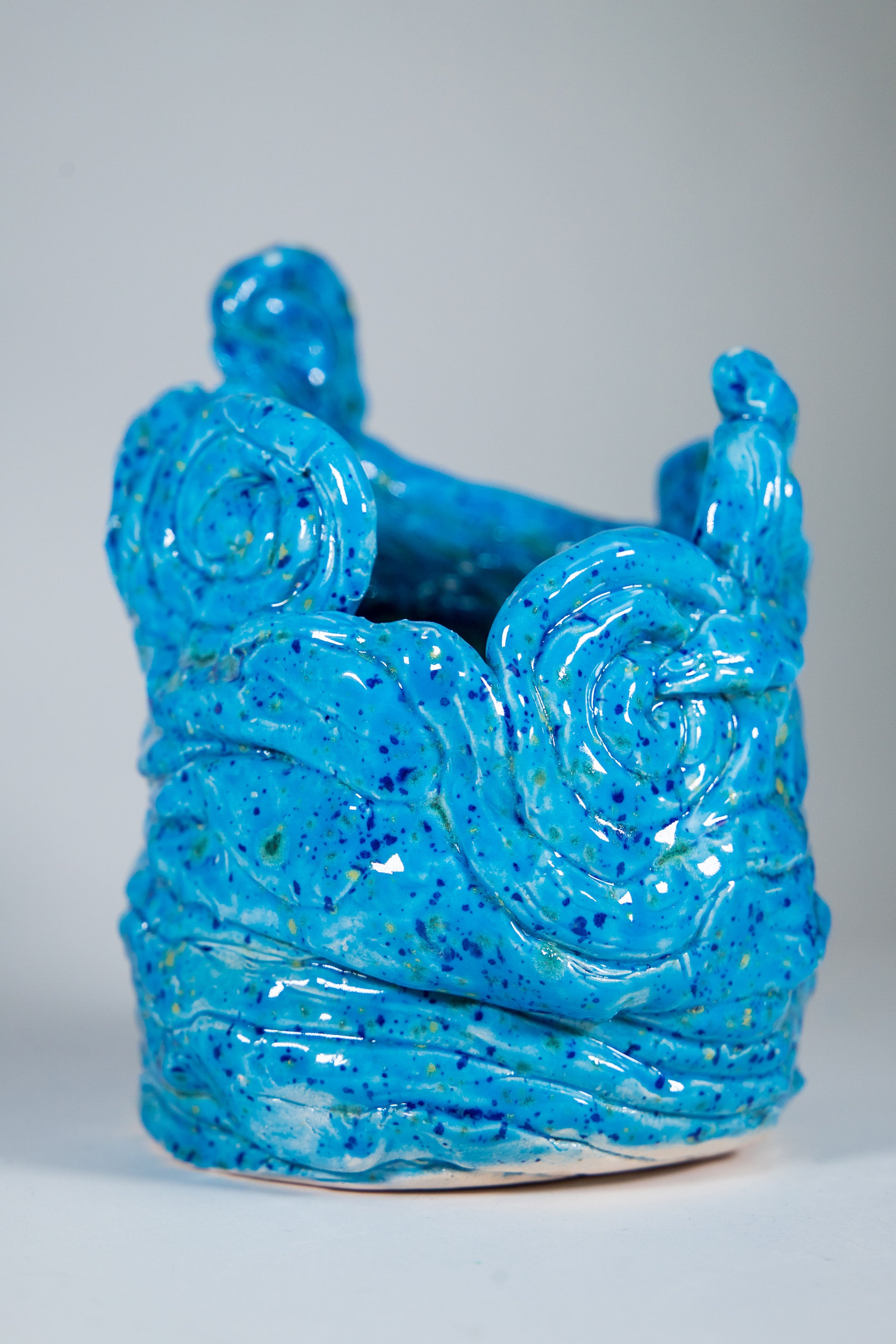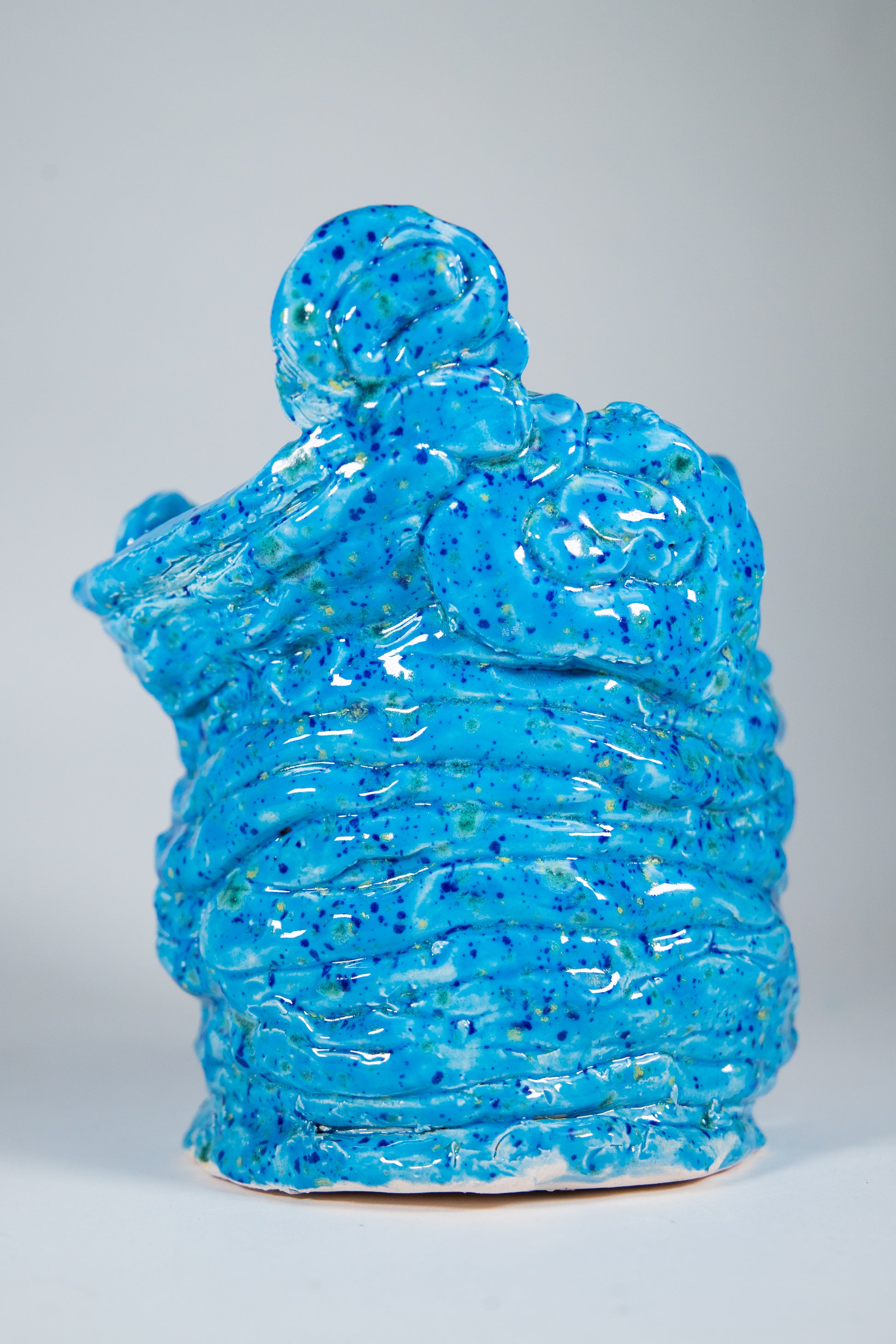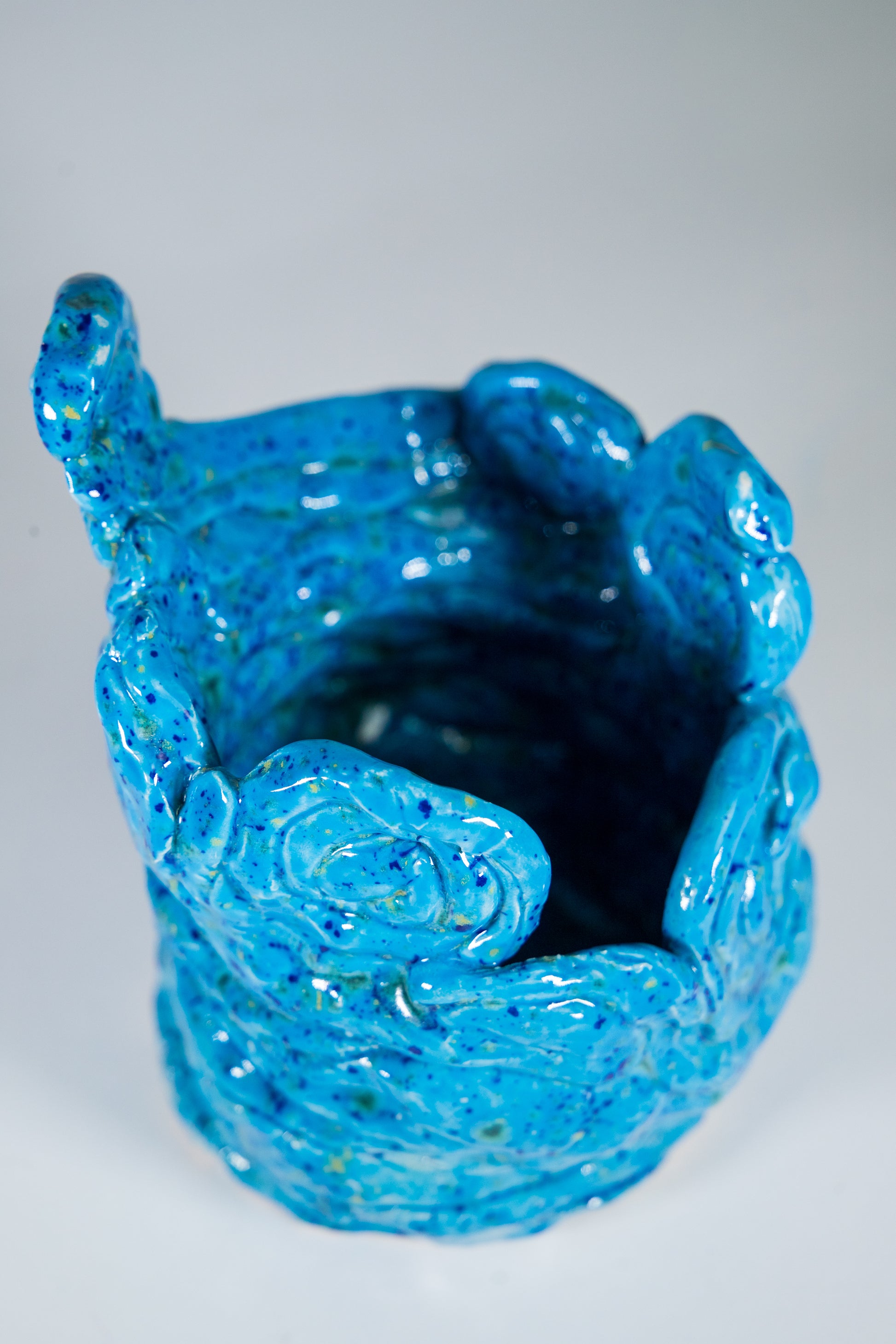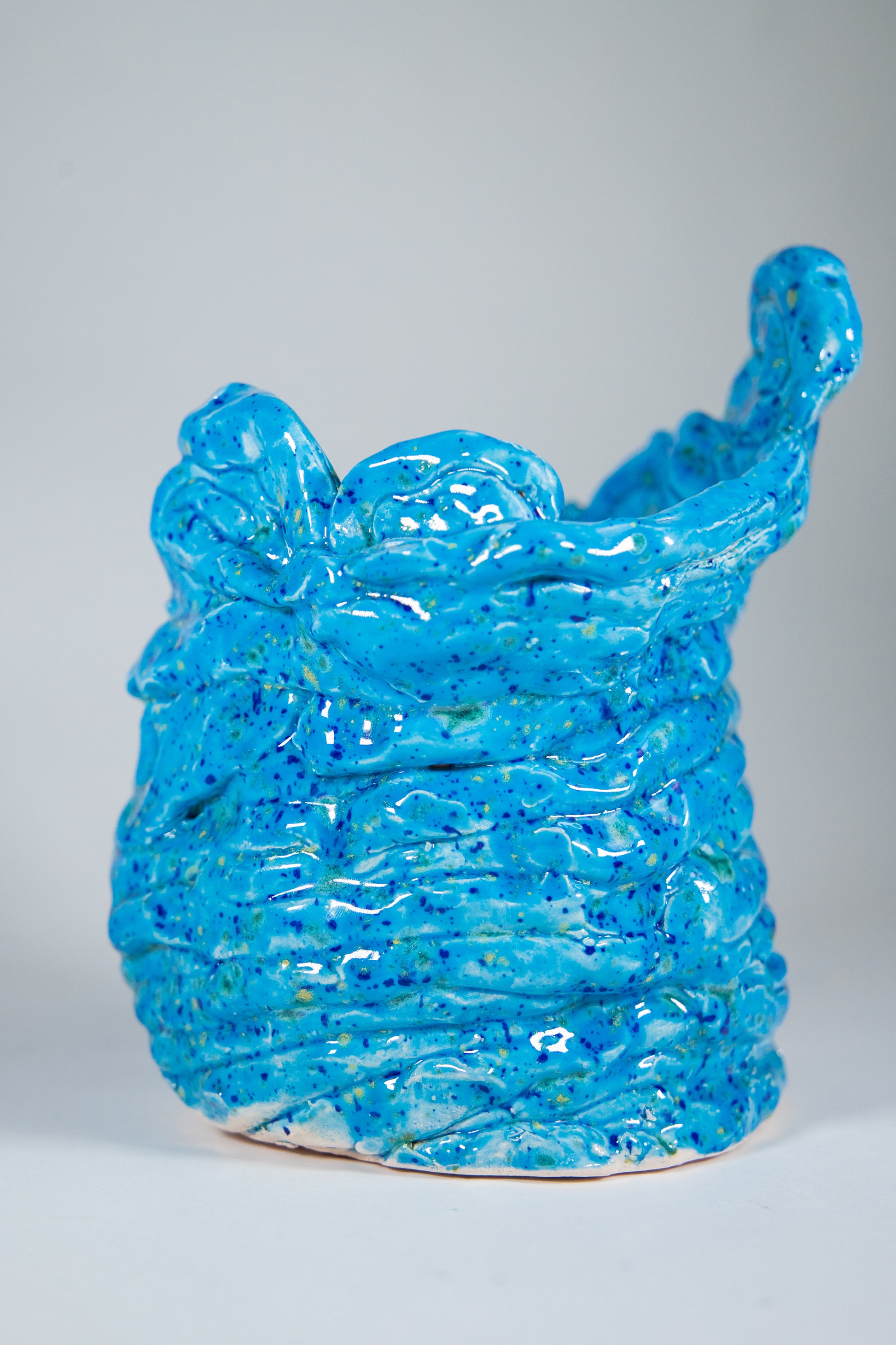 The unique texture of the vase is achieved by layering and shaping the coils, creating a beautiful and organic design that's truly one of a kind. The vase is then carefully glazed in a striking bright blue, adding a bold pop of color that will brighten up any space it's placed in.