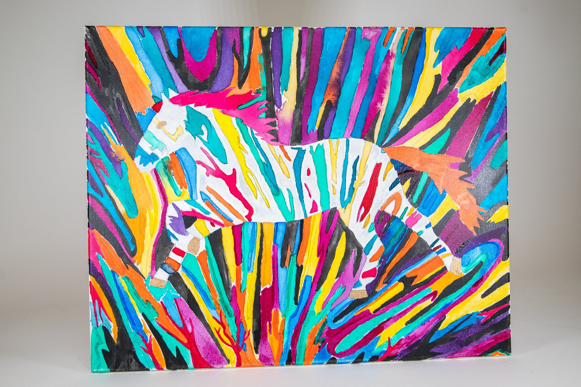 Introducing "Colorful Speed" by Dylan Somberg, a vibrant masterpiece that celebrates the spirit of movement and colors. This captivating painting showcases a dynamic rainbow-colored zebra dashing across a backdrop of mesmerizing rainbow hues. Immerse yourself in the lively energy of this artwork and let its vivid palette ignite your imagination. With "Colorful Speed," Somberg brings together the grace of nature and the joy of vibrant colors, creating a visual feast that will brighten any space.