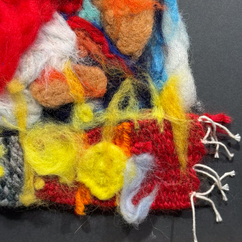 Crayon Heart by Marissa Maver is a soft, fuzzy artwork made from felted wool. Bright colors swirl together like a crayon drawing, with a big red heart in the center. The piece feels playful and warm, full of textures and tiny surprises you can spot up close.