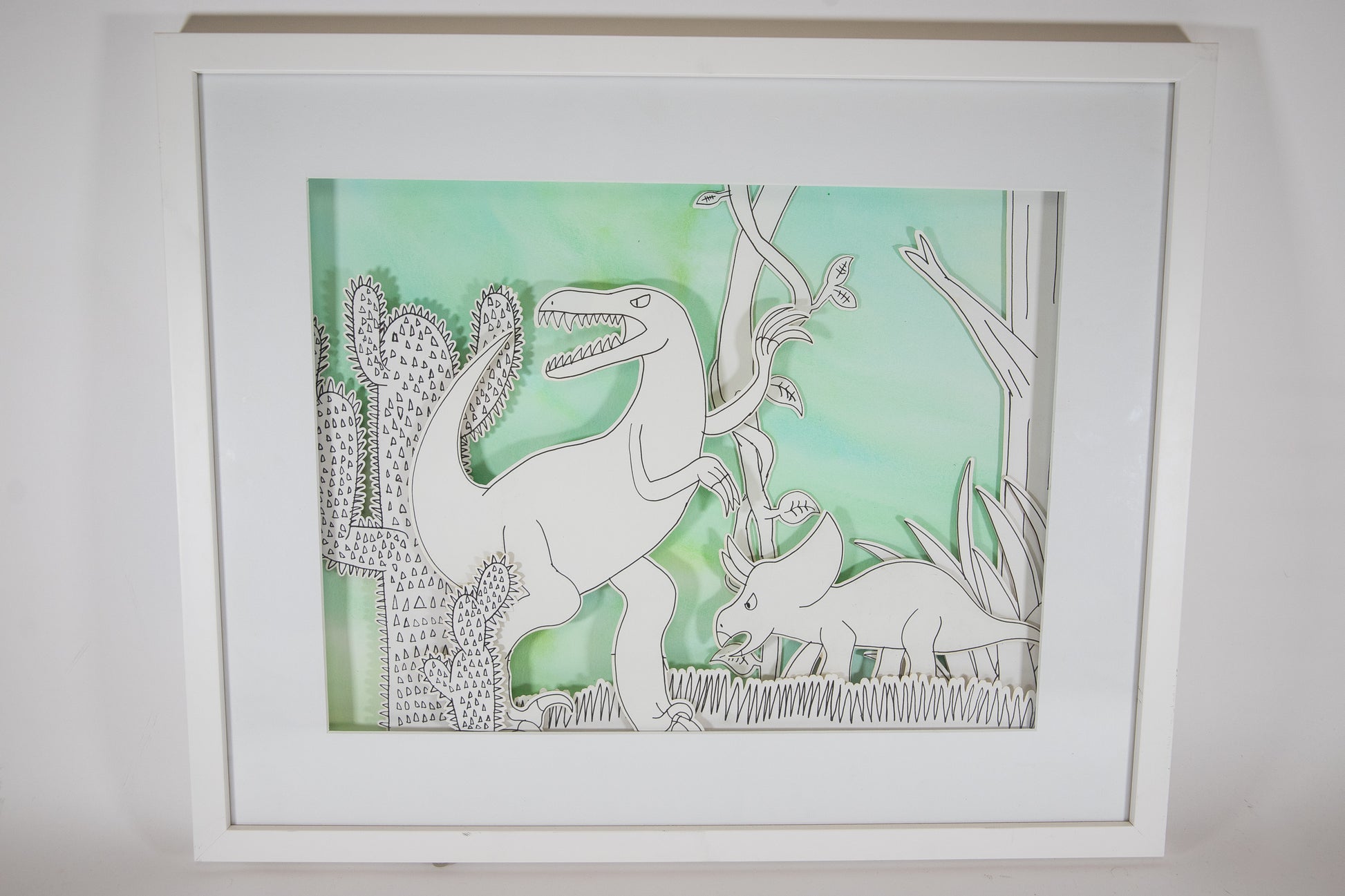 Introducing "Desert Dinosaurs," a captivating artwork that brings together intricate linework and layered cutouts to create a stunning composition against a vibrant green watercolor background. This remarkable piece showcases the beauty of dinosaurs in a desert setting, igniting the imagination and transporting viewers to a prehistoric world filled with awe-inspiring creatures.