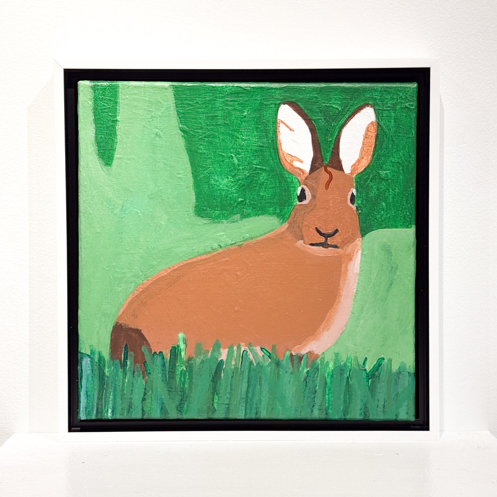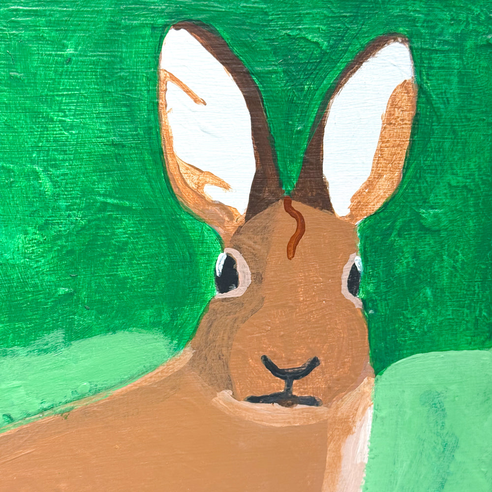 Detroit Bunny of Michigan by Nick Gammicchia is a charming and serene portrait of a rabbit nestled in a lush green landscape. With wide, expressive eyes and tall, alert ears, the bunny gazes out with gentle curiosity, bringing a sense of calm and warmth to the scene. The bold blocks of color and clean lines give the piece a graphic, modern feel while celebrating the quiet beauty of Michigan’s natural spaces. This painting is a delightful tribute to the wildlife and wonder found close to home.