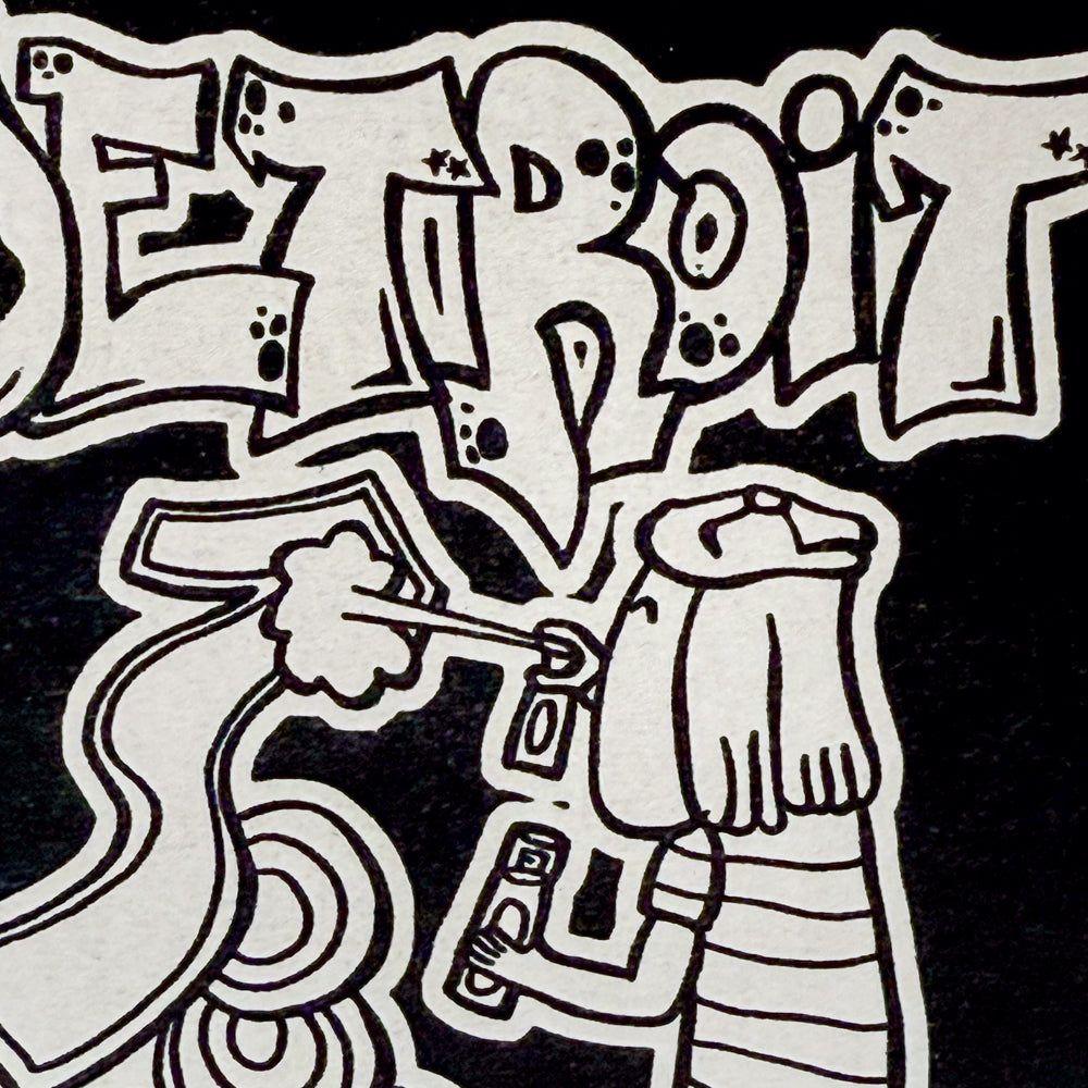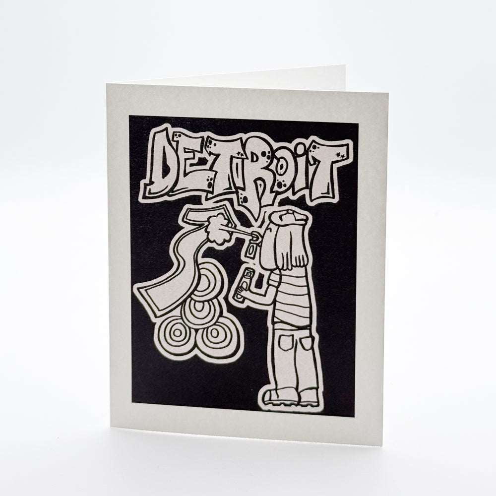 This Detroit card by Nick Gammicchia shows a bold, black-and-white street art style that captures the city's creative spirit. The hand-drawn design features a figure spray-painting the word Detroit in graffiti-style letters, surrounded by playful swirls and shapes. It’s full of personality and edge—perfect for anyone who loves art, the city, or both. Great for framing or sending as a unique note.