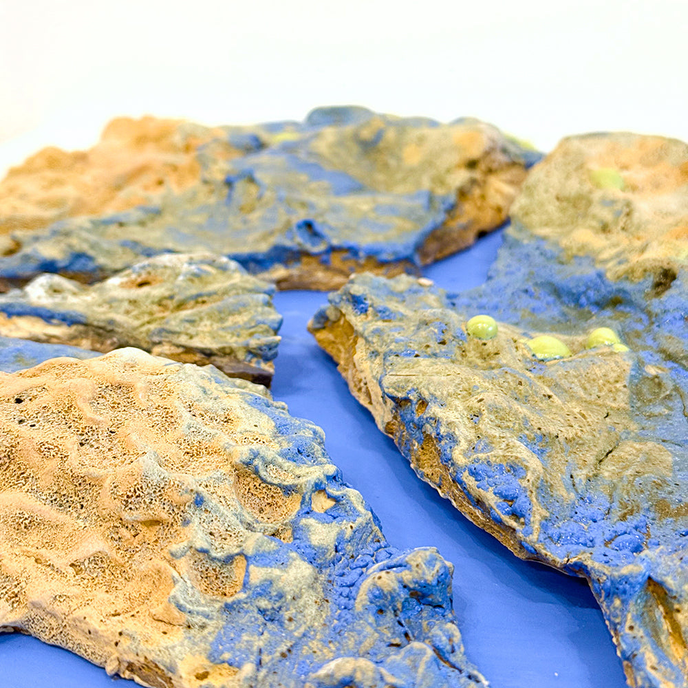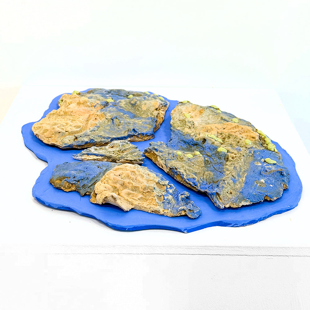 Early Antimonia 2 by Brian Nanry is a ceramic sculpture that looks like pieces of land floating on bright blue water. The rough, bumpy surface and tan and blue colors make it feel like a strange island or rocky landscape. Small glossy yellow dots add a fun surprise, like something growing or glowing. This piece feels like part of an imaginary world from long ago.