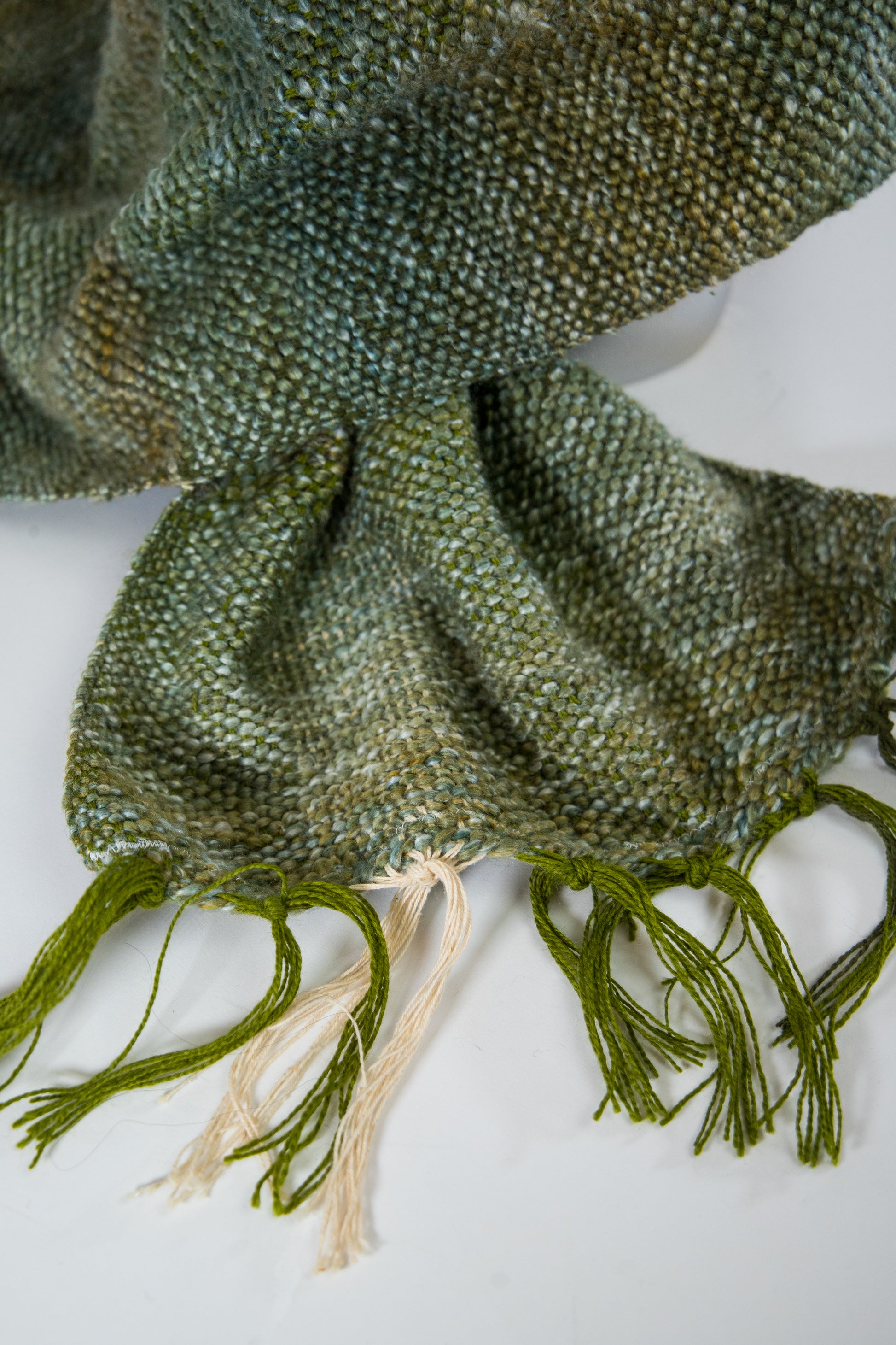 50" handwoven scarf in a variety of earthy green tones of soft yarns. Andy works diligently on the loom to create fibers products crafted with love.