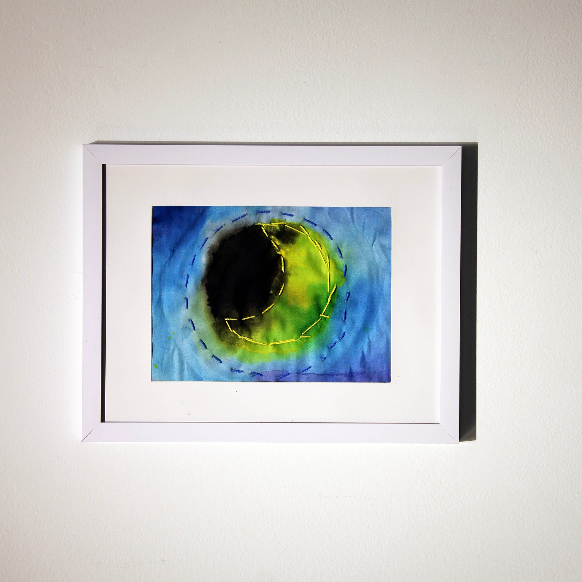 I made this artwork during the solar eclipse in 2024. Everyone was wearing glasses, because you can't look at the sun directly. The sun and moon work together to create the solar eclipse, which makes the sky dark. I worked to create the position of them using fabric paint and embroidery thread. I think this is the best artwork I've ever done.