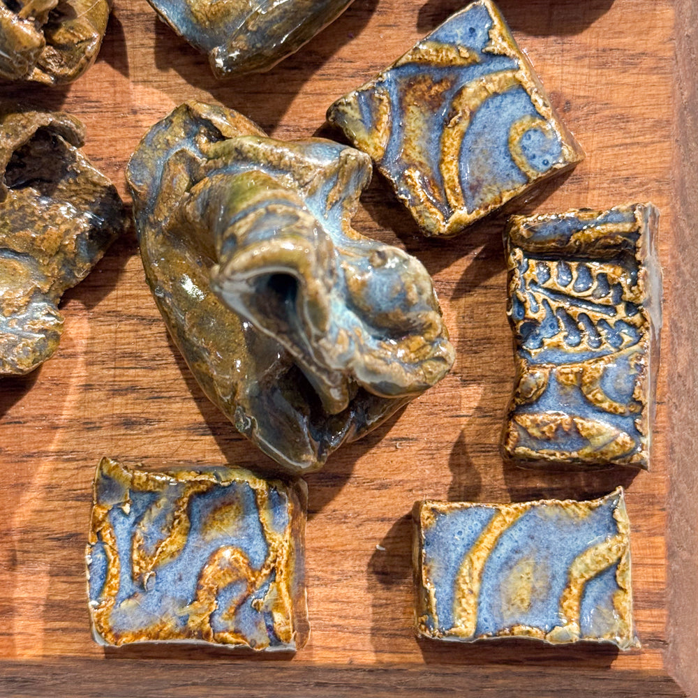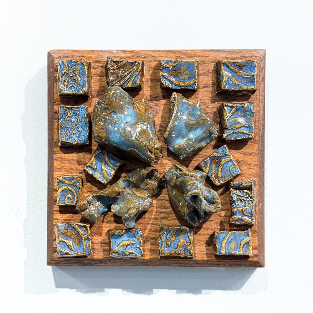 Enjoy What You Have by Alyssa Gold is a ceramic artwork made of beautifully textured blue and brown pieces arranged on a wooden square. Each tile has its own unique pattern and shape, creating a rich and detailed surface. The artwork invites us to slow down, look closely, and appreciate the beauty in the things we already have.
