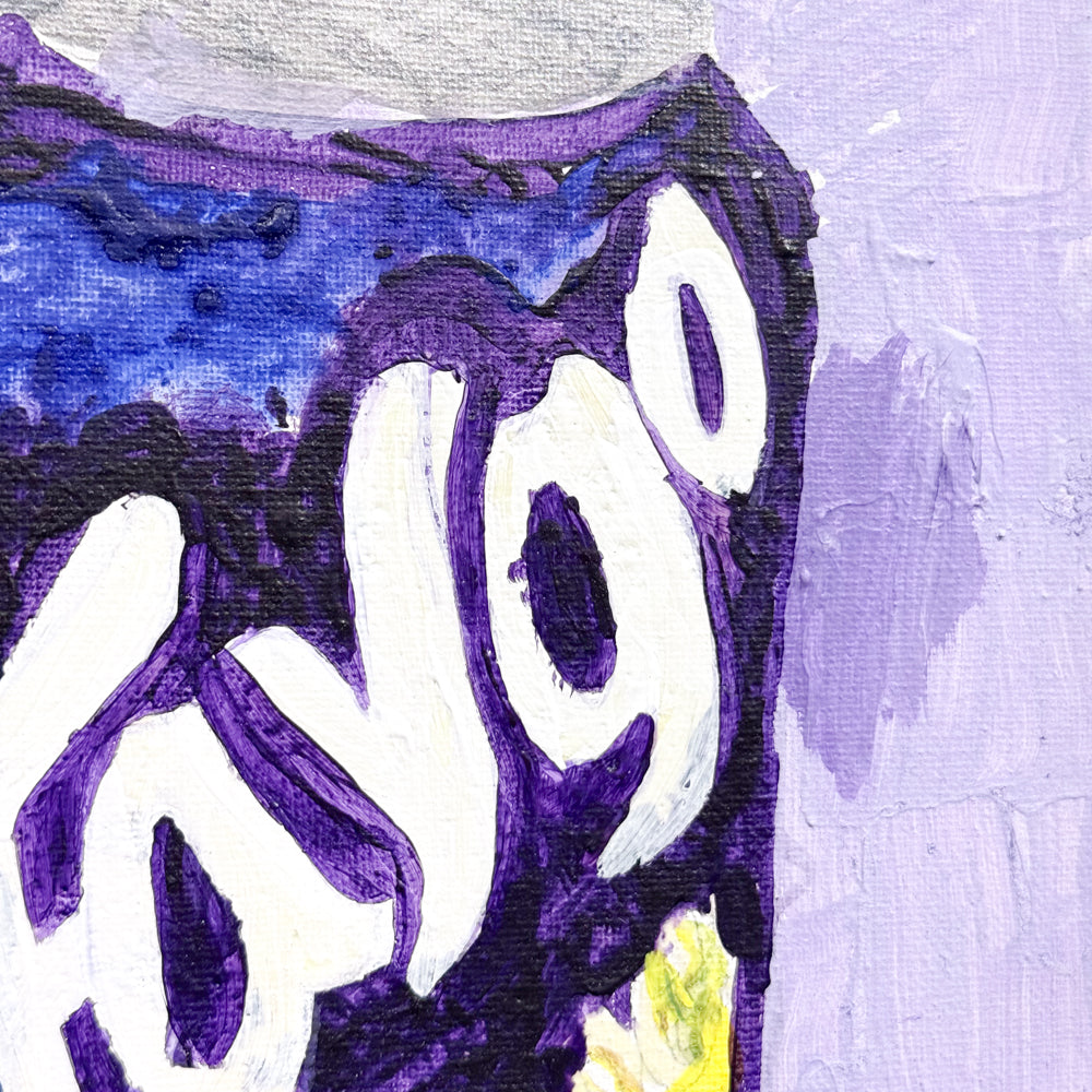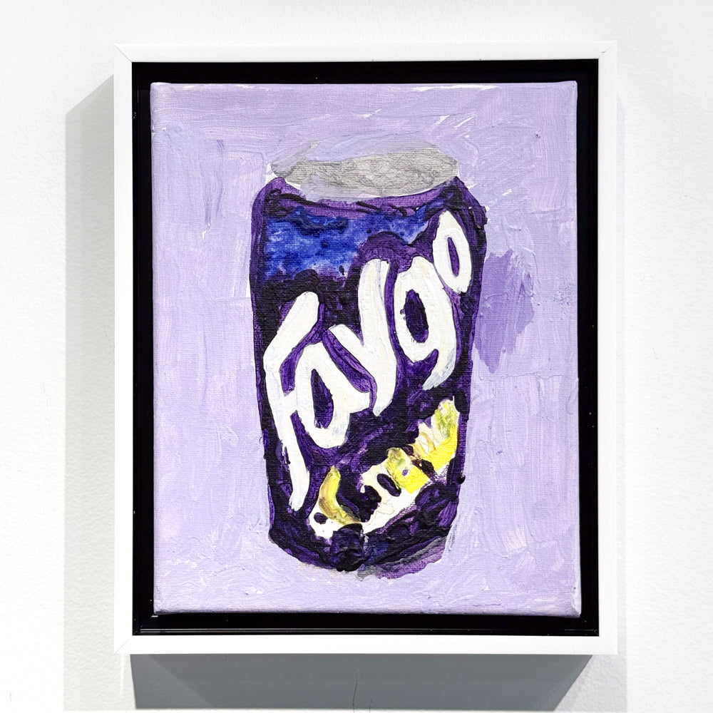 Faygo Grape by Stacey Salzberg is a fun and bold painting of a can of grape Faygo. The deep purple can stands out on a soft lavender background, with the word “Faygo” painted in big white letters. The colors are bright and eye-catching, just like the tasty soda it shows. This artwork is a sweet and playful tribute to a favorite Michigan drink.
