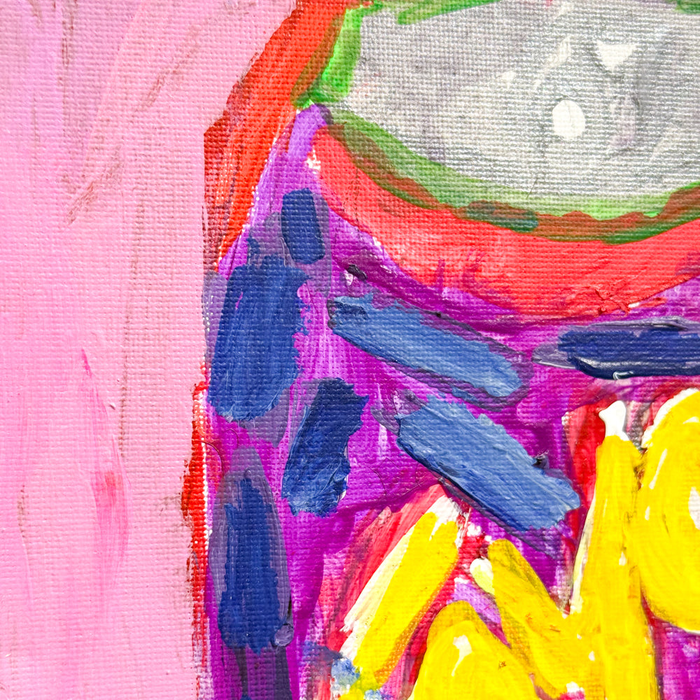 Faygo Grape Alternative Soda by Megan Donley is a colorful and fun painting of a bright pop can. The can is full of bold pinks, purples, blues, and yellows, with the word “Faygo” standing out in bright yellow letters. Set against a pink background, the painting feels playful and full of energy—just like the fizzy soda it shows. It’s a creative and joyful take on a favorite Michigan drink.