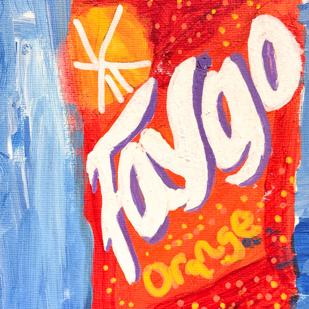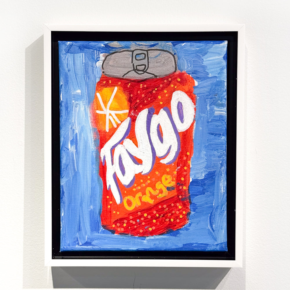 Faygo Orange by Carlie Suris is a bright and fun painting of a can of orange Faygo pop. The bold red and orange can stands out against a cool blue background, making it look fresh and exciting. With its big white letters and colorful bubbles, this artwork celebrates a classic Michigan drink in a playful and cheerful way.