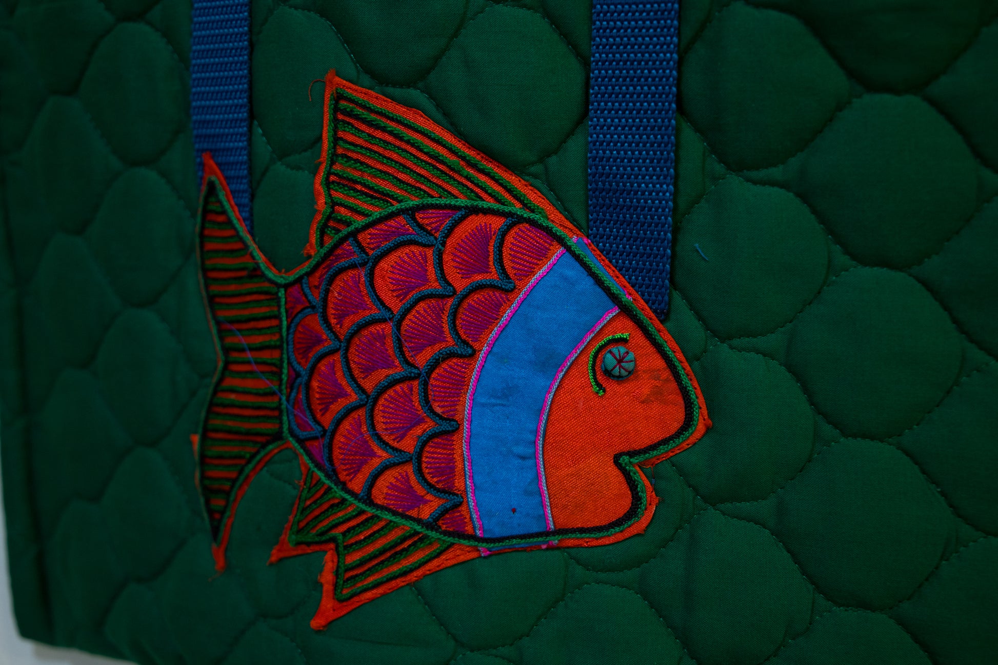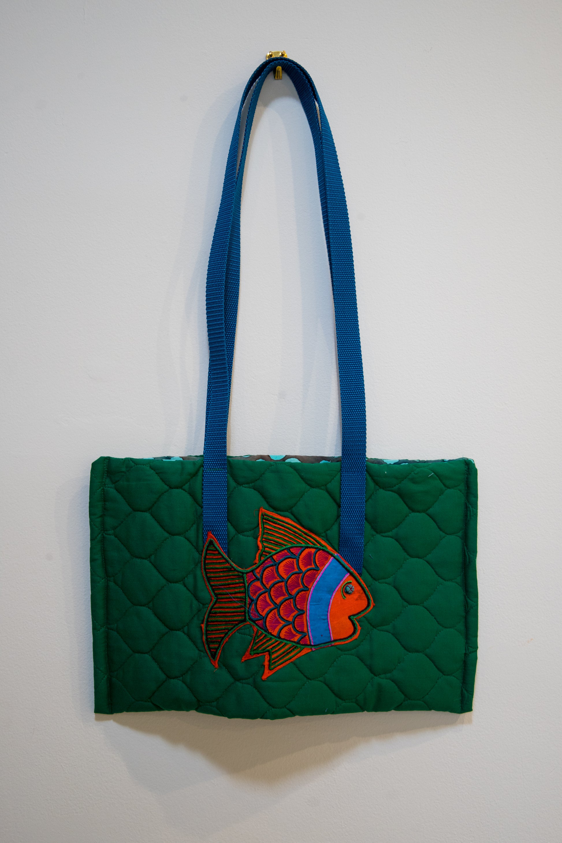 Expertly crafted by Ted Bednark, the Fishy Laptop Bag is the perfect blend of style and functionality. Its emerald green outer fabric and bubbly decorative inner fabric make a unique statement, while the sturdy nylon carry straps provide durability. The padded design offers exceptional protection for your laptop, and the embroidered fish patch adds a touch of whimsy.