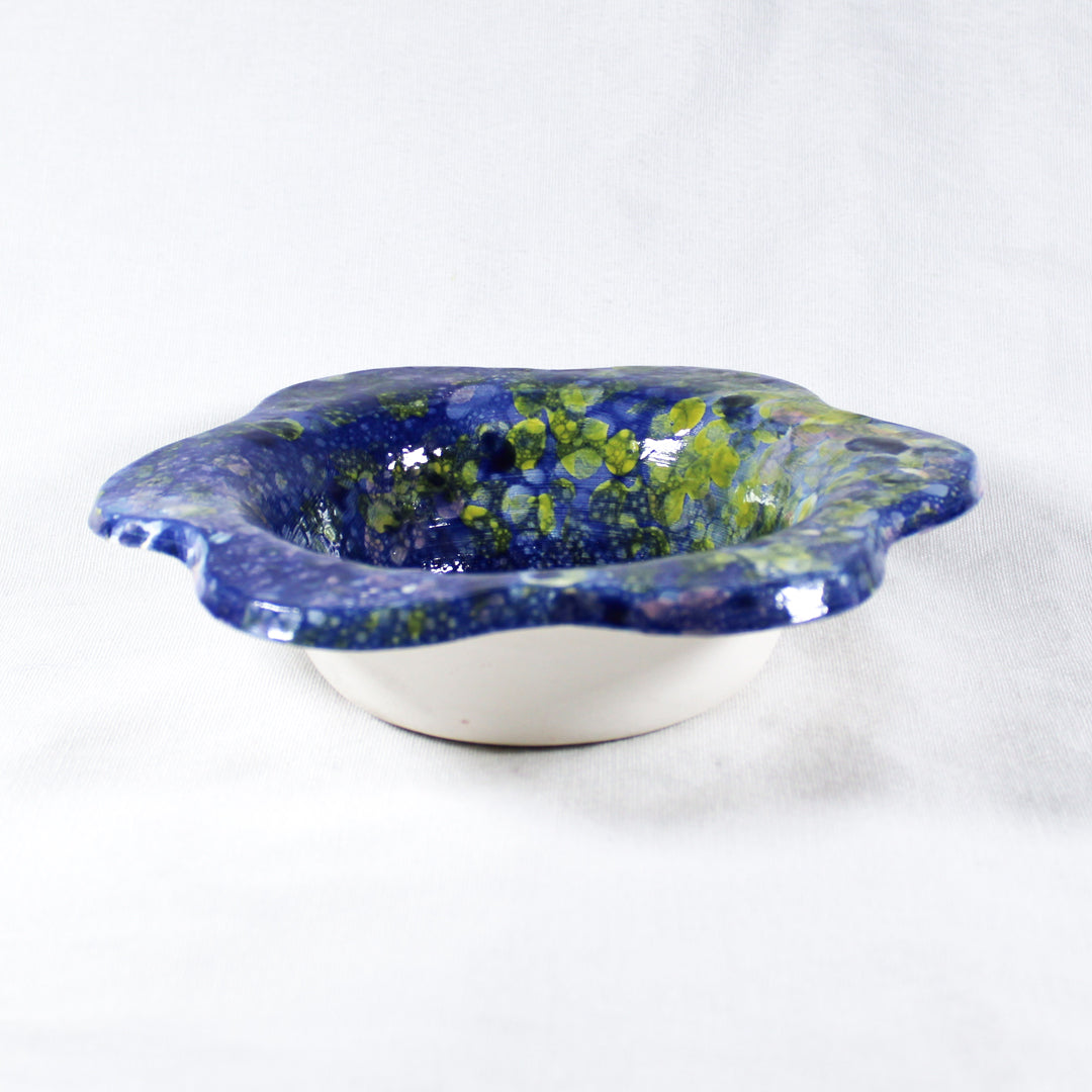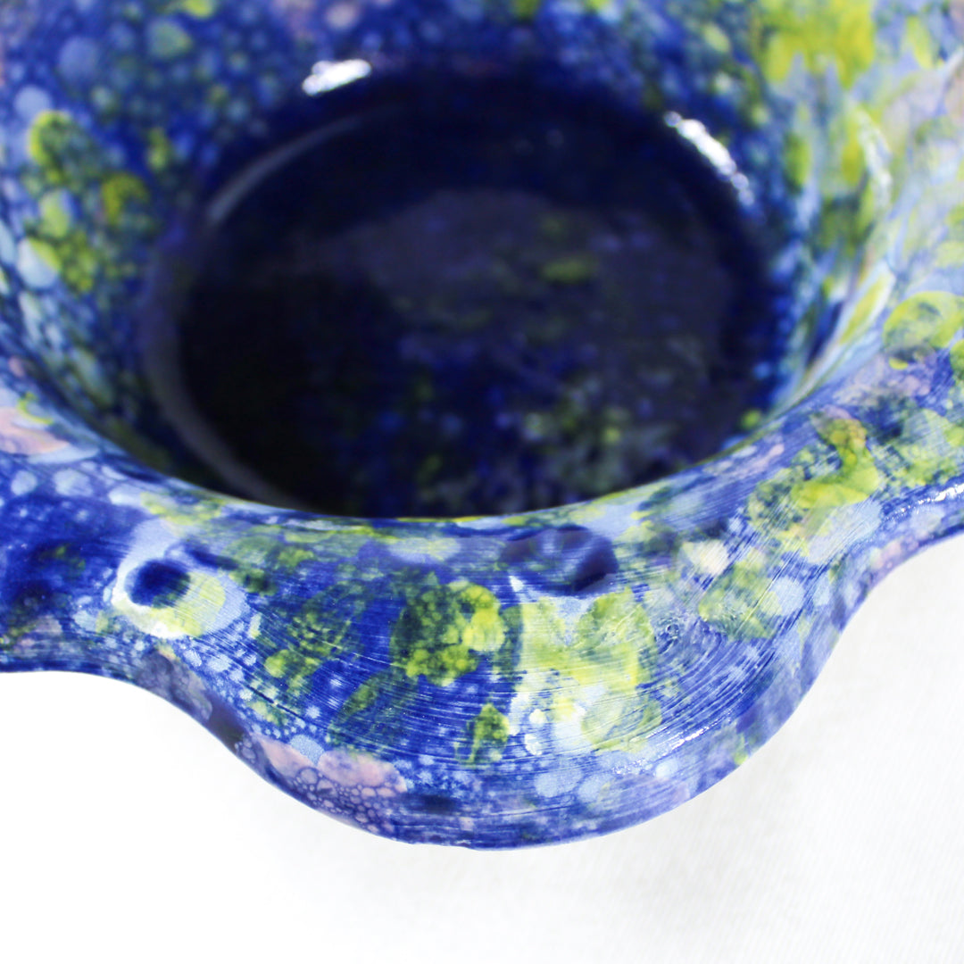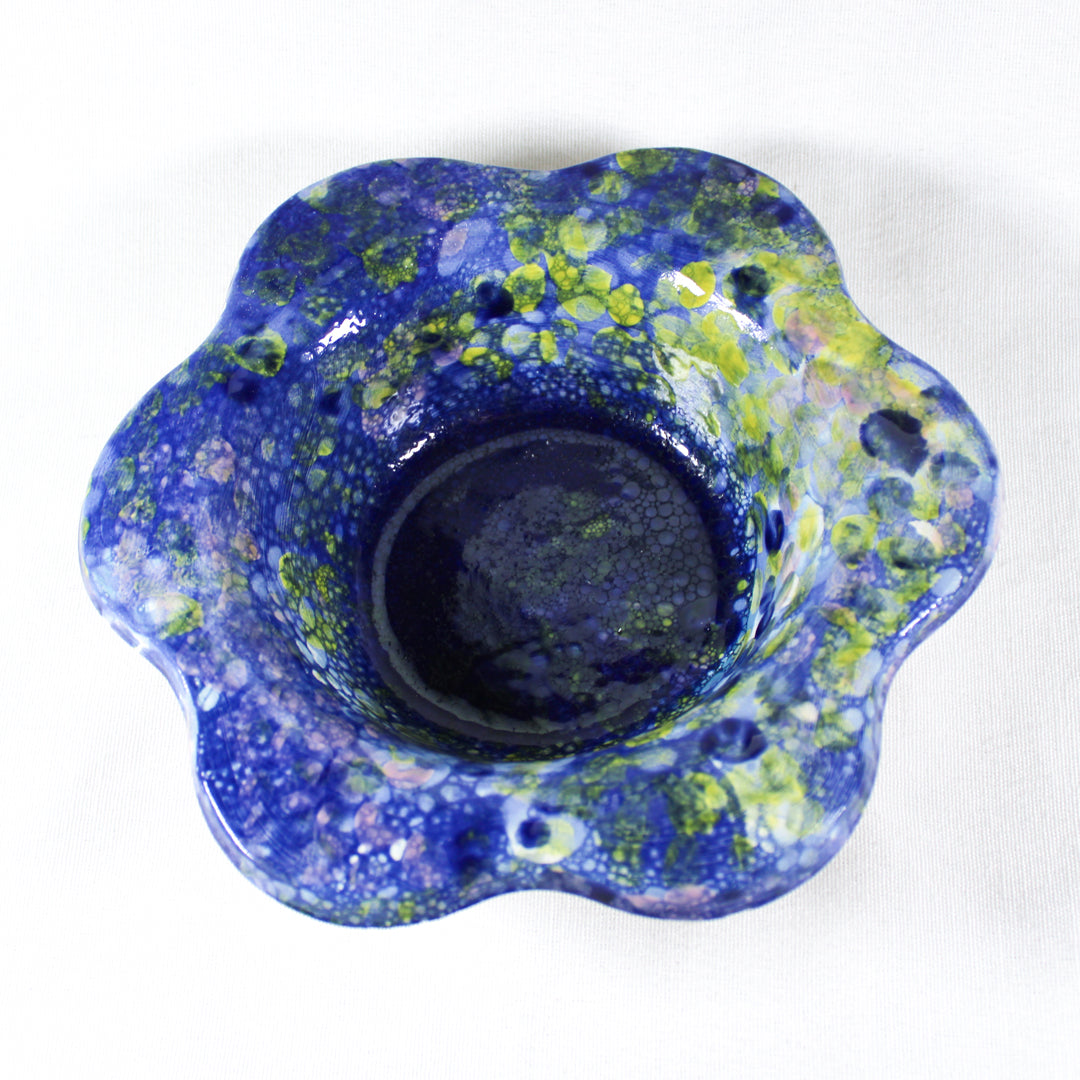 The Flower Bubble Bowl by Andrew Lipsitt is a captivating blend of artistry and functionality, perfect for adding a splash of creativity to any space. Its vibrant design features a deep, glossy blue base accented by striking green and yellow bubble-like patterns, creating an organic, fluid texture reminiscent of a blooming flower. The scalloped edges and handcrafted details enhance its visual appeal, making it an ideal centerpiece for your table or a unique vessel for serving or displaying small items. With its playful yet sophisticated aesthetic, this bowl is a testament to fine craftsmanship and imaginative design.