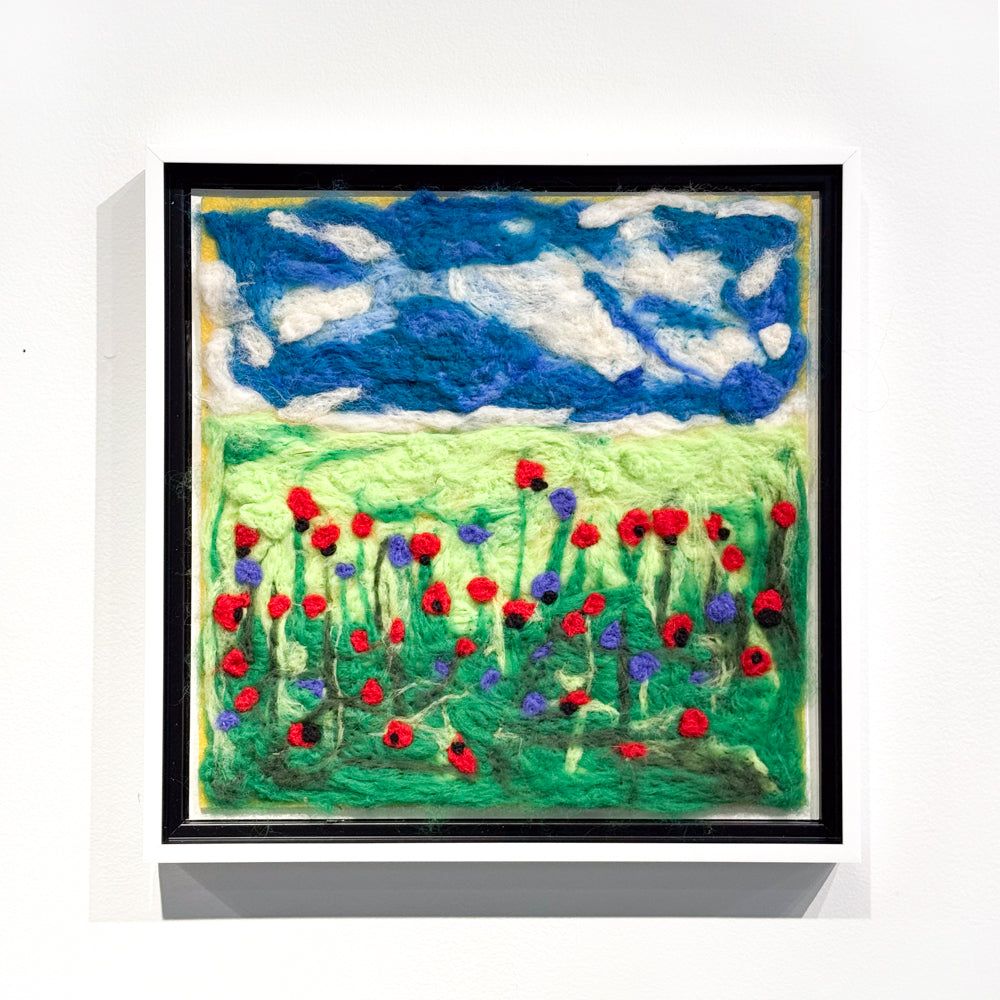 Flowers to Frolic In by Shira Schweitzer is a fun and colorful artwork made with soft wool. Bright red and purple flowers pop up from a green field under a deep blue sky with fluffy white clouds. The scene feels happy and full of life, like a perfect day to run through the grass and play. This piece brings the joy of nature to life in a warm and playful way.