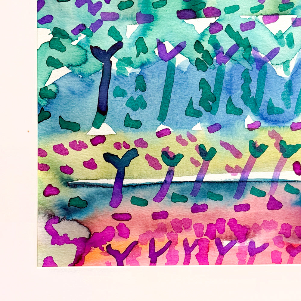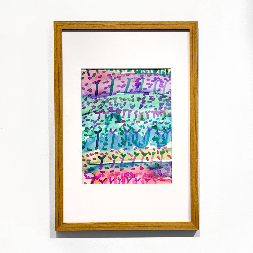 Forest by Nathan Colombo is a bright and playful watercolor painting filled with color and movement. Rows of trees in purple, green, and blue stretch across the page, giving the piece a fun rhythm and energy. This joyful forest scene shows Nathan’s love for patterns and nature.