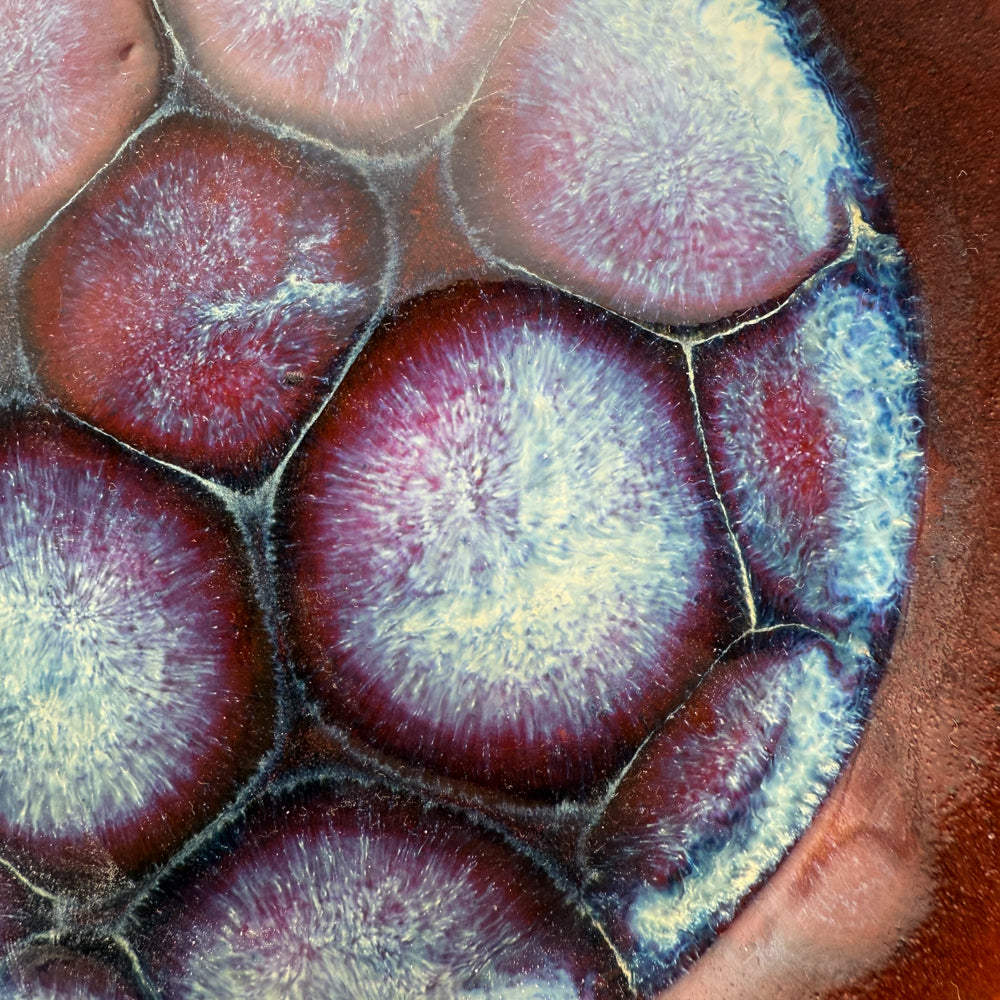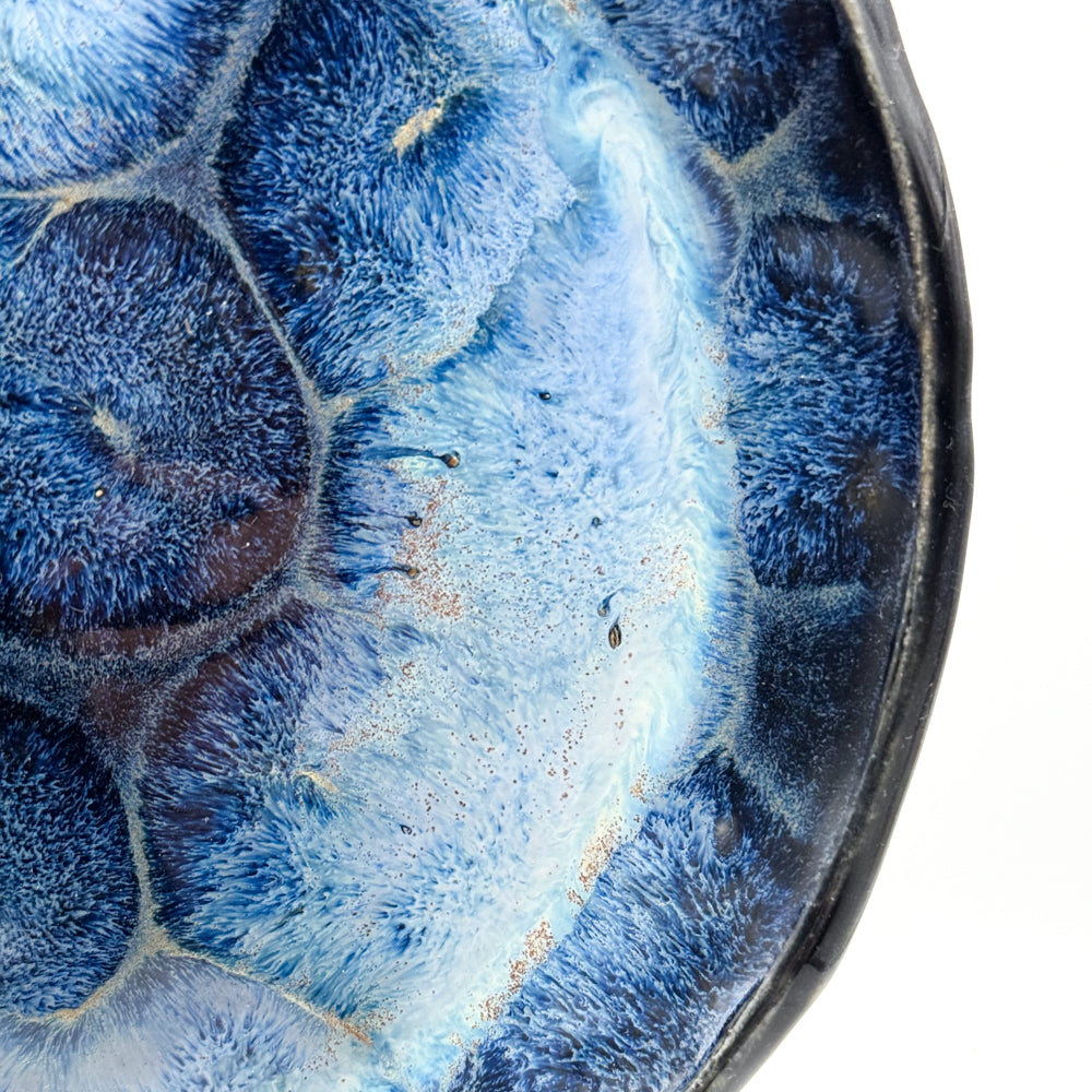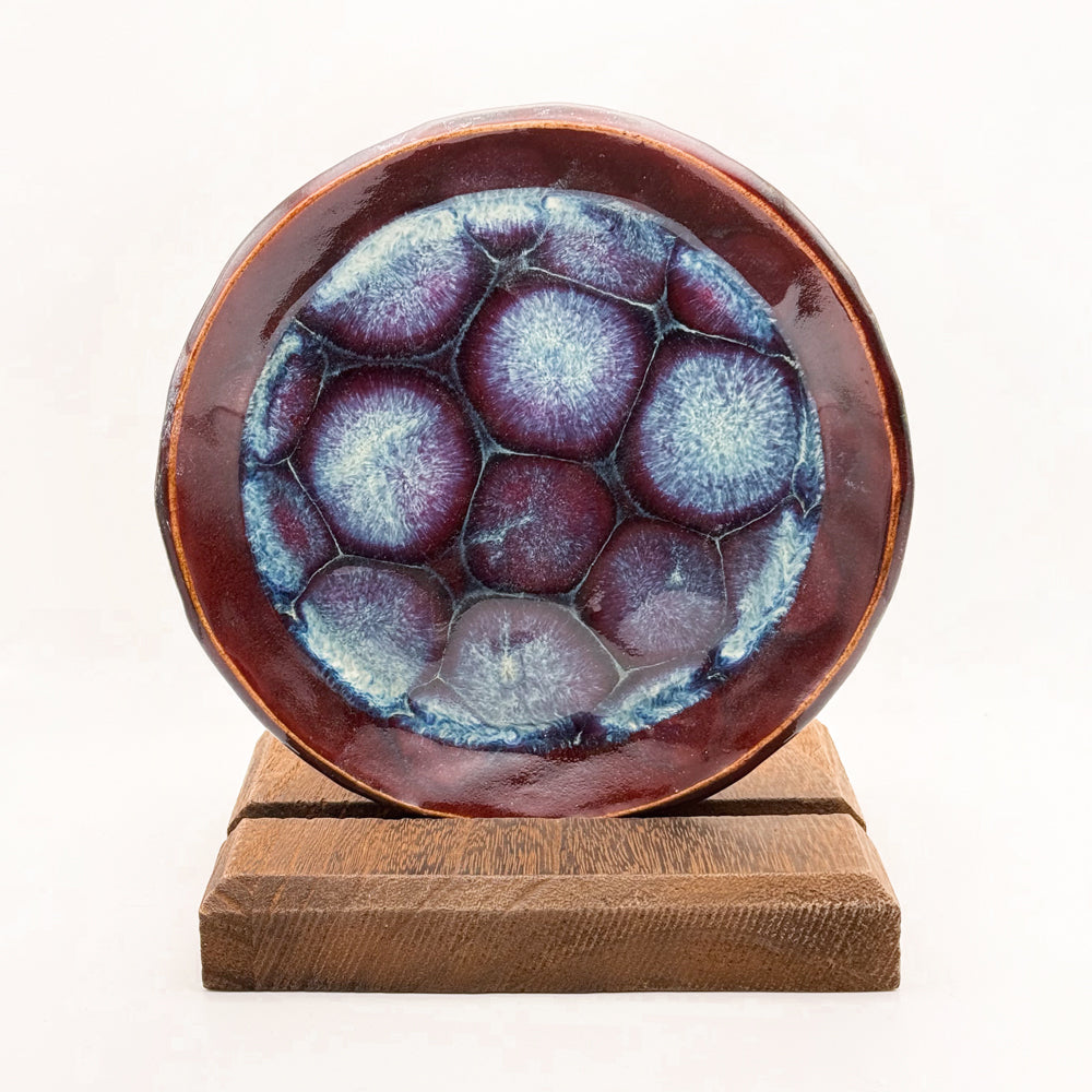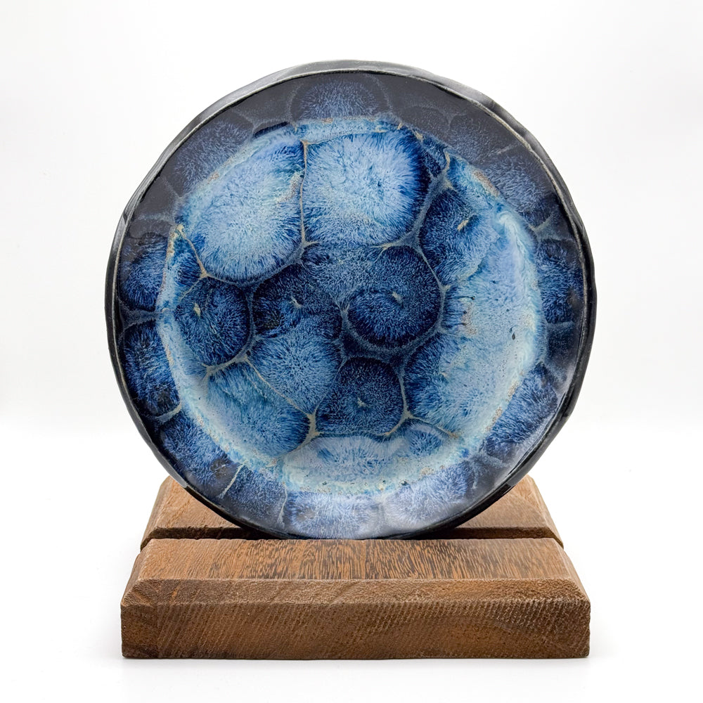 Frozen Pond Plate by Elizabeth Brinkerhoff is a ceramic plate covered in soft, icy blue and purple patterns. The surface is full of round, crystal-like shapes that look like frozen bubbles under ice. Smooth and glossy, this plate brings the peaceful feeling of a quiet winter day.