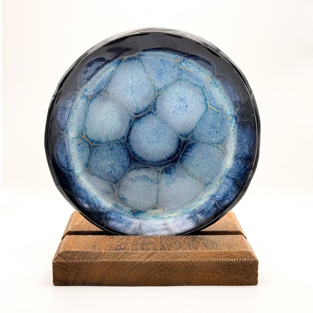 Frozen Pond Plate by Caity Woods is a ceramic plate covered in soft, icy blue and purple patterns. The surface is full of round, crystal-like shapes that look like frozen bubbles under ice. Smooth and glossy, this plate brings the peaceful feeling of a quiet winter day.