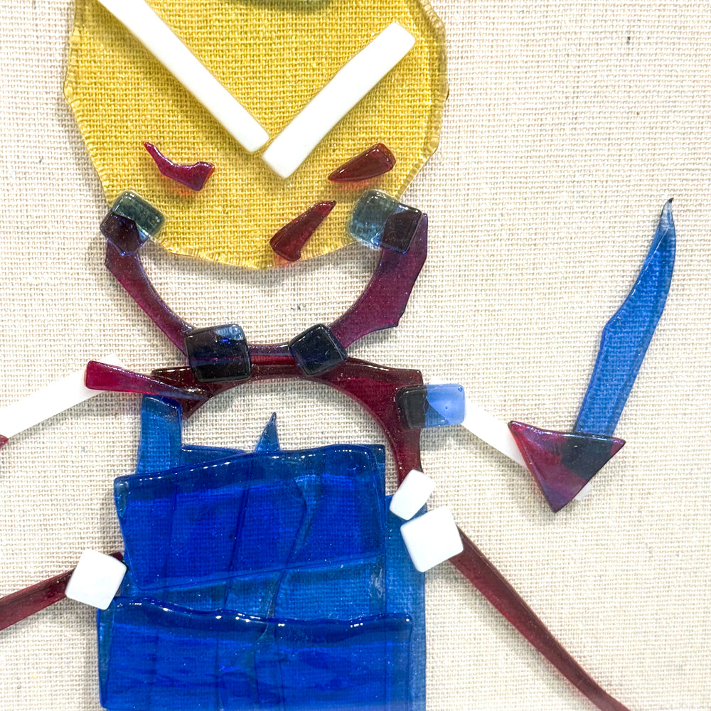 Glass Beetle by Macko Matlen is a colorful glass sculpture mounted inside a frame. The beetle is built from carefully placed pieces of glass in blue, red, yellow, and white. Each part of the beetle’s body is shaped with bold colors and sharp lines, giving it a strong and playful look.