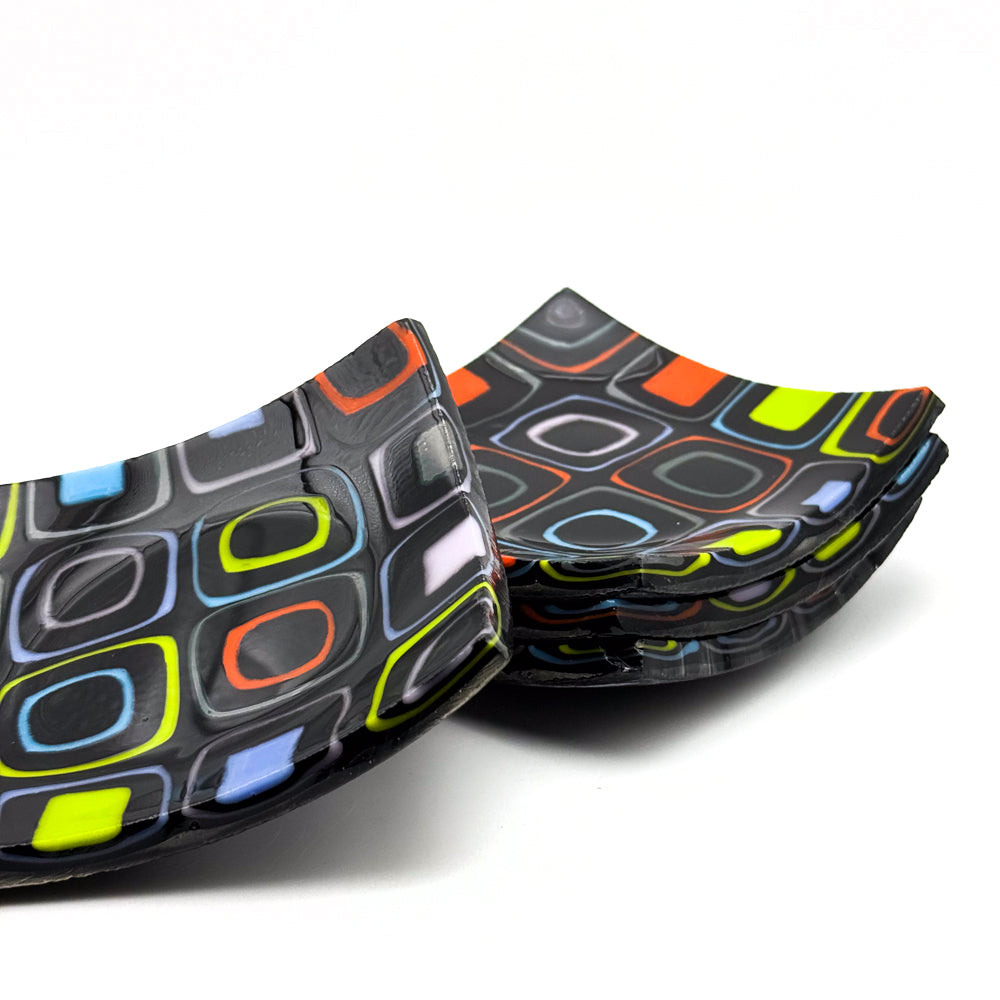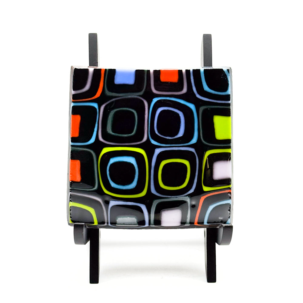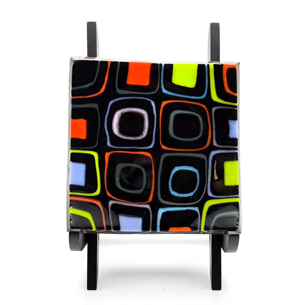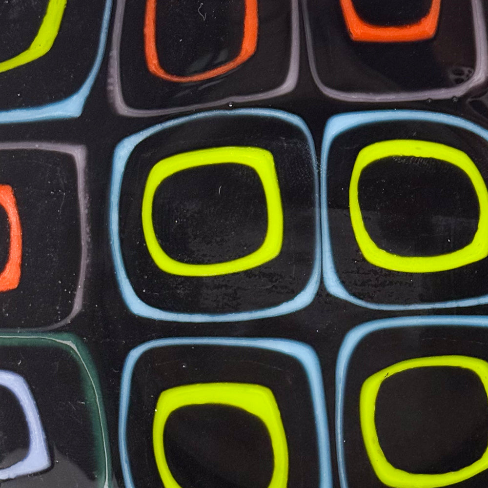 These glass trinket dishes by Mikayla Woodiwiss are full of bold color and pattern. The surface features a grid of rounded squares in bright orange, blue, and black, giving it a fun and modern look. Each dish is handmade, so no two are exactly the same and each one is sold individually. These dishes are perfect for holding jewelry, keys, or small keepsakes—or for adding a pop of color to any room.