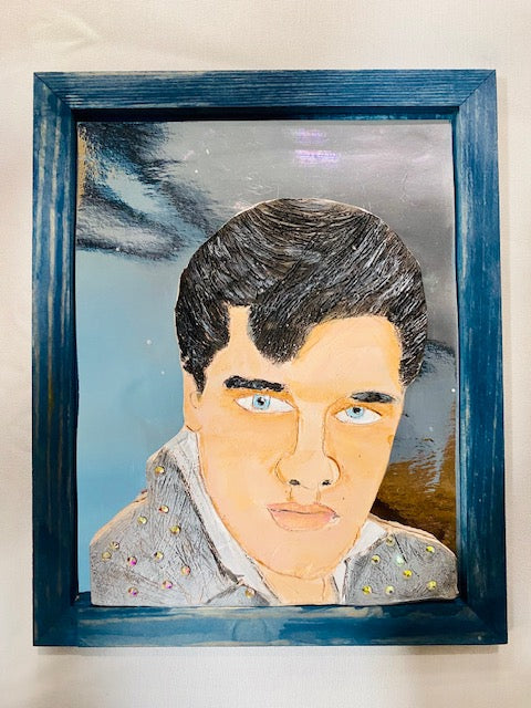 Step into the golden age of rock 'n' roll with Ashley Mungons' enchanting ceramic creation, "Golden Year." This masterpiece captures the timeless charisma of Elvis Presley, featuring his iconic visage adorned with a rhinestone-studded jacket that shimmers with opulent allure. Crafted with meticulous detail in ceramic clay and painted with rich acrylic hues, the portrait is mounted on a vibrant blue wooden frame, lending a touch of retro chic to any space. Backed with a reflective mylar mirror, this artwork not only celebrates the King of Rock's legendary status but also invites viewers to reflect upon his enduring influence and magnetic presence. Ready to grace your wall, "Golden Year" promises to be a radiant focal point in any collection, evoking the spirit of Elvis's golden era with every glance.