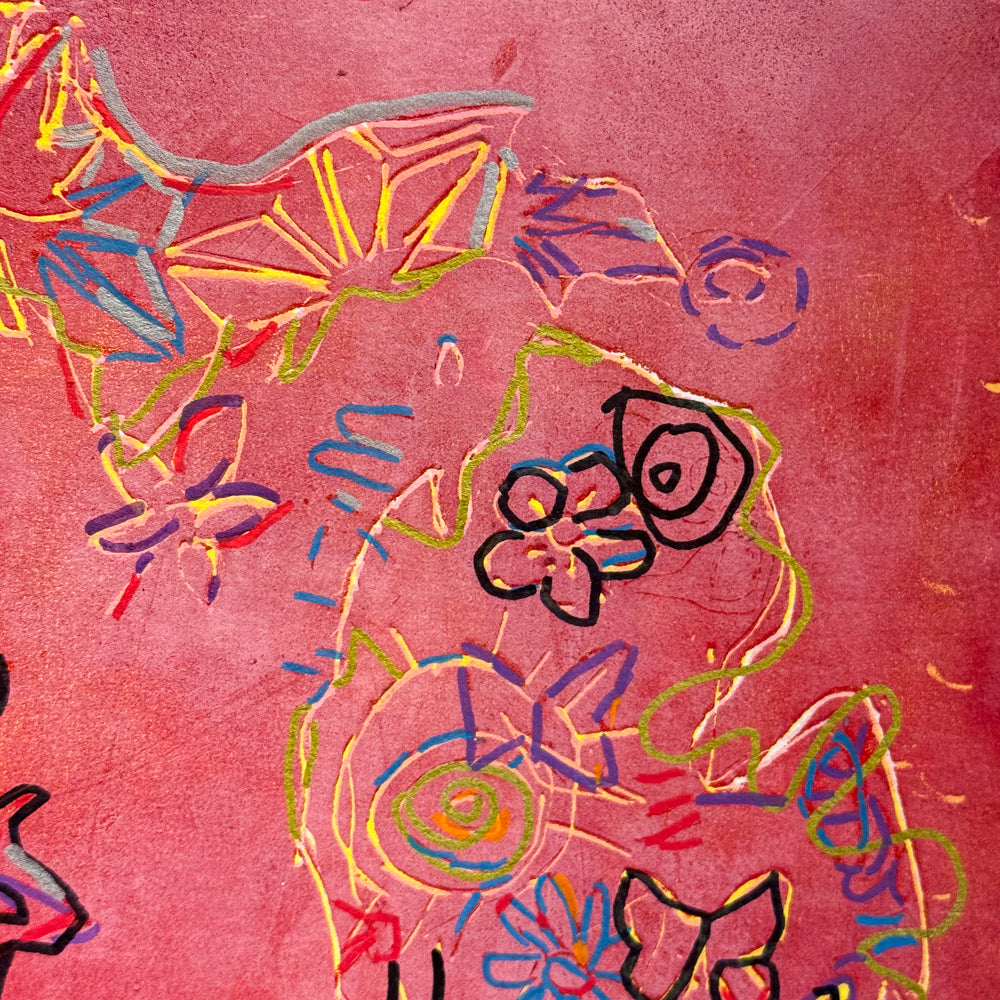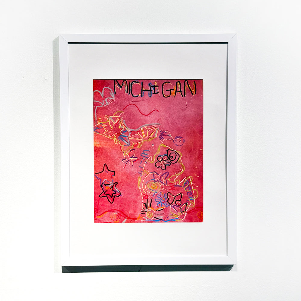 Happy Michigan by Carlie Suris is a cheerful print filled with bright lines and shapes. The outline of Michigan is decorated with flowers, butterflies, and spirals in rainbow colors, all set against a bold pink-red background. At the top, the word “MICHIGAN” is written playfully in colorful letters, adding to the joy of the piece.