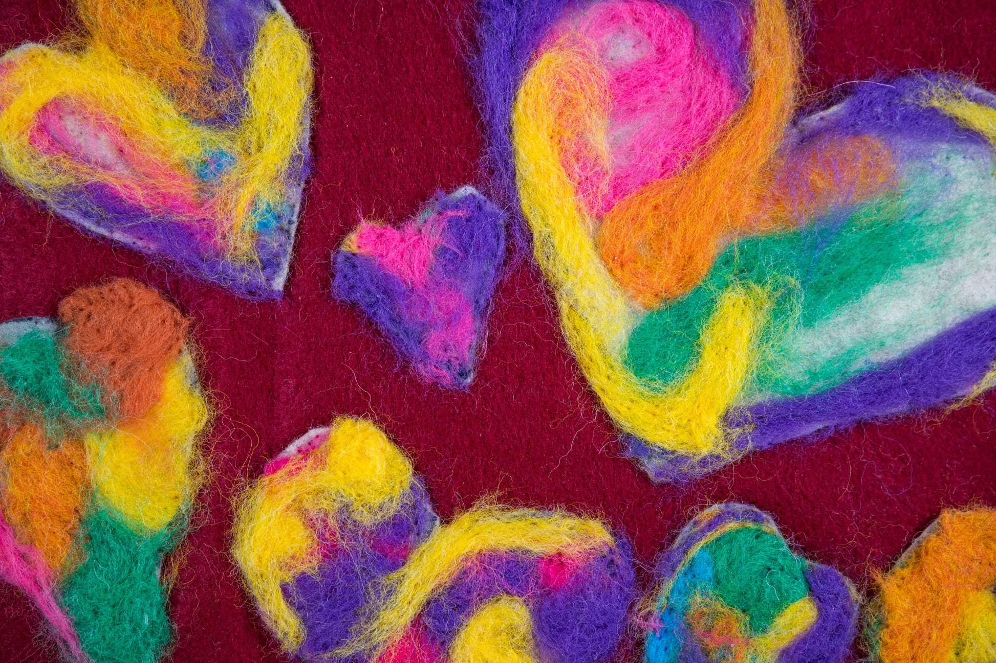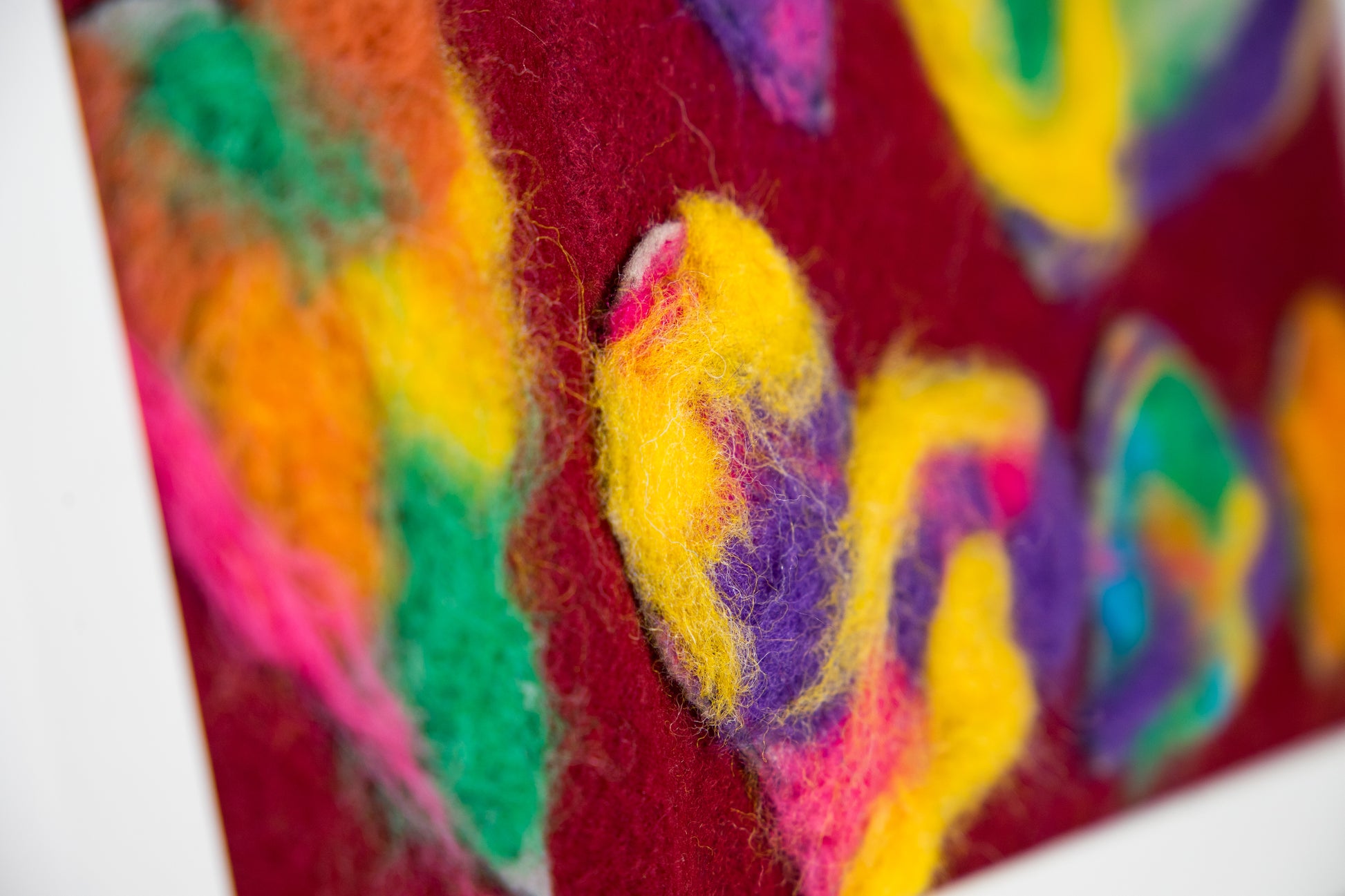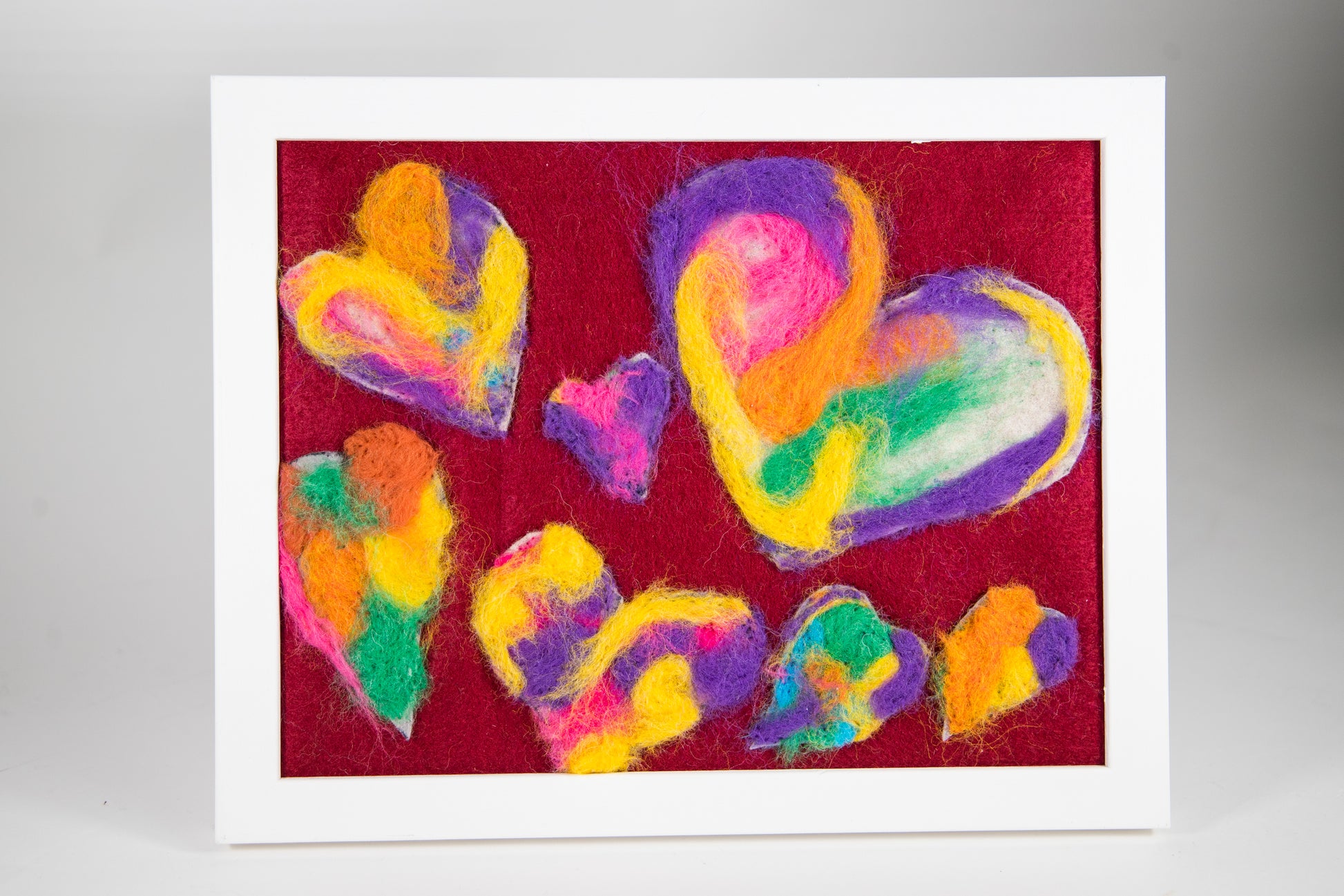 Heart Felt is a beautifully needle felted collage of colorful hearts that rings true to Winnie's signature art style. Many different sized hearts composed of multicolored wool almost tye-dyed together to create a lively, authentic composition over a deep red background.