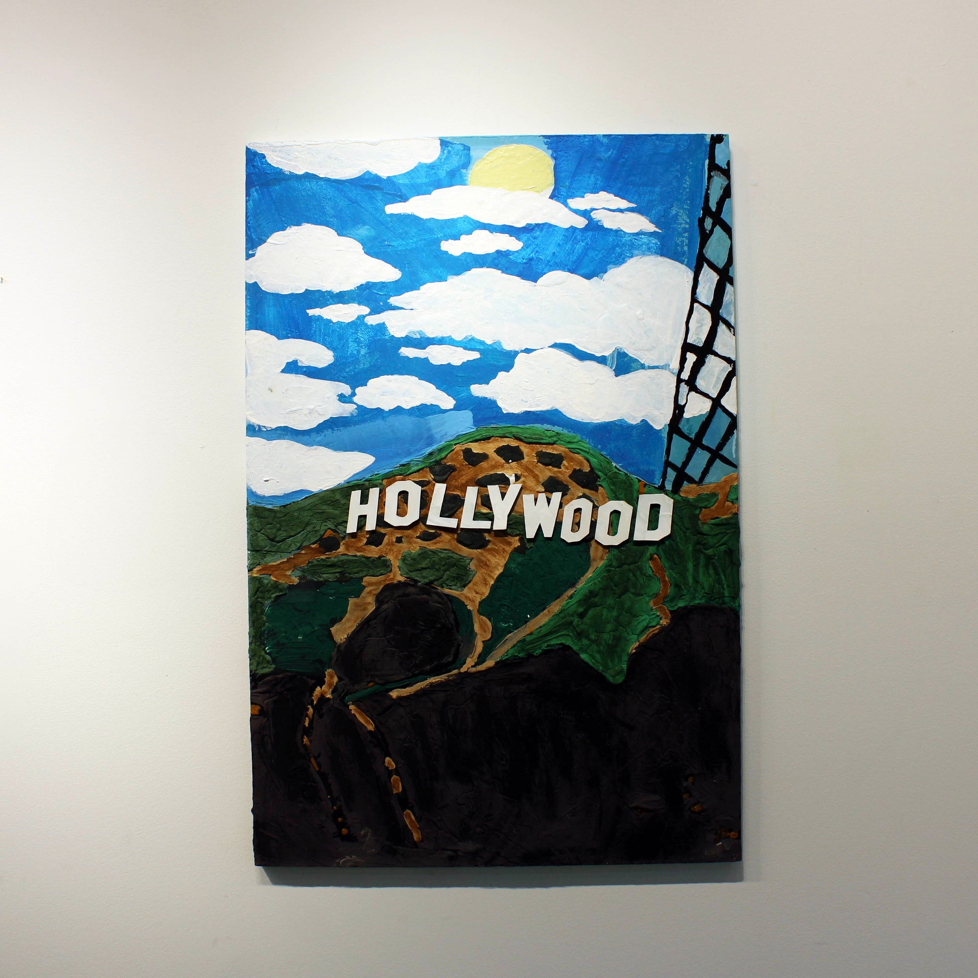 My painting of Hollywood Hills in Los Angeles features the radio antenna and famous Hollywood sign on a sunny day. I used acrylic paint and an acrylic medium for the three-dimensional parts, working from a reference photo. Inspired by my dream of moving to California and becoming a scriptwriter, I enjoyed creating the realistic sky and would love to paint on such a large scale again.