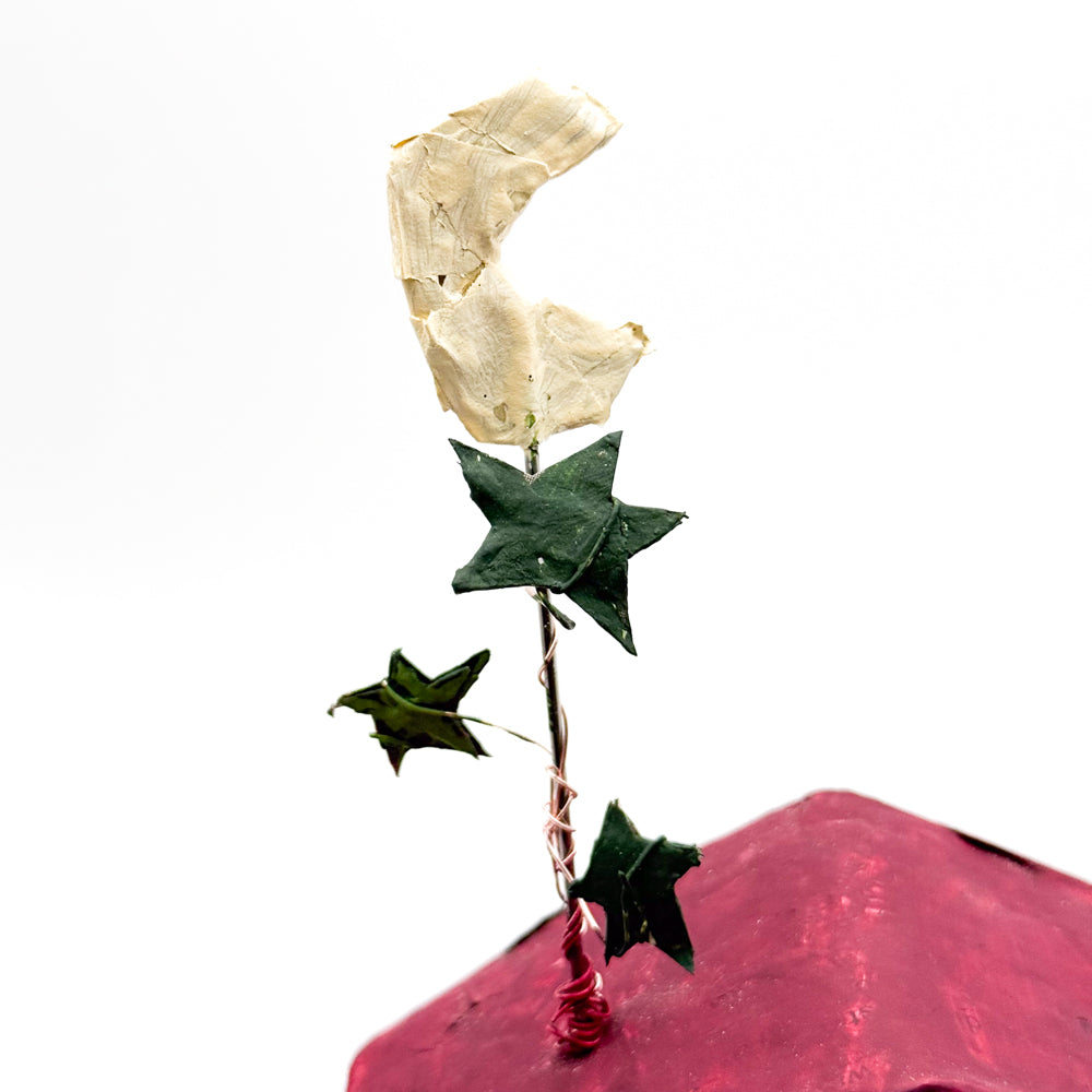 House in the Stars by Joseph Shammami is a whimsical sculpture of a bright blue house with a red roof and a silver door. Rising from the roof is a wire with green stars and a crescent moon floating above, like a little dream climbing into the sky. The piece feels magical and peaceful—like a tiny home nestled in the middle of the night sky.