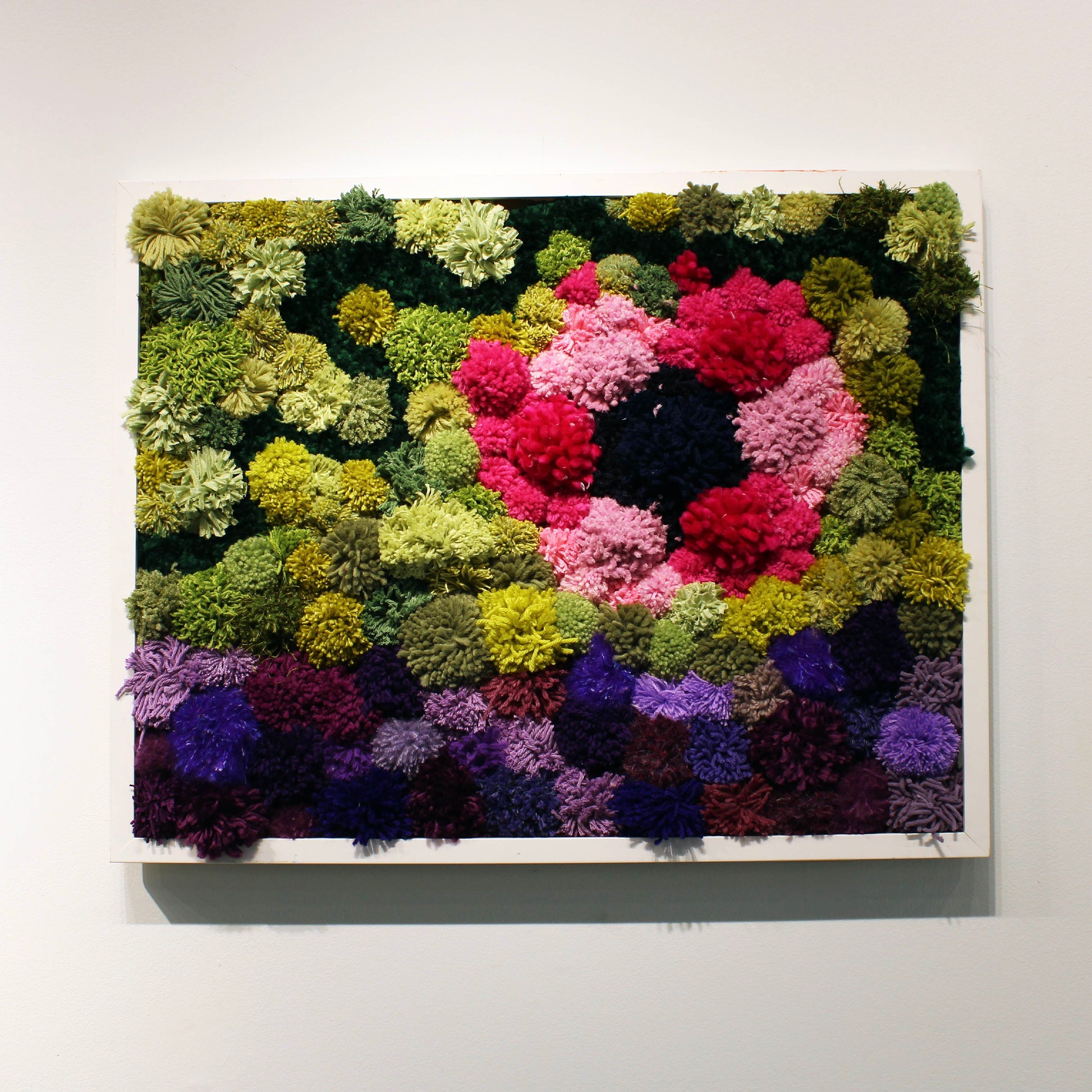"Into the Flower Field," a collaborative artwork by Tracy Nikolas and Jacob Barron, captures the essence of a blooming landscape with vibrant yarn pom poms. The central flower, surrounded by lush greens and purples, bursts with hues of pink and red, inviting viewers into the heart of this imaginative garden.