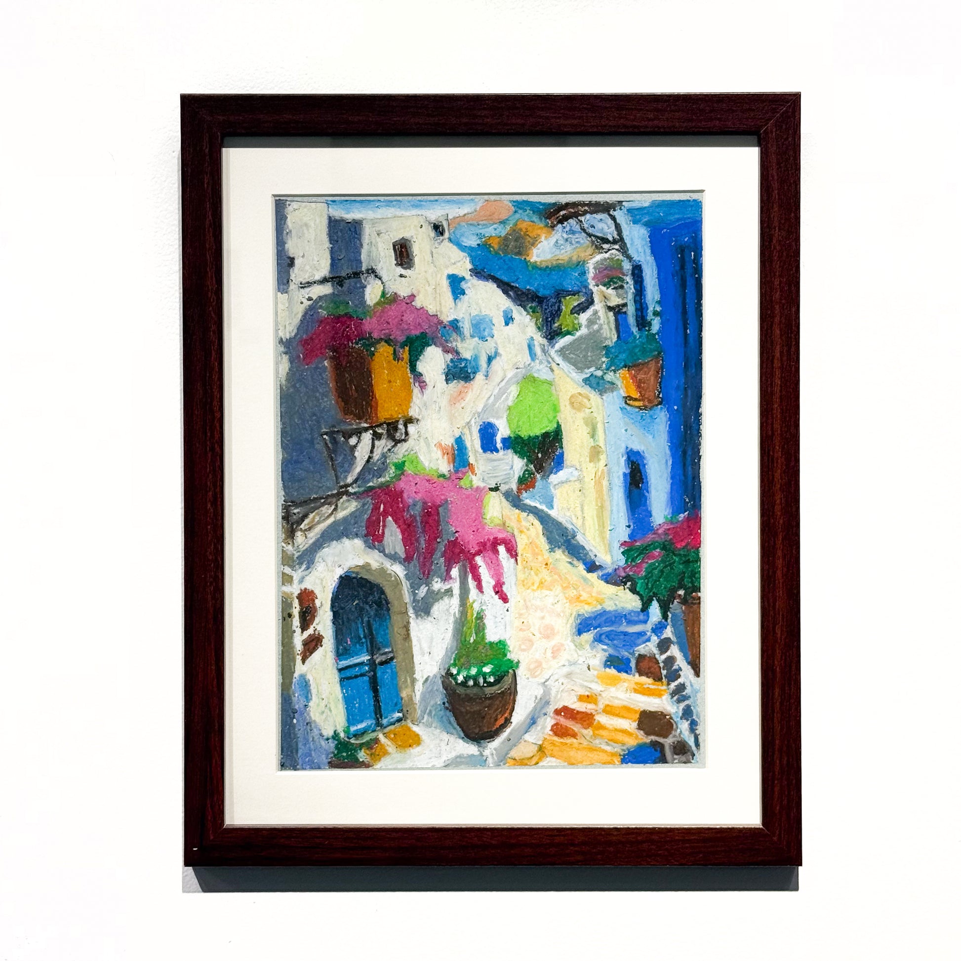 Italian Pathways by Mikayla Woodiwiss is a mixed media artwork showing a bright, winding street in a small Italian village. Colorful buildings, blue doors, and flower pots line the path as it curves through the scene. The layered textures and lively colors give the piece a cheerful feeling, like taking a walk through a beautiful place.