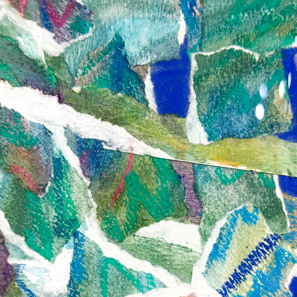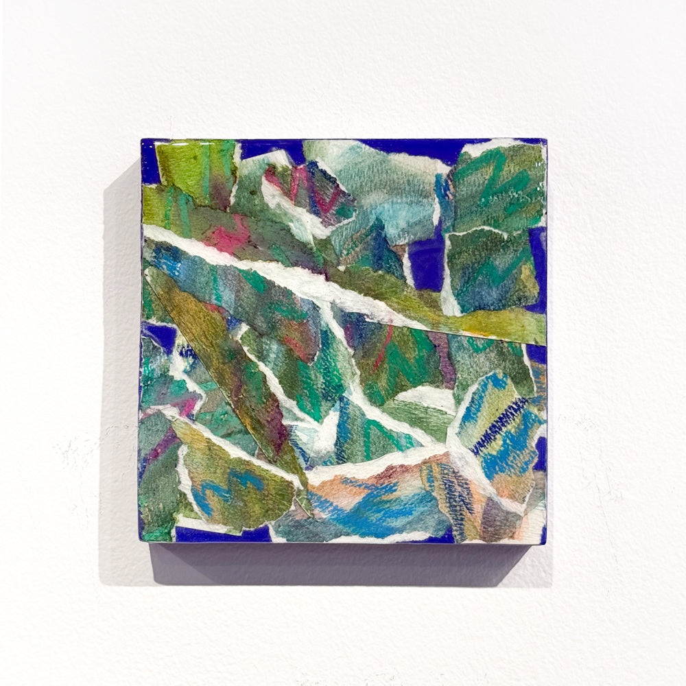Lake St. Clair by Shira Schweitzer is a colorful artwork made with cut and layered watercolor paper covered in resin. The shapes and patterns look like water, trees, and reflections, with greens, blues, and soft purples all mixed together. The piece feels like looking at nature near the lake—peaceful, beautiful, and full of movement.