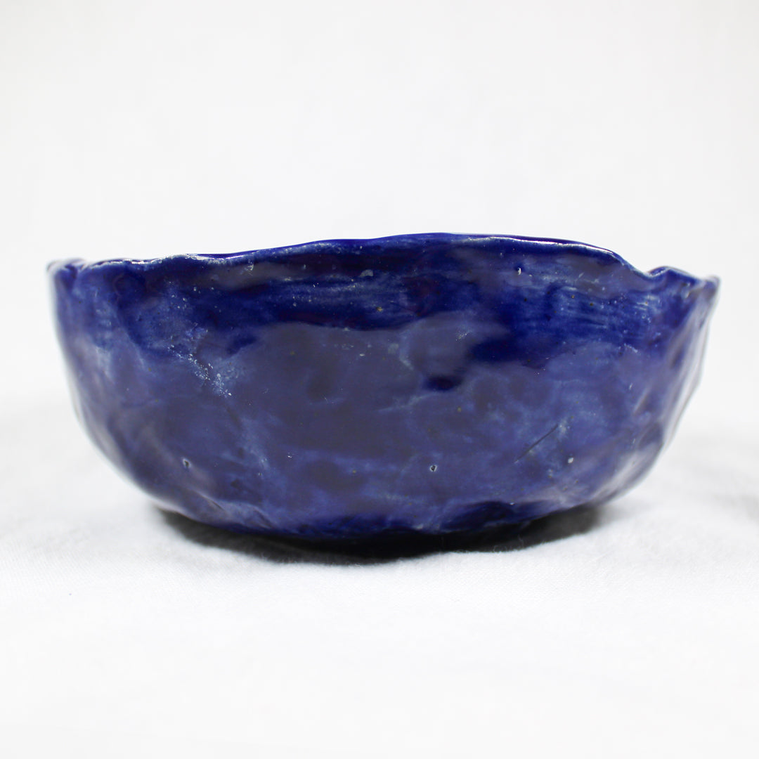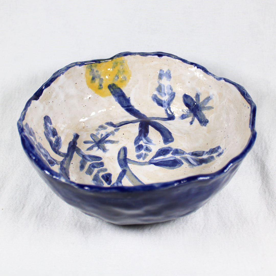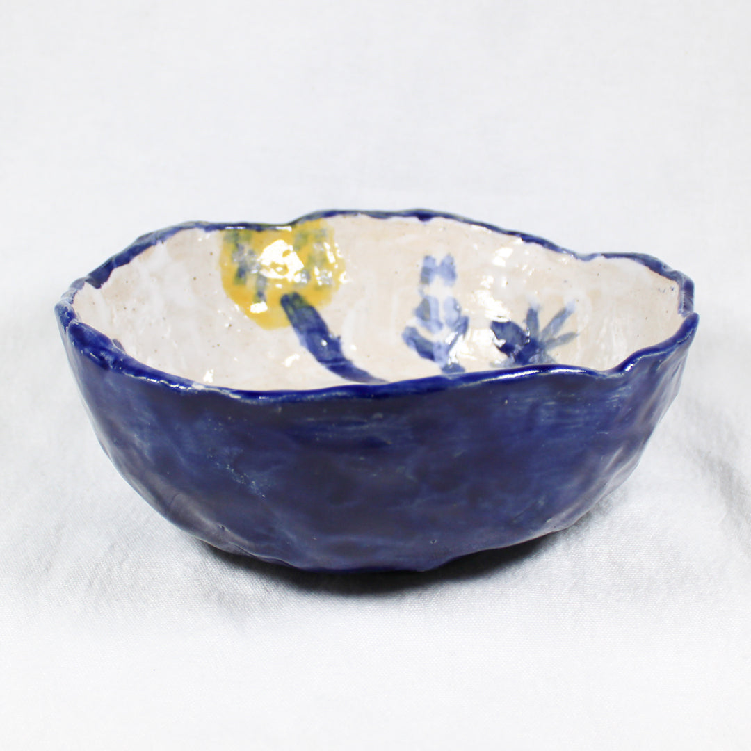 The Lemon Bowl by Matthew Schwab is a hand-crafted ceramic piece, reflecting a charming, organic aesthetic with its gently irregular shape. The deep blue exterior contrasts beautifully with the light, natural glaze of the interior, which features minimalist hand-painted lemon motifs in yellow and blue. This bowl is both decorative and functional, ideal for serving or displaying items while adding an artisanal touch to any space. Its unique form and textured finish celebrate the handmade process, making each bowl a one-of-a-kind creation.
