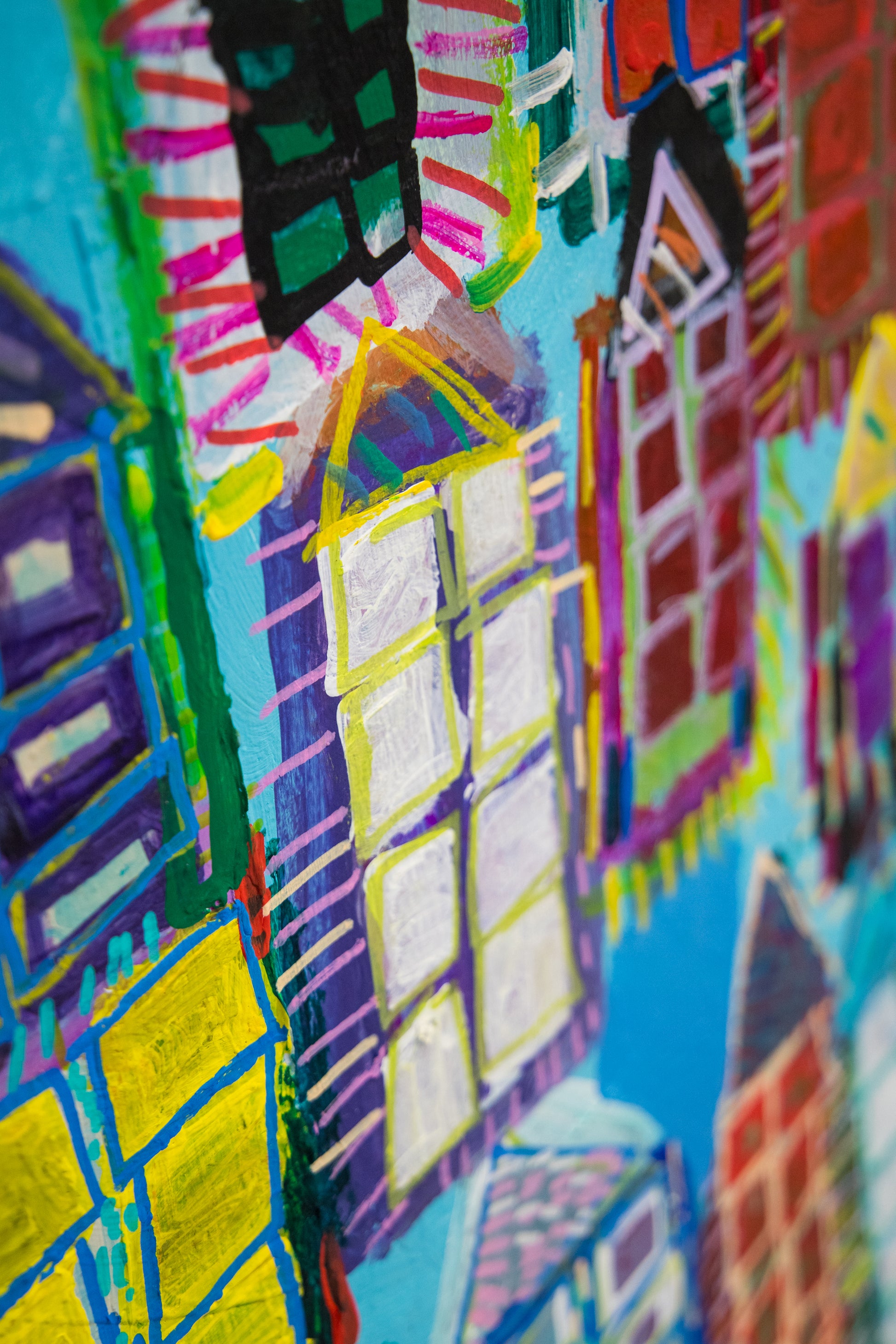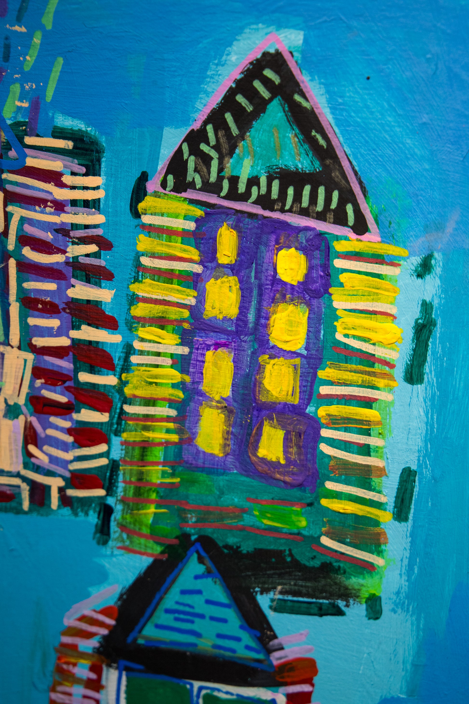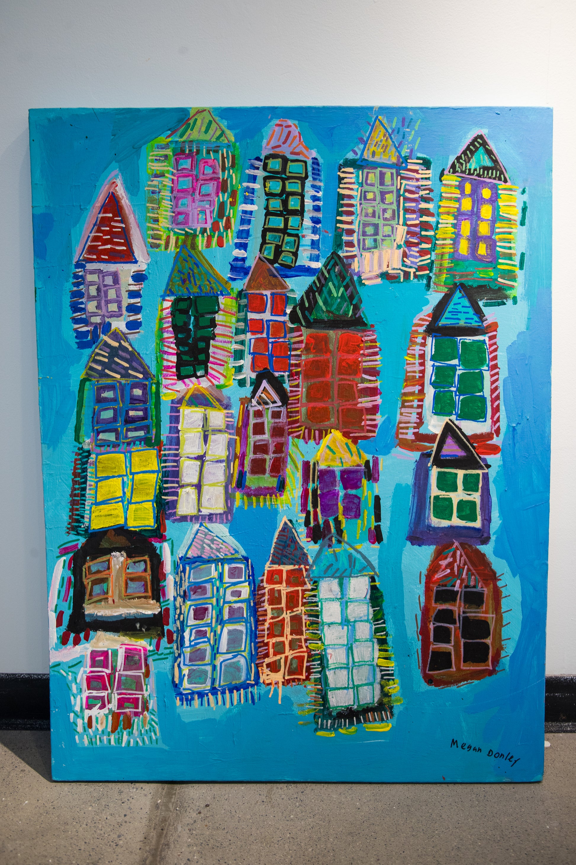 Explore the Happy Houses Series with Light Blue Neighborhood by Megan Donley. Through her paintings of her neighborhood, Donley captures the joy and beauty of everyday homes. This piece, titled Light Blue Neighborhood, celebrates the happiness and charm of the community.
