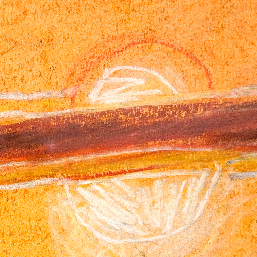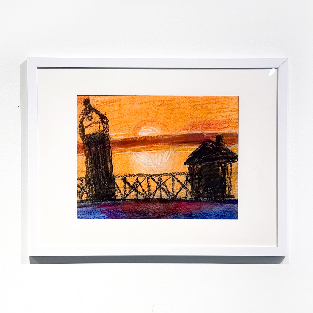 Lighthouse Sunset by Maya Bartholomew is a warm and glowing tribute to Michigan’s coastal beauty. With rich orange and golden tones filling the sky, the setting sun casts a peaceful light over a silhouetted lighthouse and keeper’s house. The bold lines and textured layers give the piece a sense of depth and quiet strength, capturing the calm and comfort of watching day turn to night by the water’s edge.