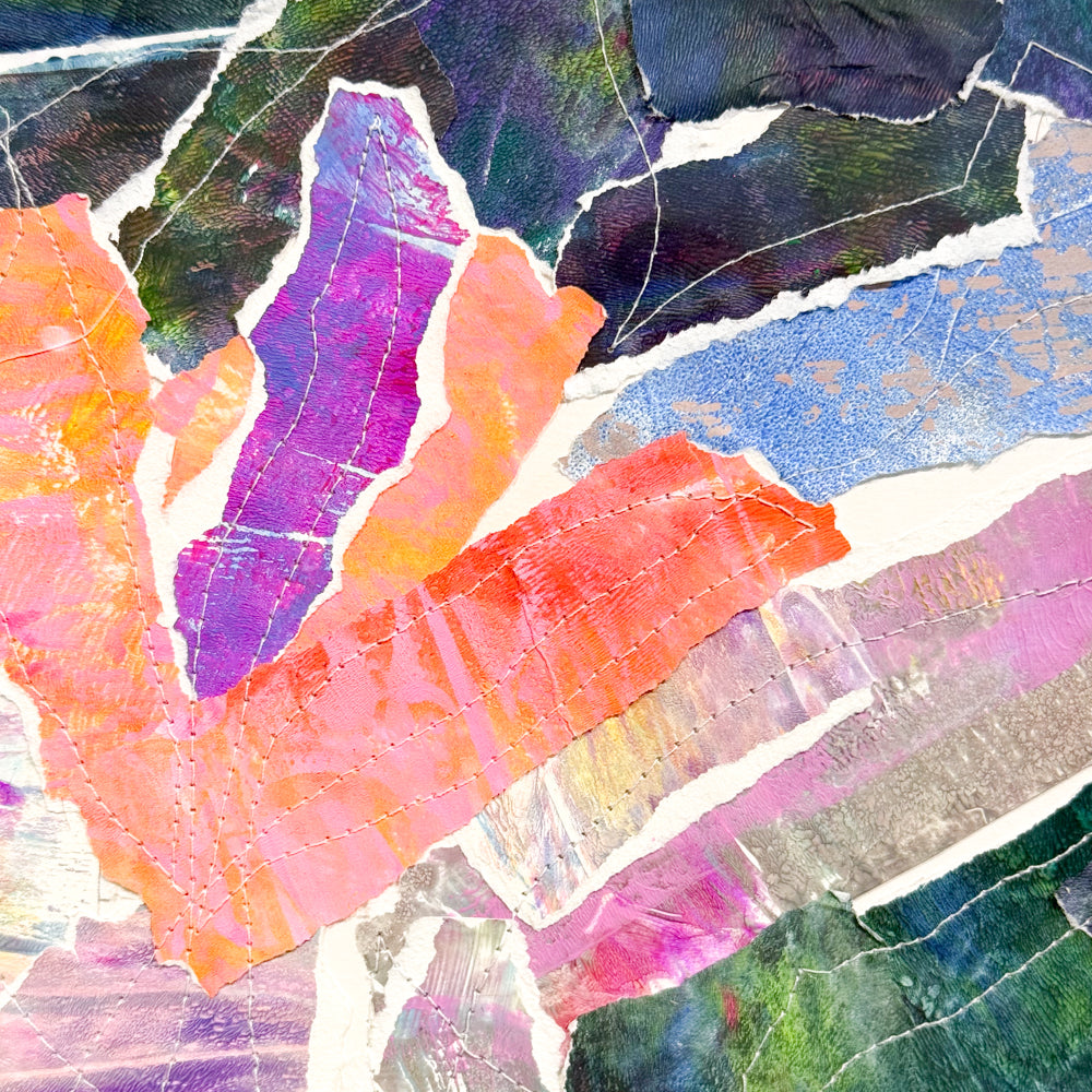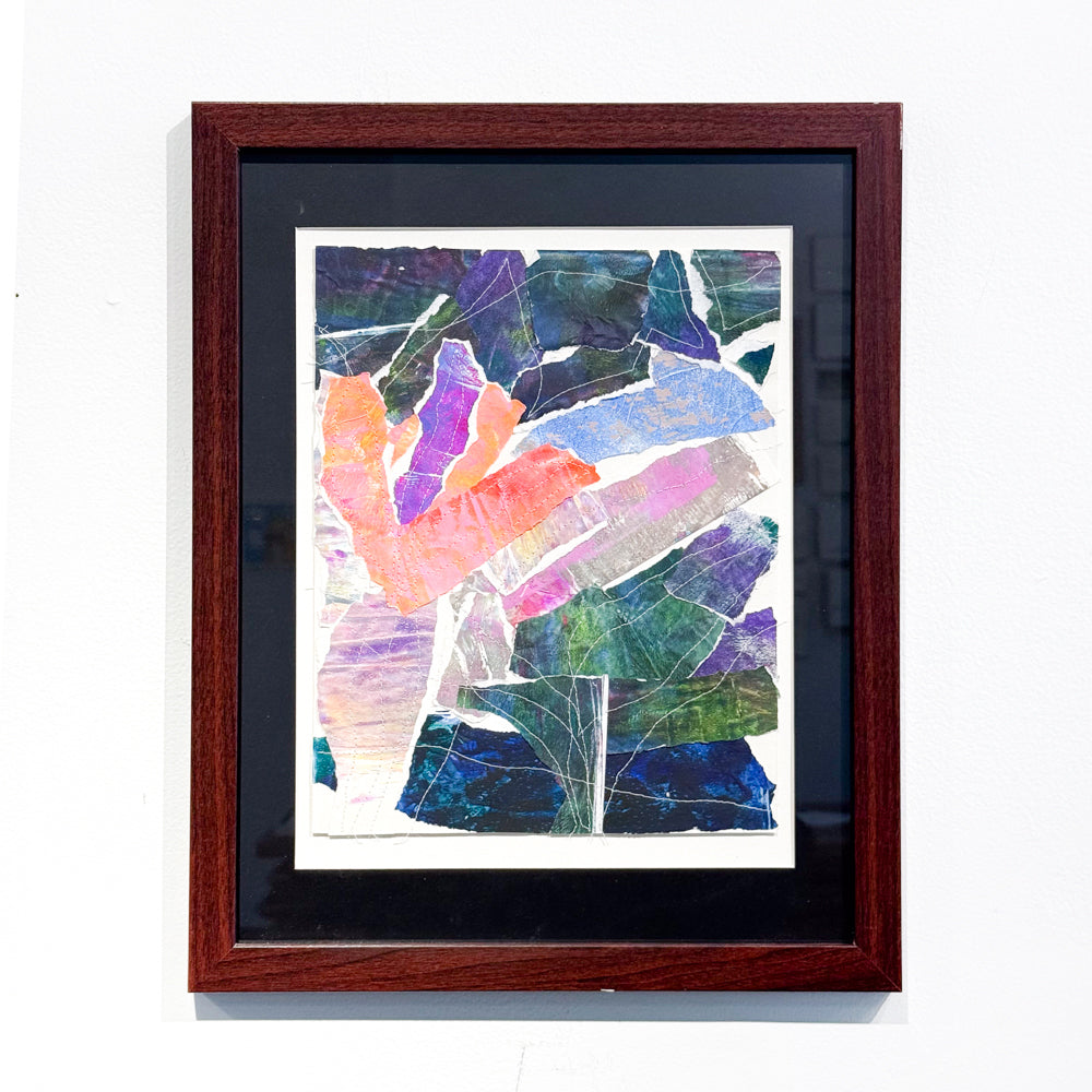 Lily in the Forest by Megan Donnely is a colorful collage. Bright pieces of pink, orange, and purple form a flower that looks like a lily, standing out against dark green and blue shapes that look like a forest. The mix of colors and textures makes the flower shine, like a beautiful surprise in the woods.