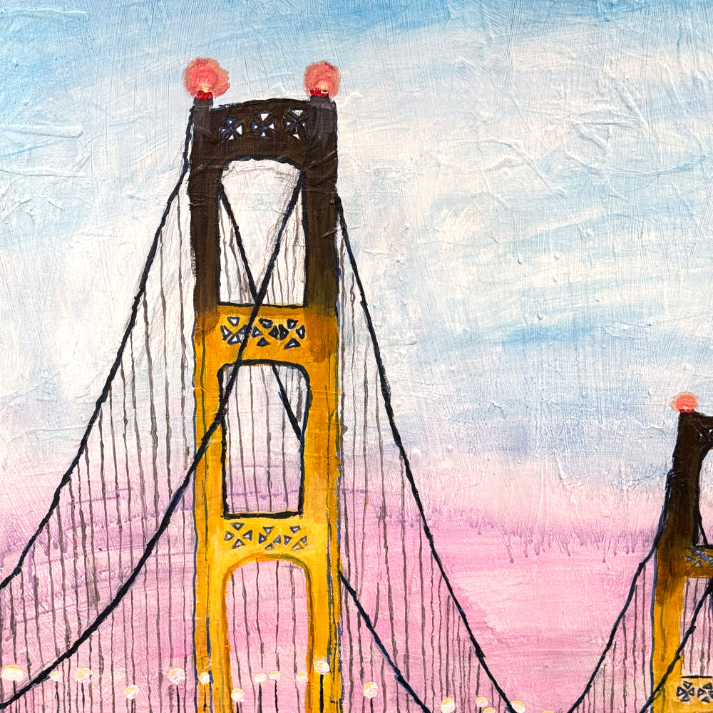 Titled Mackinac Bridge, this painting by Ashley Mungeons beautifully captures one of Michigan’s most iconic landmarks at sunset. The towering yellow bridge stands proudly against a soft sky of pink and blue, its lights twinkling as day turns to night. With textured brushwork and bold color contrasts, the piece evokes a sense of wonder and calm, paying tribute to the strength and beauty of this beloved Great Lakes crossing.